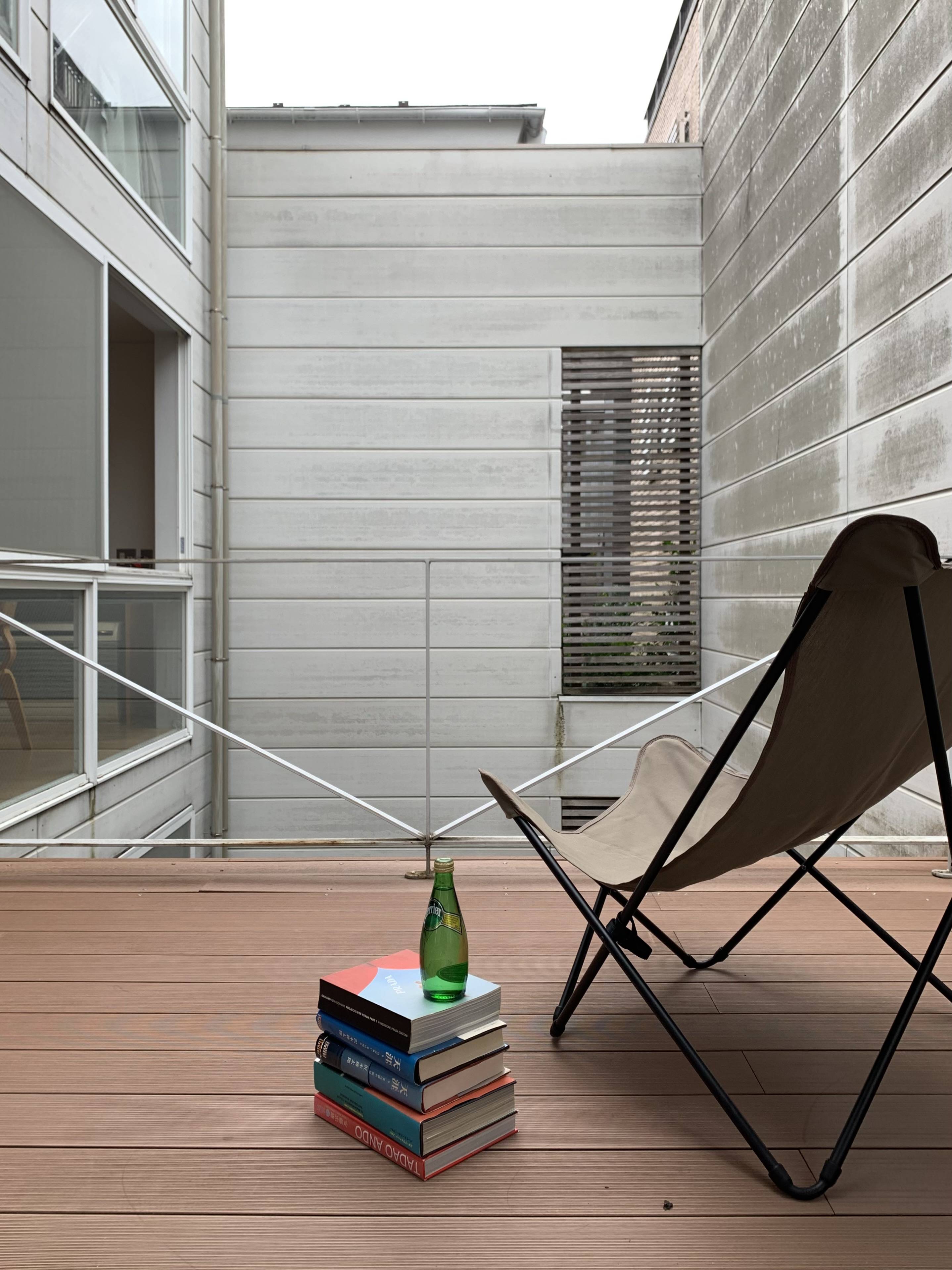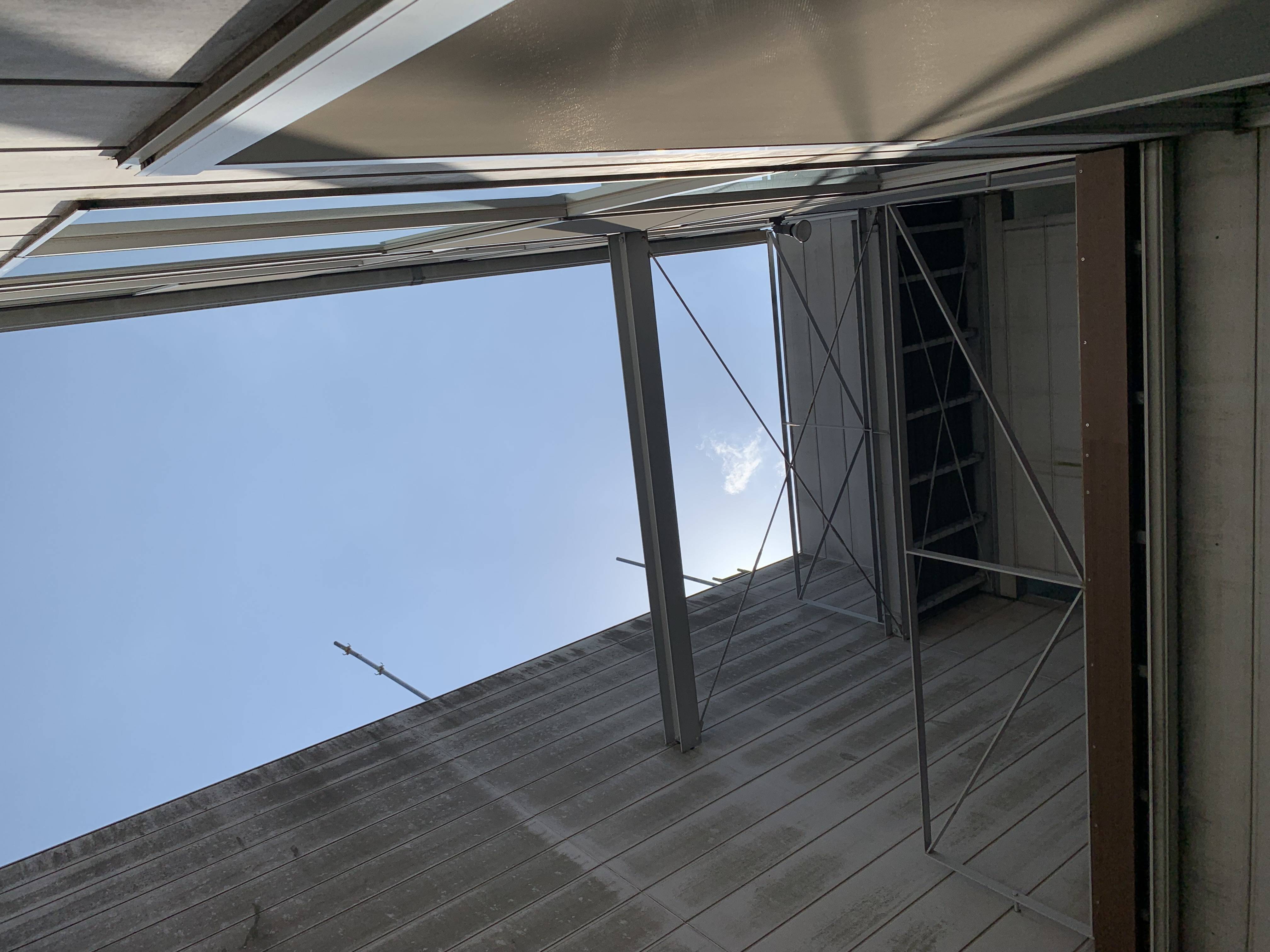 三層吹き抜けの中庭を囲む壁は、天空の光の反射板として、季節や時間の変化を光で感じさせてくれ、建込んだ近隣の合間を抜けてくる風は、木格子から中庭テラスを介し内部空間の反対側まで通り抜けていく。