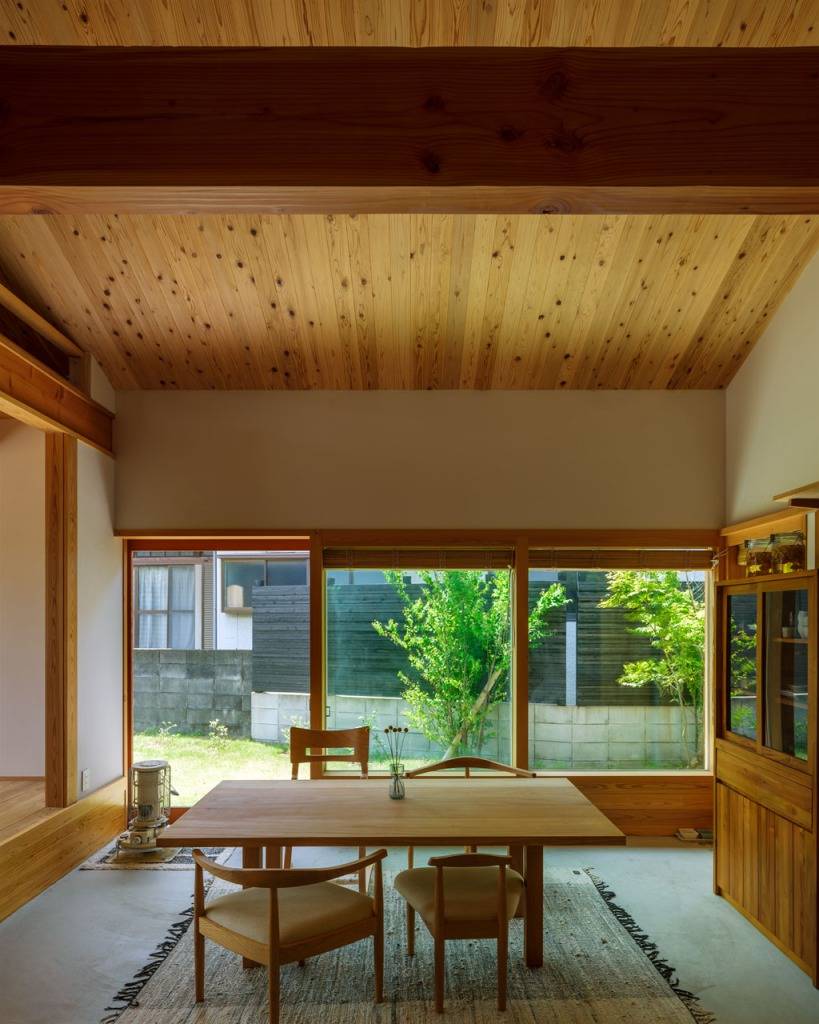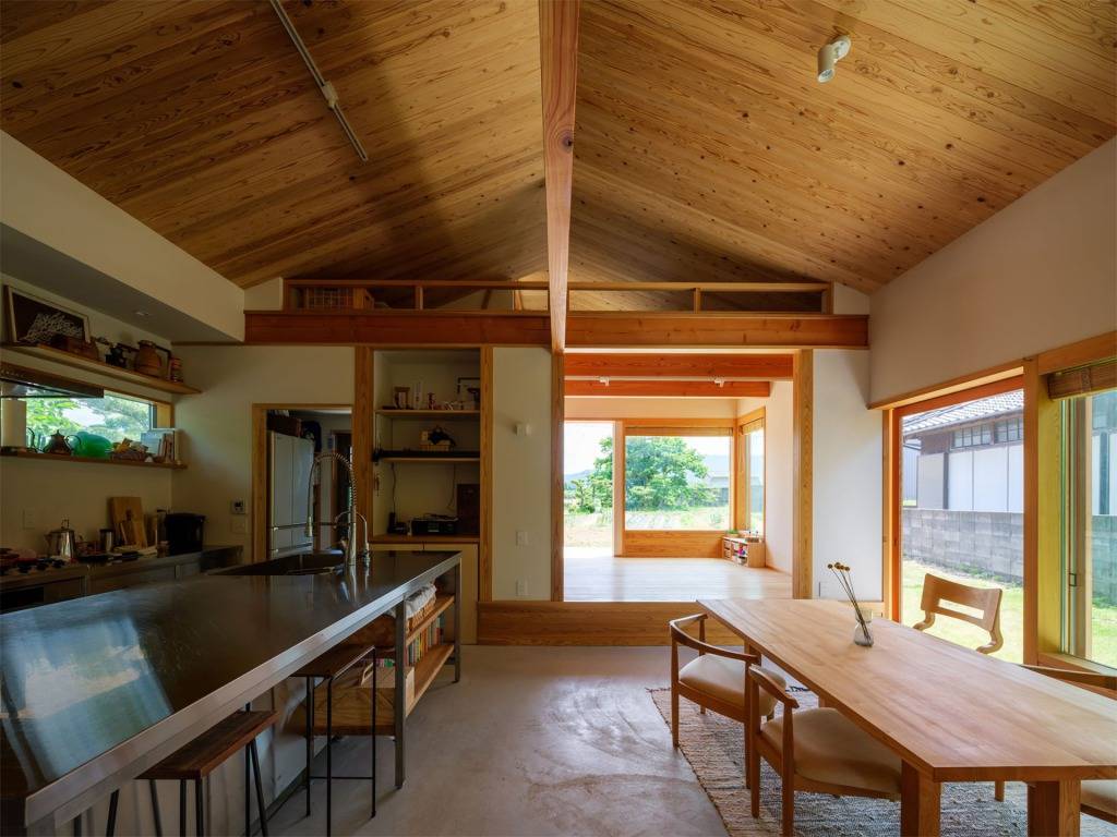 シンプルな切妻屋根を基本とし深い軒の出をから生まれた軒下空間が、
