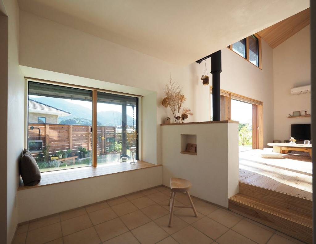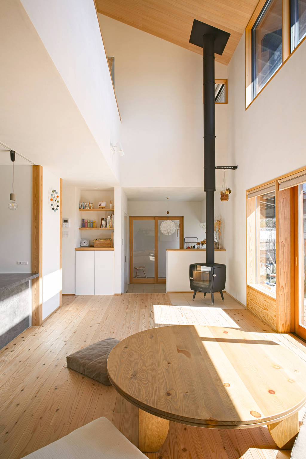 仕上げは床に杉板のフローリング、壁に珪藻土、天井にアルダー板貼りなど自然素材を積極的に使用しています。冬は薪ストーブで暖をとり吹き抜けを介して暖気が家中を巡ります。