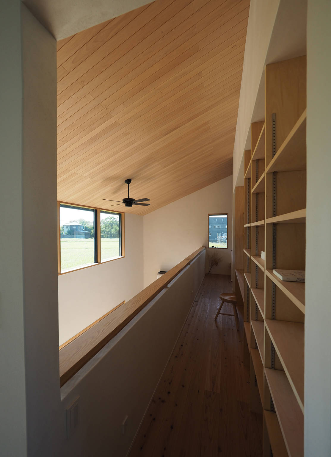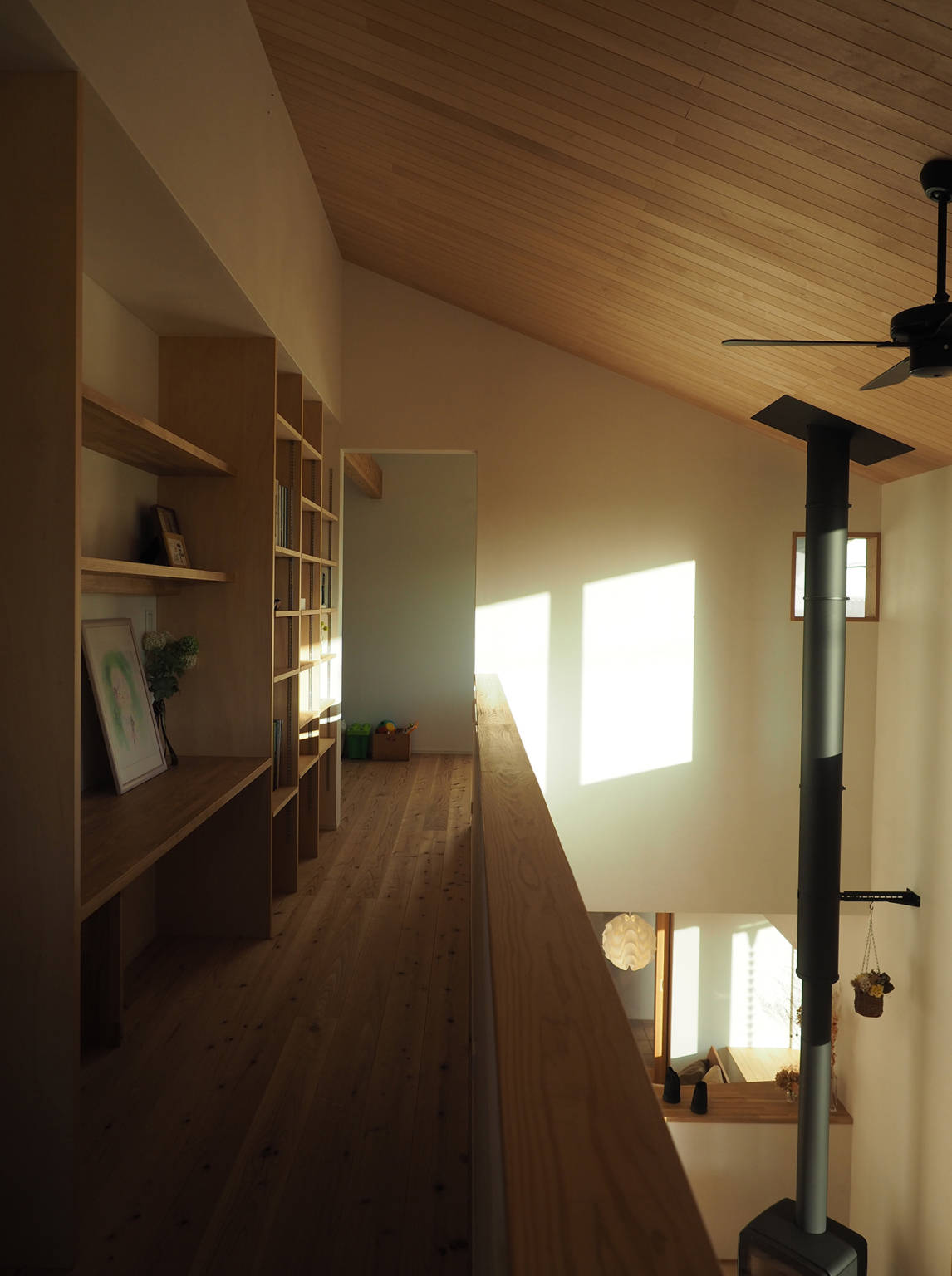 吹き抜けと繋がる2階は落ち着いた主寝室と開放的な子供室。