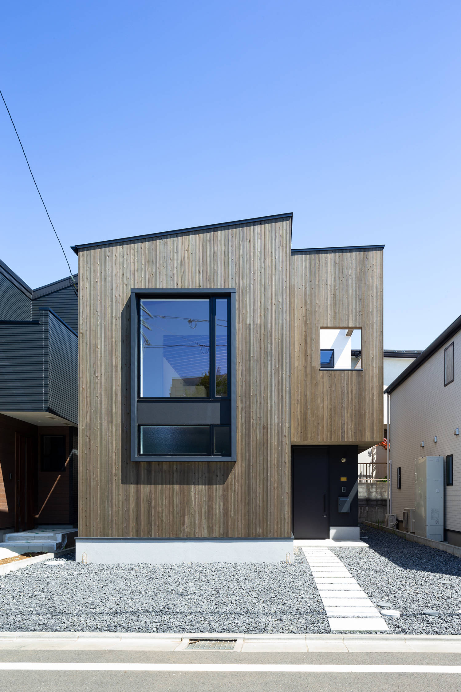 外壁は周辺の緑と呼応するように、経年変化を楽しめるように目地加工した杉板貼り。