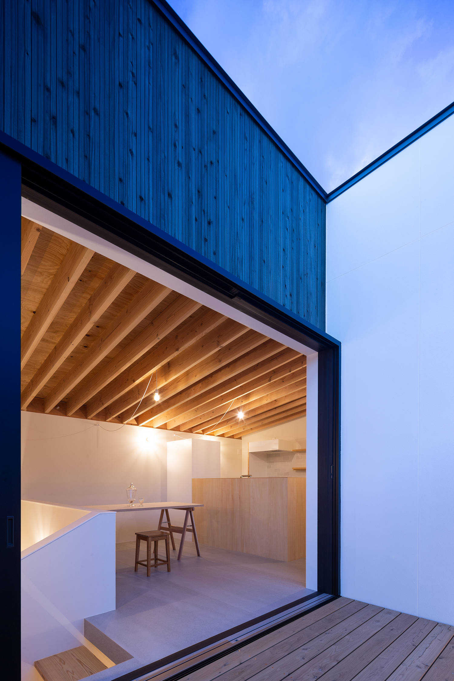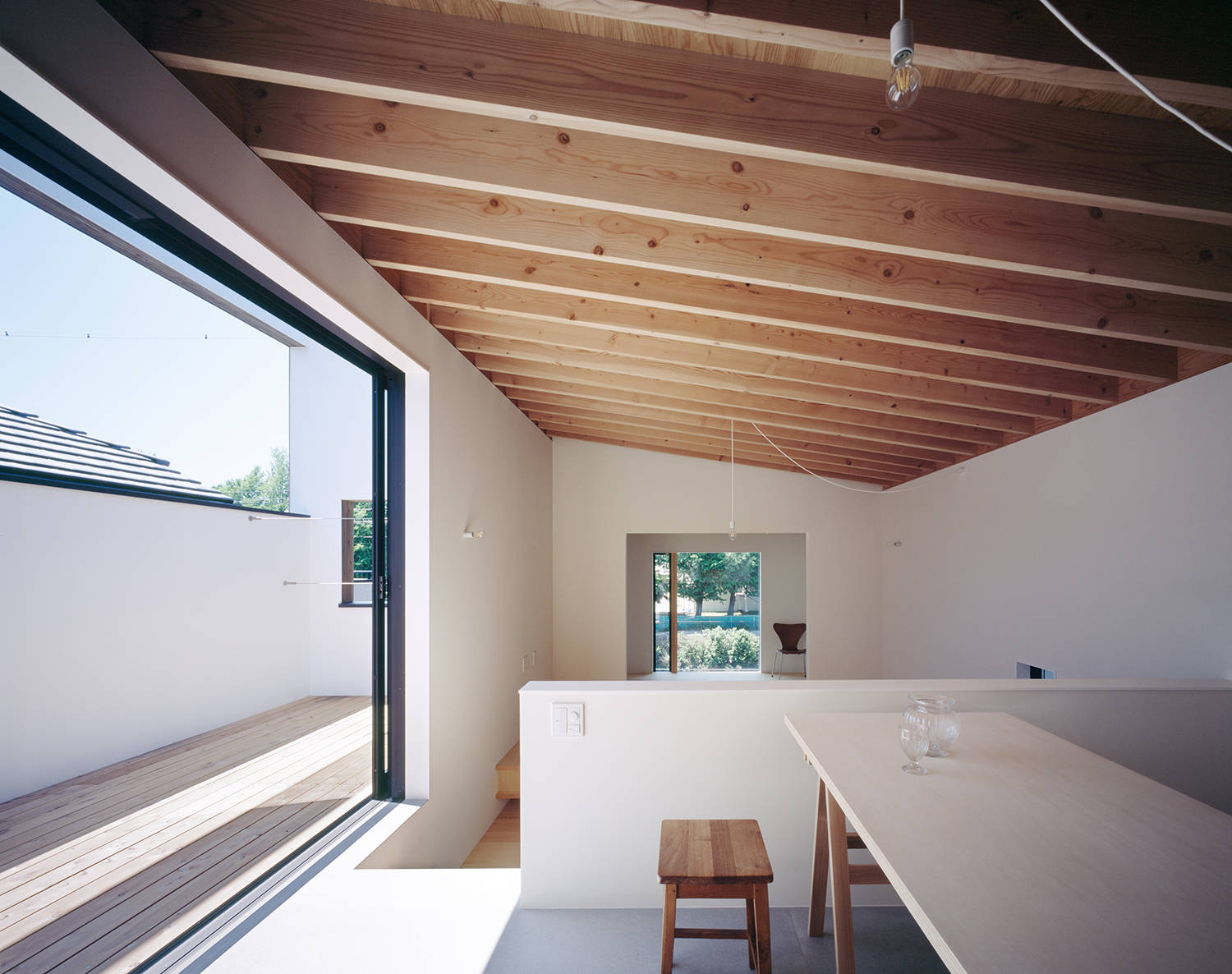 また、床レベルに変化をつけ、表しの化粧垂木とすることで、空間にリズムが生まれるように意図しています。
