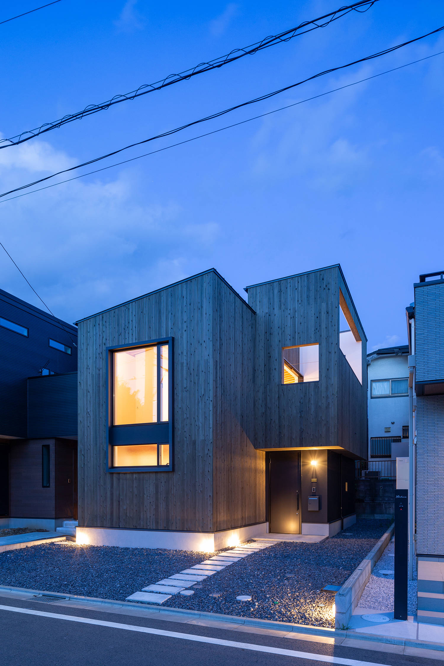 敷地の正面には遊歩道のある小川と、豊かな緑が点在する長閑な雰囲気の場所に建つ5人家族の住まいです。建主のご要望は皆の居場所があること、変化のある空間、開放的な空間が欲しいという3つ。