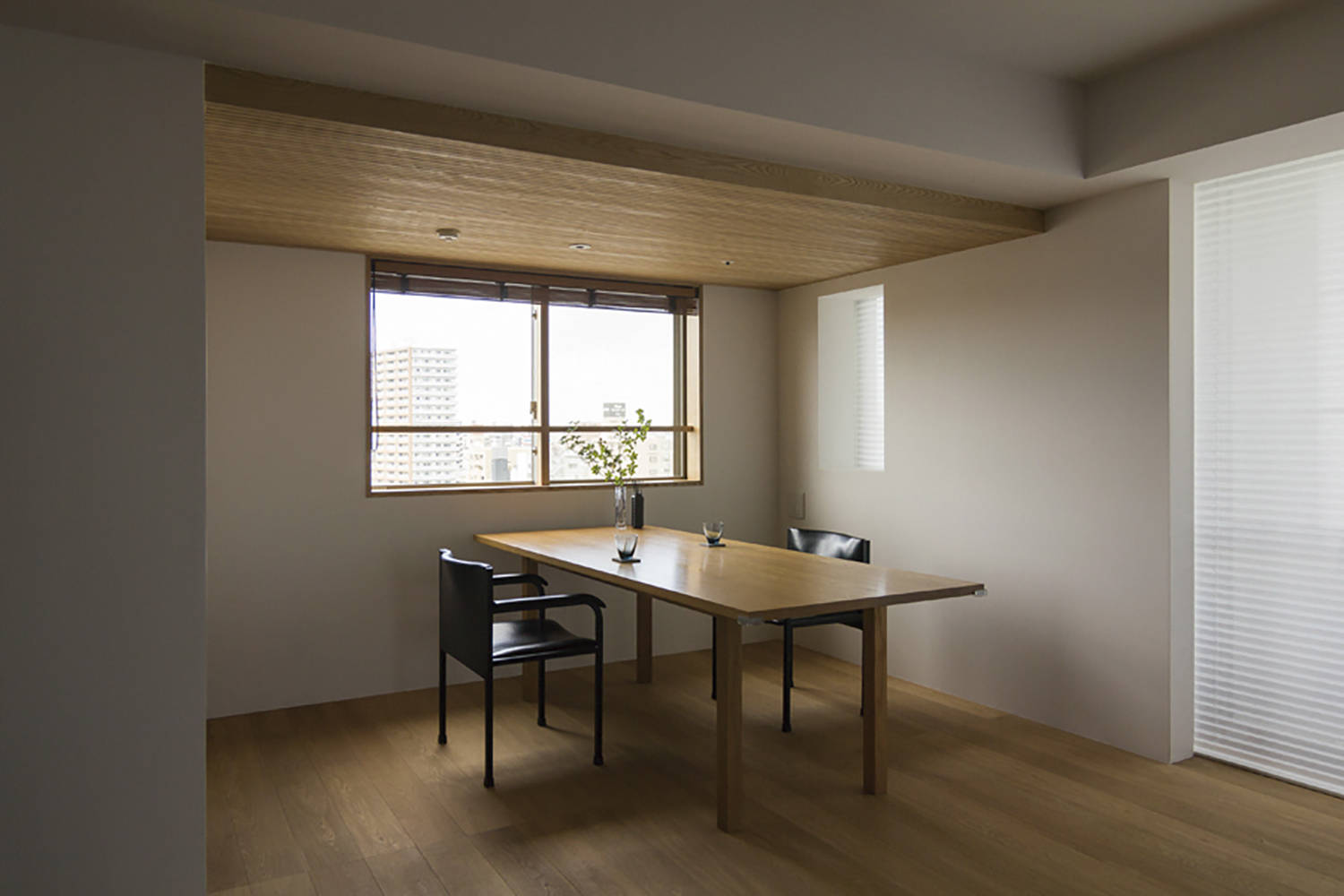 そこで、この計画では細かな各部の調整と寸法の整理で空間を整えることを意識し、あえて既存サッシの前に壁を立てるなど、開口部と壁のプロポーションを変更し、光の入り方を変化させることで空間に落ち着きと居心地の良さがでるように心がけました。