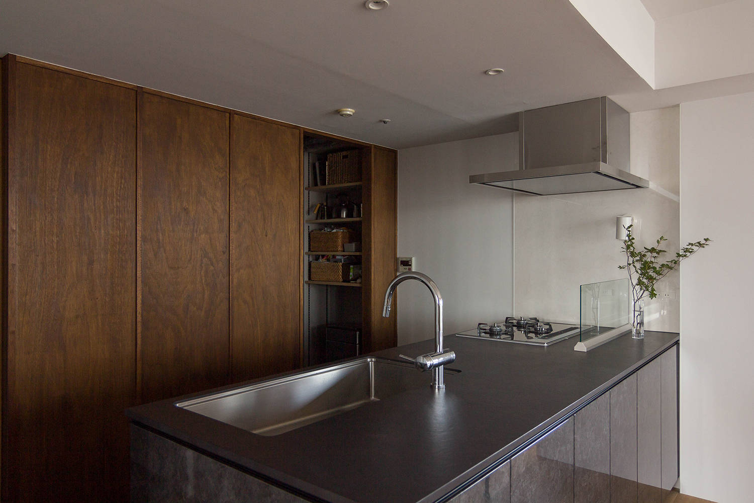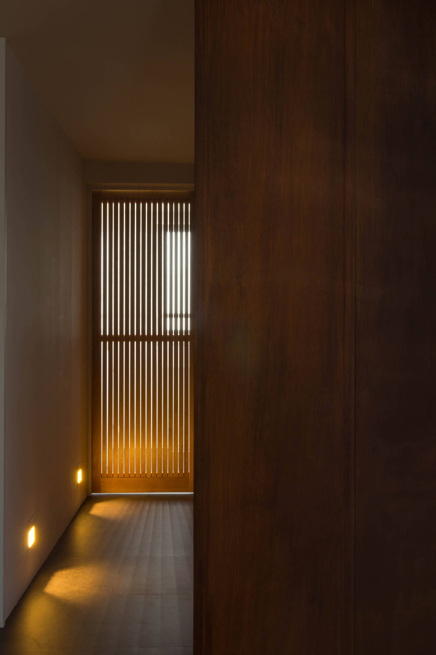 全体的に開口部が無く暗かった玄関は無用に明るくせず、床はダーク系のタイルに変更し壁は着色したラワンを使い、あえて光を抑えた路地のような空間としています。