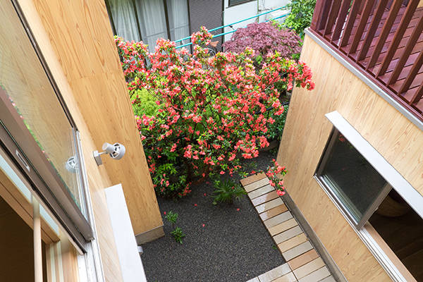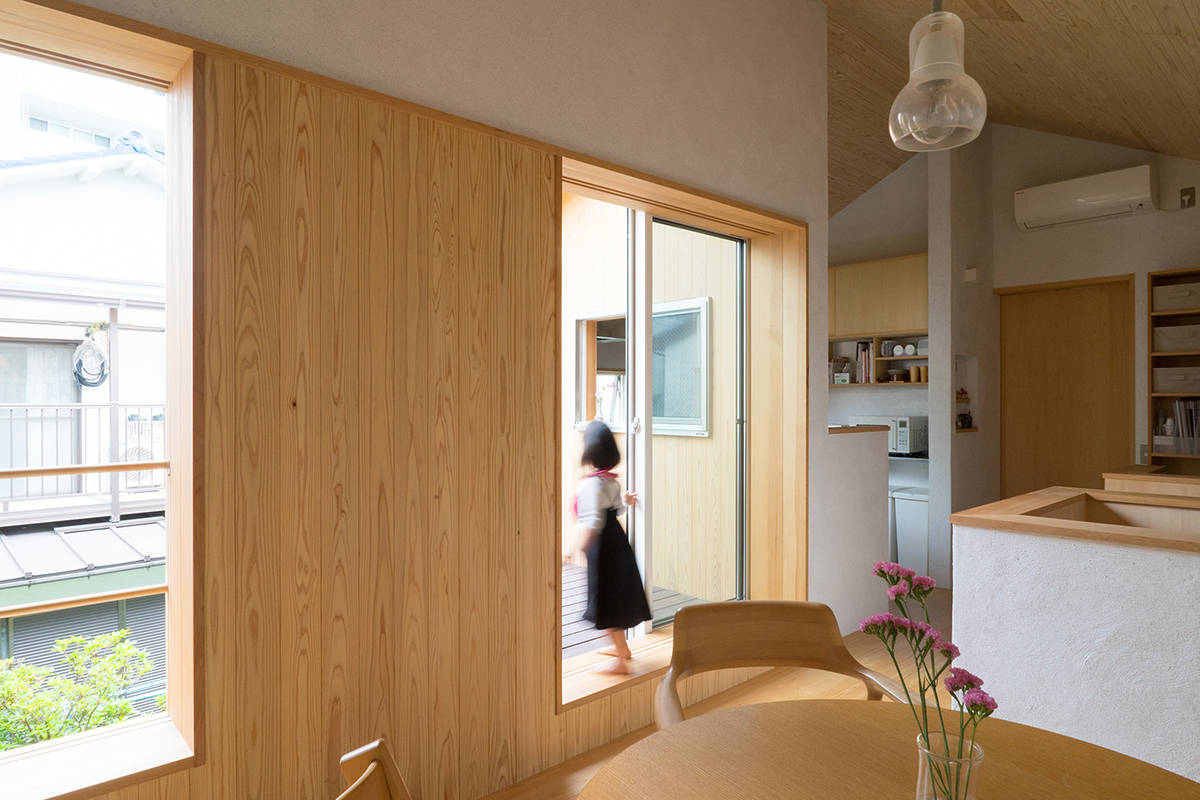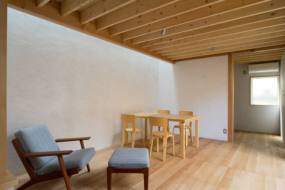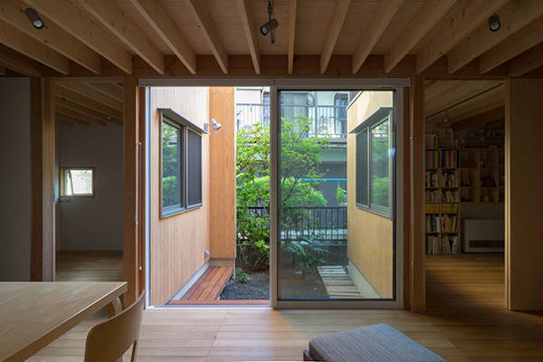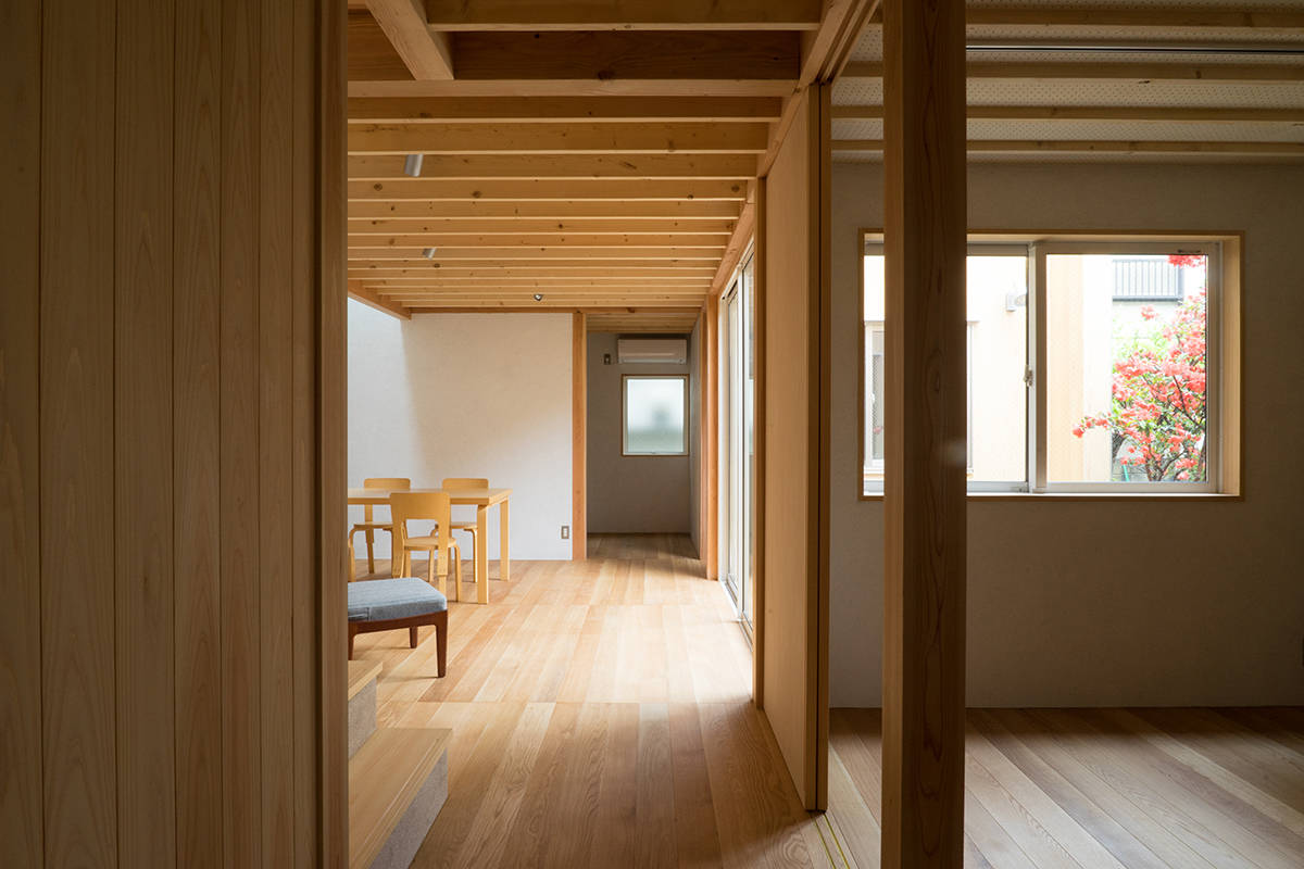 川崎市高津区の住宅地に立つ職住近接の住まいです。敷地は北向きの旗竿地で、以前からあったツツジの樹に寄りそうように計画した中庭のある住宅です。その中庭に面するようにテラスや上の間・下の間、アトリエなどを計画。中庭越しに、ほどよい距離感で立体的に繋がり、外部環境を楽しめるようにしました。上の間はプライベートなリビングダイニング、下の間は子どもの遊び場兼夫の打合せスペースです。子育てしやすいようにワンフロアでコンパクトにも暮らせます。旗竿地で重機が入れないため、人力で立てられるサイズの製材による架構としました。仕上げは無垢材や砂しっくいという自然素材で構成した長期優良住宅です。