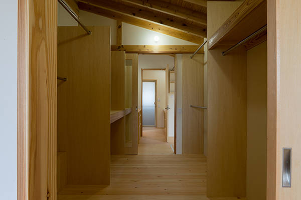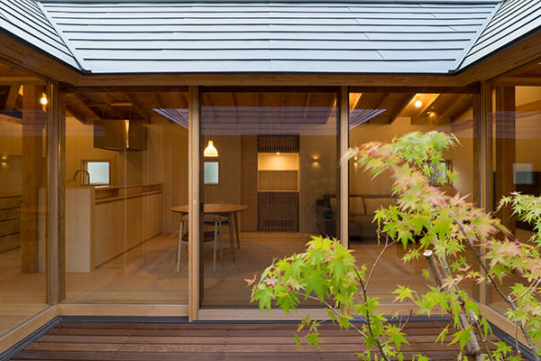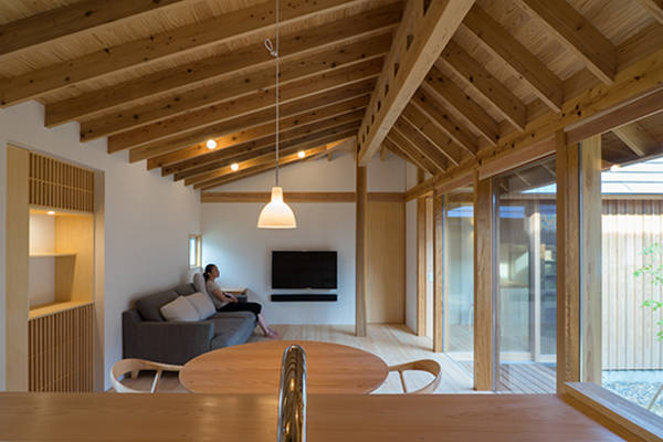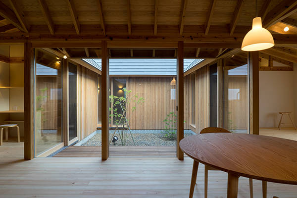 大屋根は等間隔で並んだ登り梁、それを受ける桁(居間は重ね透かし梁)及びそれを支える四隅の五寸角柱によって支えられています。架構は全てスギの製材。中庭を通して室内へ導かれる光を軒先で制御し、この地域特有の東西の強い風を取込めるように配慮しました。一般的に中庭型にして開口部を増やすことは外皮性能を下げる要因と言われますが、実際は外皮計算の結果以上に快適に暮らせるのでは、と考えています。