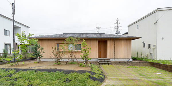 千葉県市原市の住宅街に立つ3人家族のための平屋です。プライバシーは確保しながらも、近隣に対してほどよい距離感を保てるコートハウスを計画しました。東西に長い敷地を生かした中庭、西庭、東庭の3つの庭から成っており、軒先で切り取られた中庭の空だけが見える居間を中心に、西側の落ち着いた雰囲気の街区へはオープンにする一方で、通過交通の多い東側へは水回りや収納を配してクローズにしました。中庭まわりの回遊性、浴室-洗面所-家事室-WIC-寝室へ動線、収納を充実させたプランニングとシンプルな大屋根が特徴的です。
