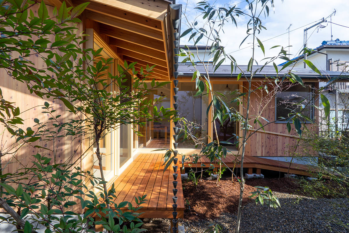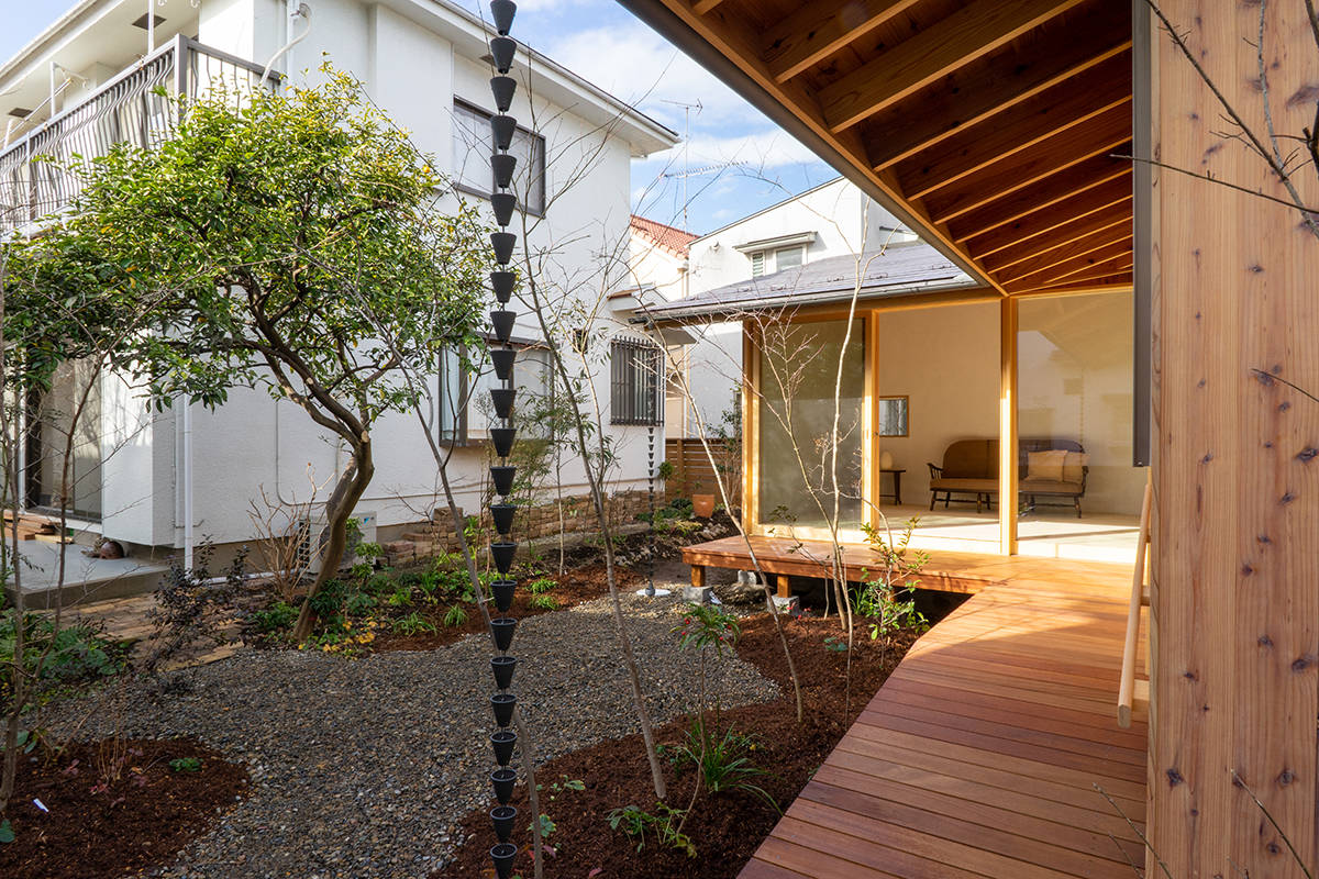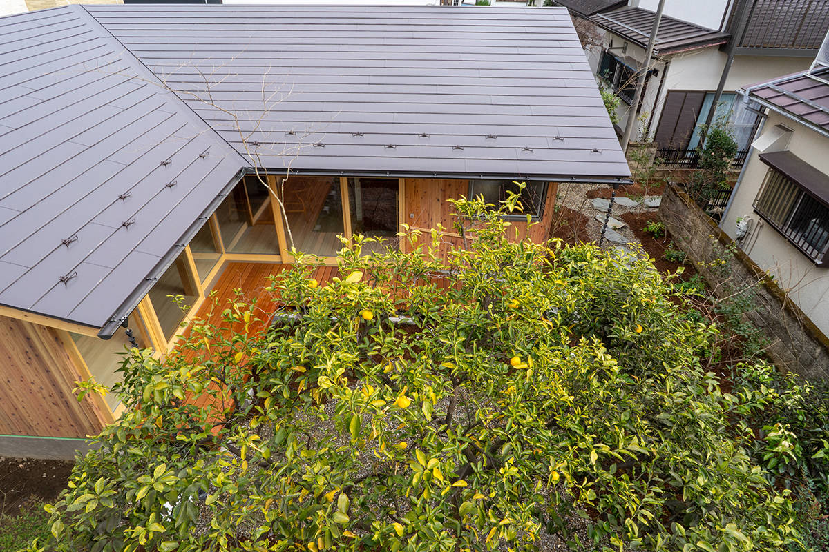 家づくりはその庭を考えることから始めました。育ててきた柚子や夏みかんの樹を計画の中心に据え、山野草と雑木による作庭が行われました。住宅は一室空間と水回りから成るL型プランで、南東の庭に向けてオープンにし、家のどこからでも庭を楽しめるようにしています。隣に暮らす子世帯との往来もしやすくしました。主に西川材(埼玉県飯能市)の杉からなる架構、床の桐板、壁の砂しっくいなどの素材で構成しています。