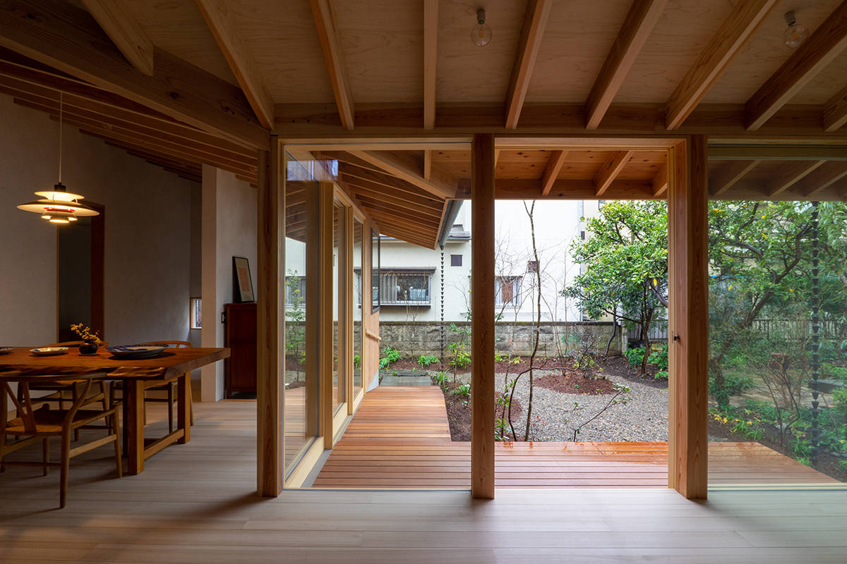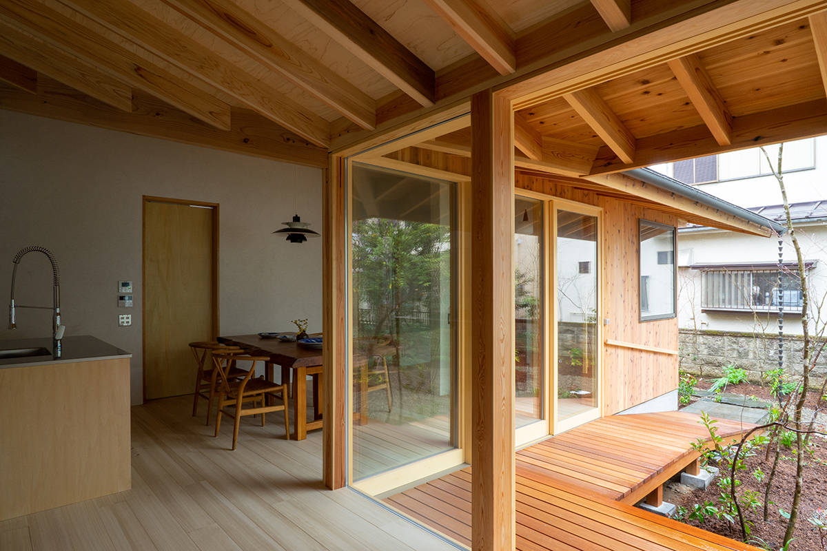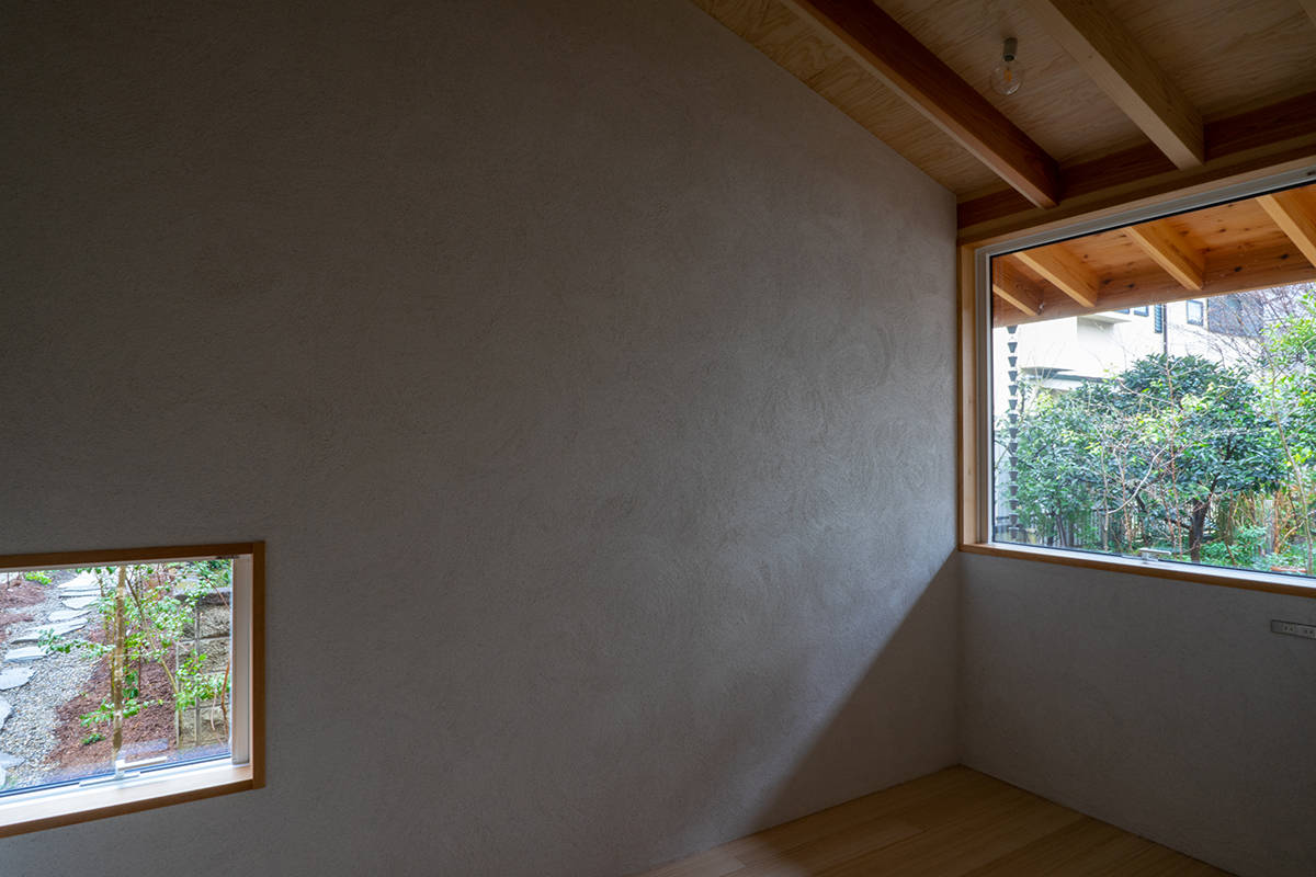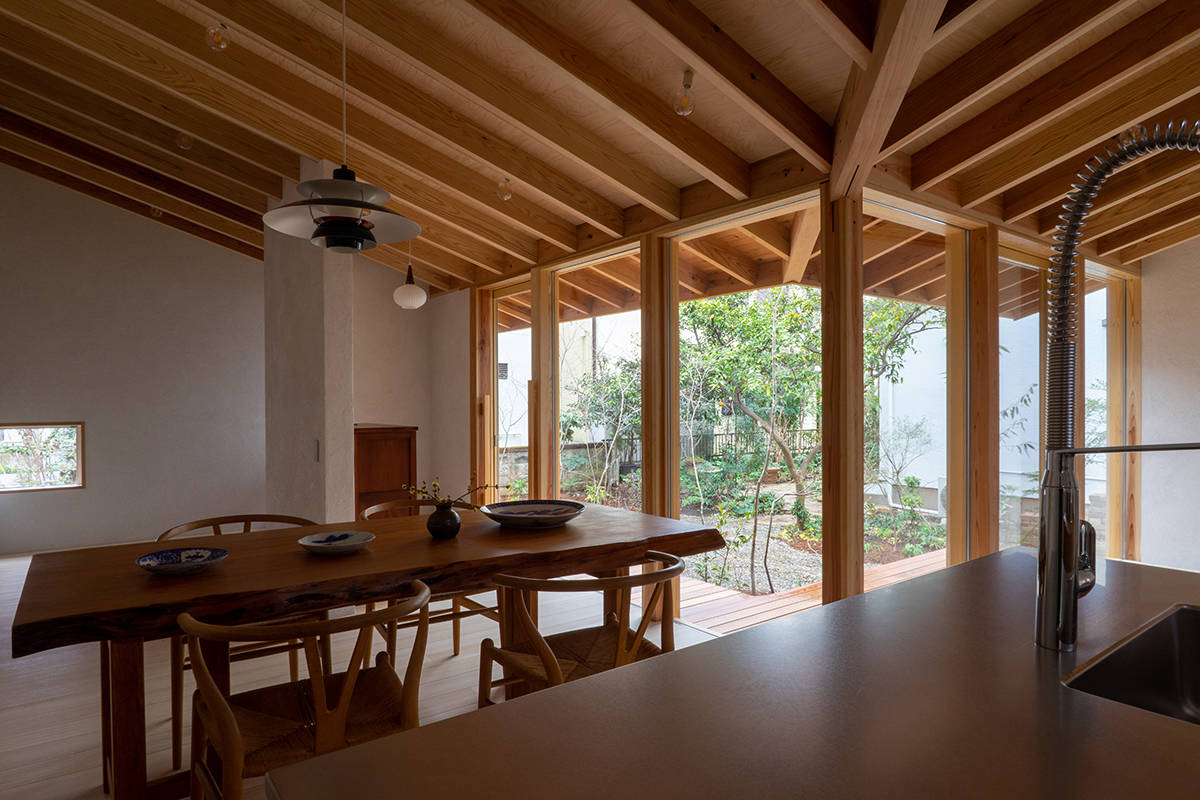 家づくりはその庭を考えることから始めました。育ててきた柚子や夏みかんの樹を計画の中心に据え、山野草と雑木による作庭が行われました。住宅は一室空間と水回りから成るL型プランで、南東の庭に向けてオープンにし、家のどこからでも庭を楽しめるようにしています。隣に暮らす子世帯との往来もしやすくしました。主に西川材(埼玉県飯能市)の杉からなる架構、床の桐板、壁の砂しっくいなどの素材で構成しています。