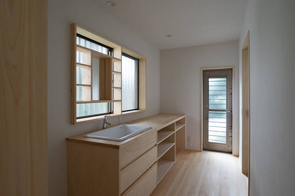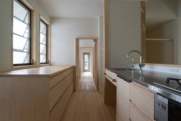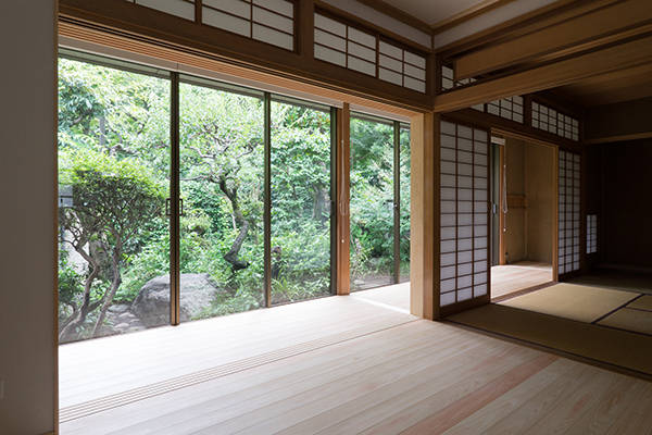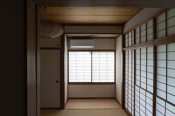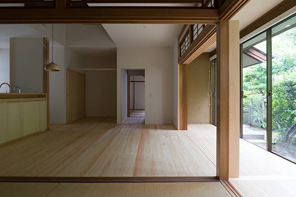 改修は南庭に面した中座敷を居間として計画。吹き抜けを設け、居間を中心に家族が集う姿を想像しました。一方で、奥座敷や和室は残し、窓も利用し、工事は室内から行える(足場をかけずに行える)範囲で行いました。効率的に家事を行えるよう短い回遊動線とし、既存空間と馴染むような自然素材(床:ヒノキ、天井/壁:珪藻土)で仕上げました。天井や床下には断熱材を追加、断熱スクリーンを取り付け、障子を再利用し、温熱環境にも配慮しています。