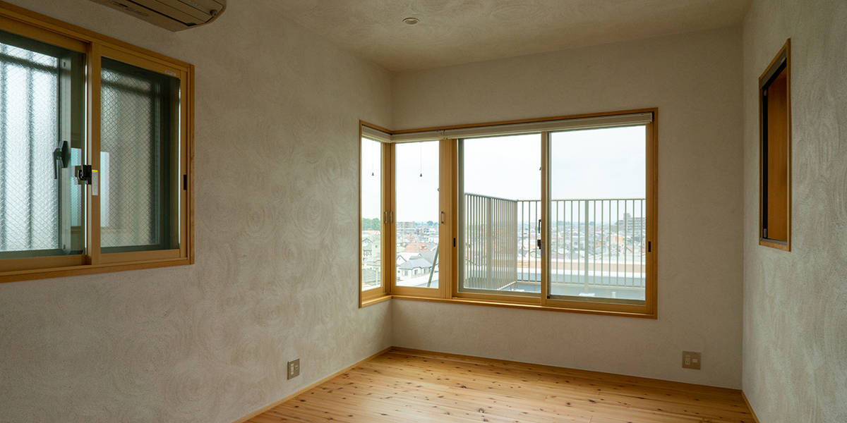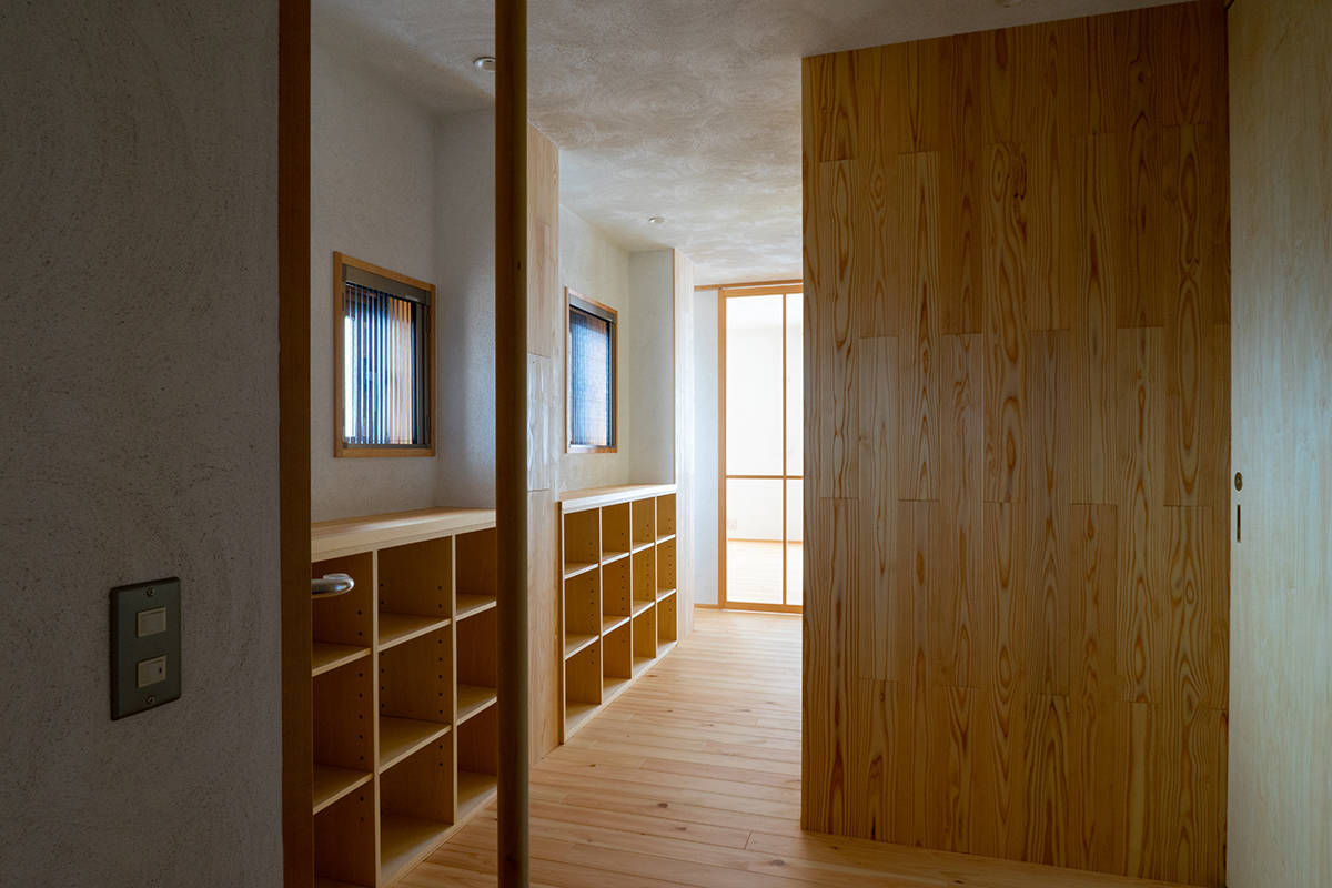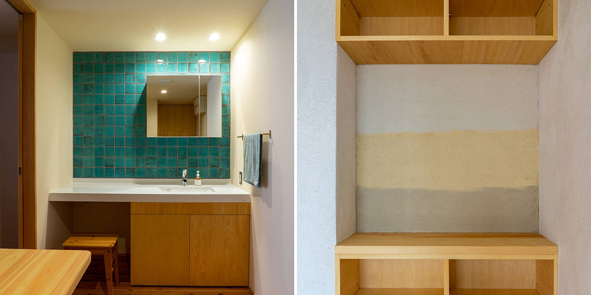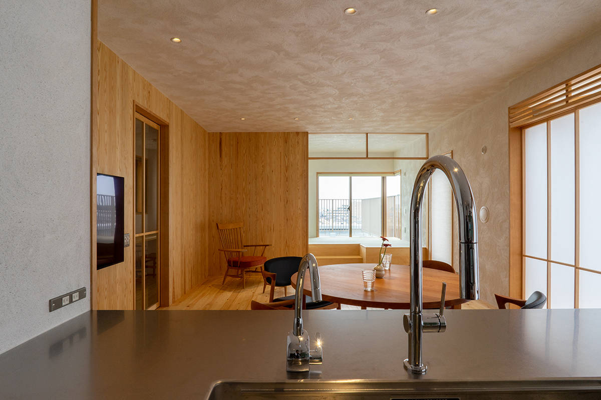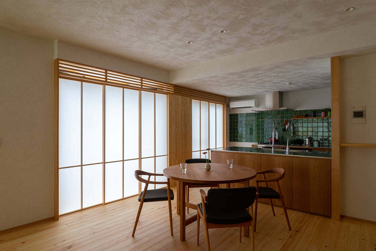 リノベーションでは、躯体をスケルトン状態としてから、中央に収納/トイレを配した回遊プランを提案。動線、収納を整理しました。特徴的なL型サッシや台形の掃き出し窓を利用した居間、オープンキッチン、逆梁を利用した小上がりをしつらえました。温熱環境は断熱(躯体はウレタン吹き付け、窓は障子やハニカムスクリーン、内窓を設置)と、天井/壁の砂しっくいの調湿、無垢床(杉/檜)の肌触りによって整えました。竣工時には柔らかい光が室内に満ち、穏やかな風が抜けるのを肌で感じました。