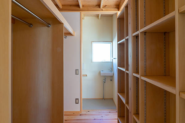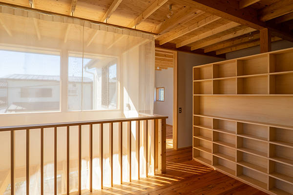 この吹き抜けは室内環境を整える役割を担います。夏は屋根・庇で日射を制御しつつ、南北通風を促します。冬は小梁上に透過性の断熱パネルを敷くことで空間を分断せずに温熱環境を整えられます。一年を通じて、吹き抜けに面し設けたカーテンが内部空間へと柔らかい拡散光を伝えます。