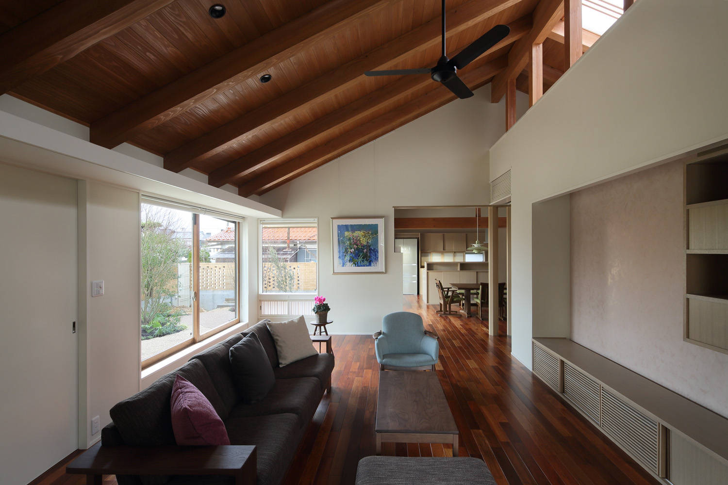 通風採光のためにいくつも庭をちりばめた間取りでは、広がりをより感じさせるため主庭に面して室を斜めに雁行させ、大きな平面形に対しては回遊性や曲折する動線で変化や利便を図っています。 軒の深い大屋根の重なりは住まいの外観に落ち着いた陰影を与えるとともに、屋根をそのままあらわした室内は、おおらかに包まれた安らぎを醸しています。