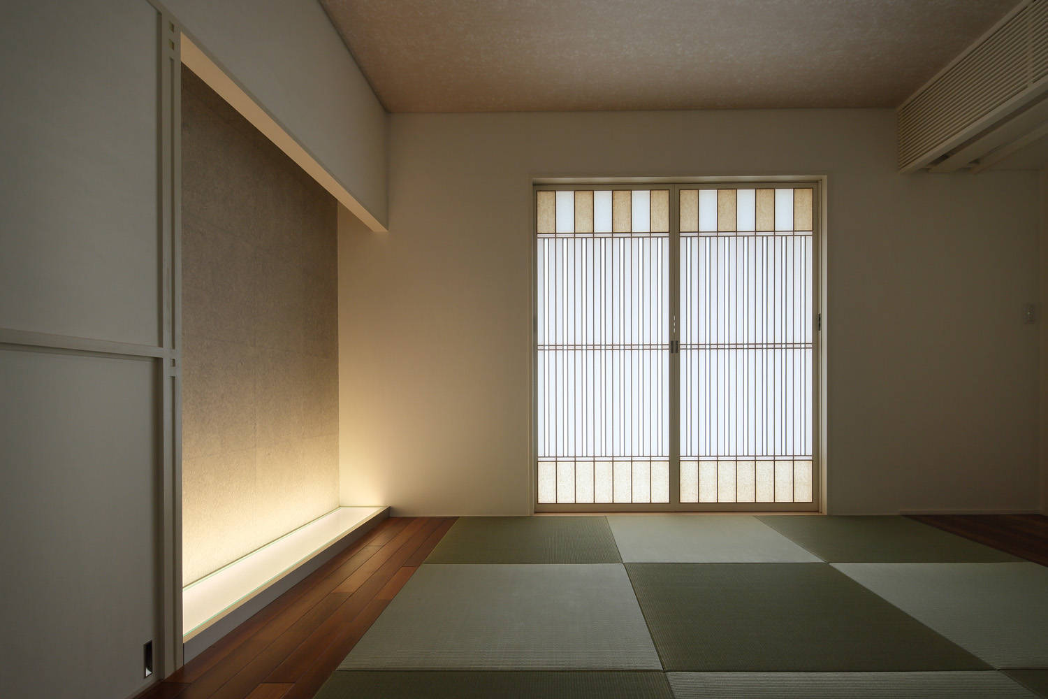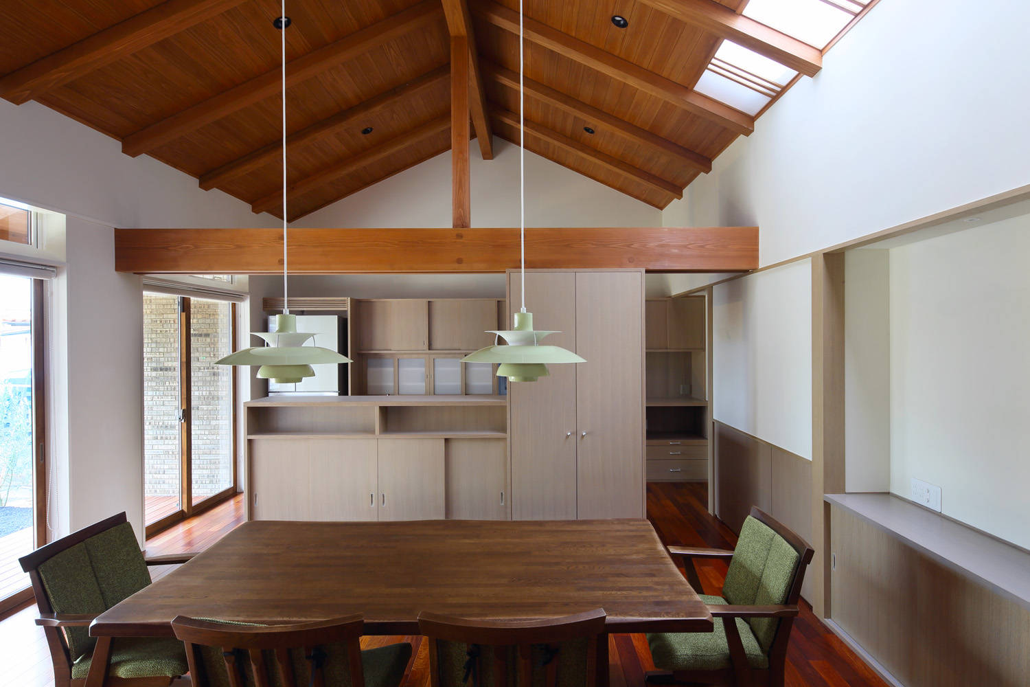 一方、深く大きな軒は冬の山陰では室内を充分な光で満たしてはくれません。天井の隅に設けた天窓の、障子を透過した光はその下の斜めの壁で反射して拡散し、室内を柔らかな光で補います。