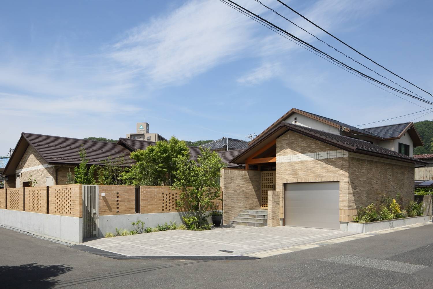 深い軒の下、外壁に張られたスクラッチタイルは一枚一枚が異なる表情を見せています。その壁面には、さりげなく模様張りをしのばせました。