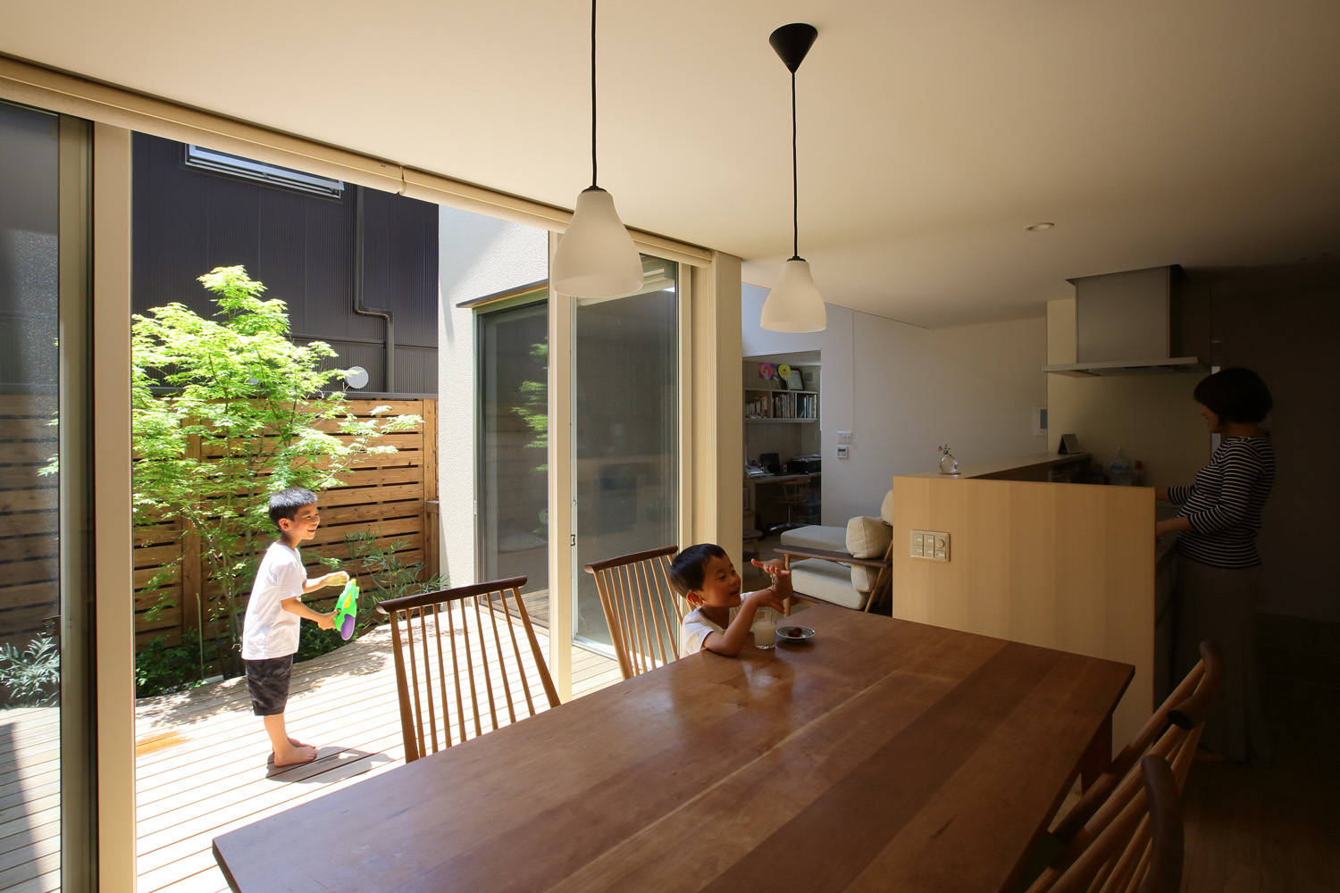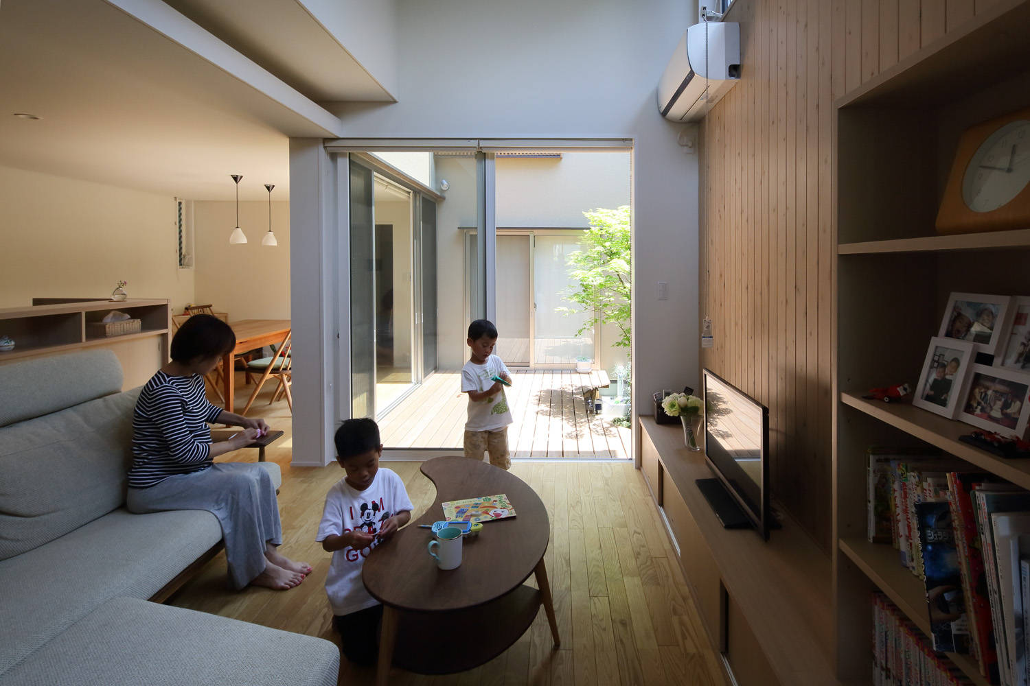 東西に長い敷地のため南北両側は隣棟間隔も最低限しか取れず眺望も望むべくありませんが、東西両面の道路と中庭により採光通風は充分に期待できます。厳しい北側高さ制限と若干の敷地の高低差を考慮し、1階にも日照を呼び込む中庭の大きさを確保し、併せて居間を1.5層分の天井高さとして上部からも光の注ぐ計画としました。
