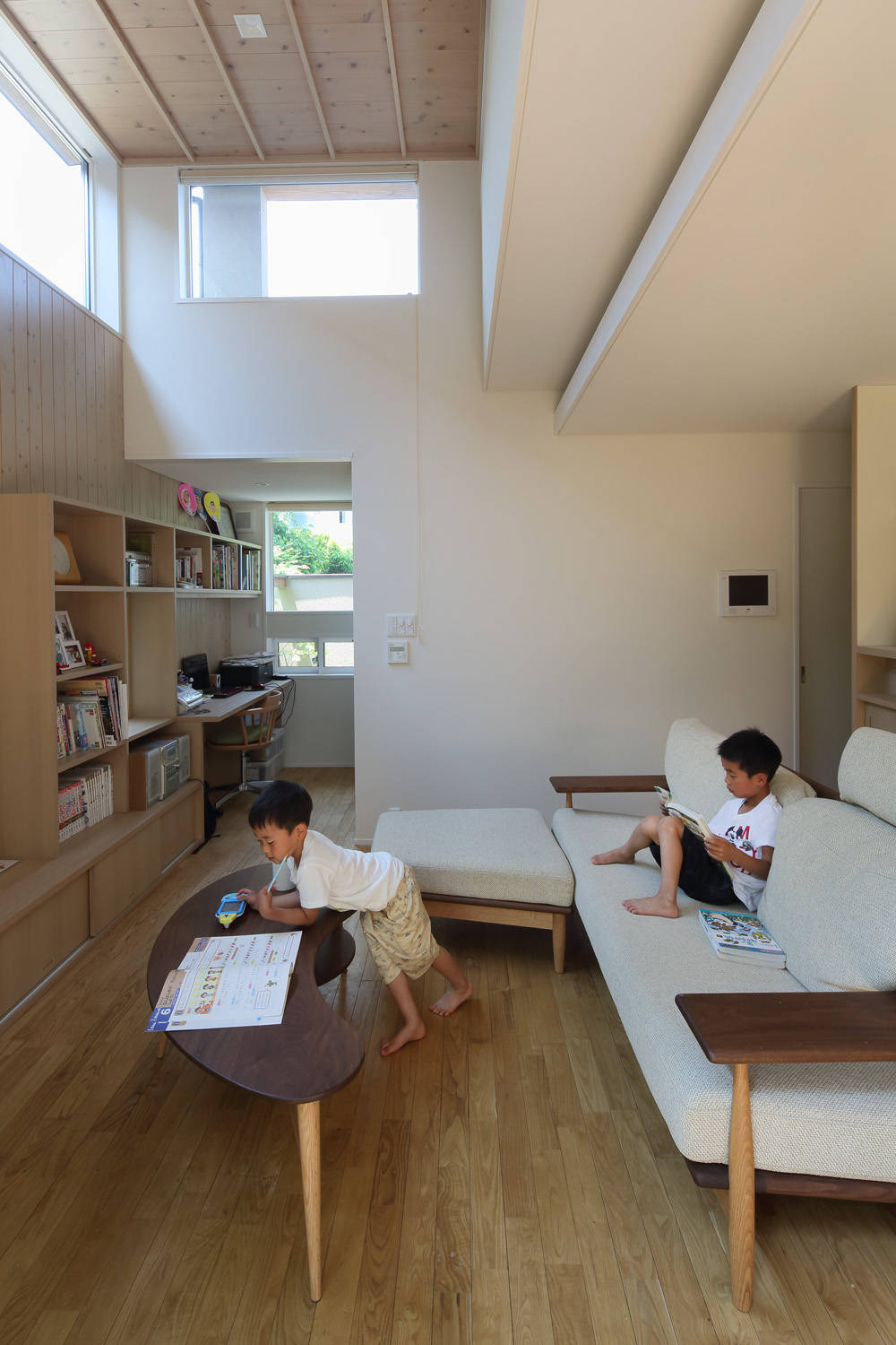 1.5層分の居間は2階の子供室とも立体的に繋がり、さらに上部の半階分の残余の空間は子供室からスキップしたロフトとして、お子さまの秘密基地となることでしょう。