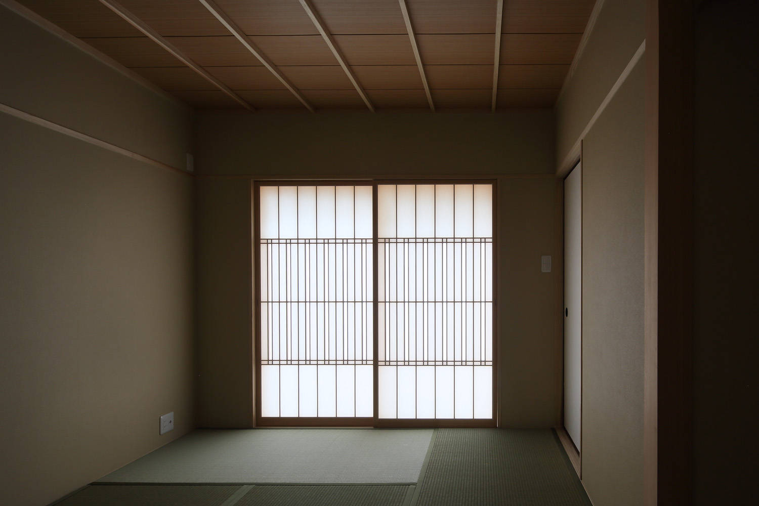 居間の片隅を窪ませて設けた落ち着いたデスクスペースからは、坪庭の奥に西側隣地の大樹が眼に入ります。その坪庭はお風呂からの庭ともなり、檜葉の板を張った浴室で朝晩リフレッシュできる憩いのひと時をより豊かなもにします。