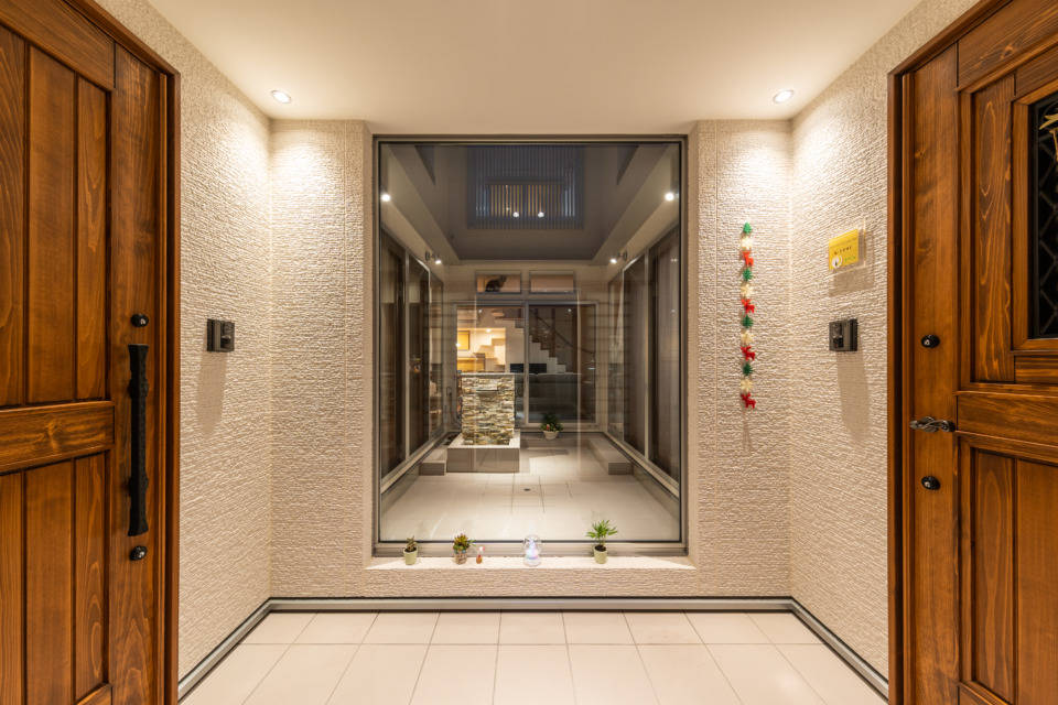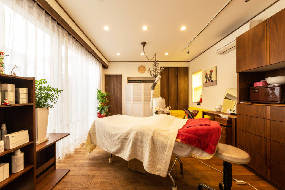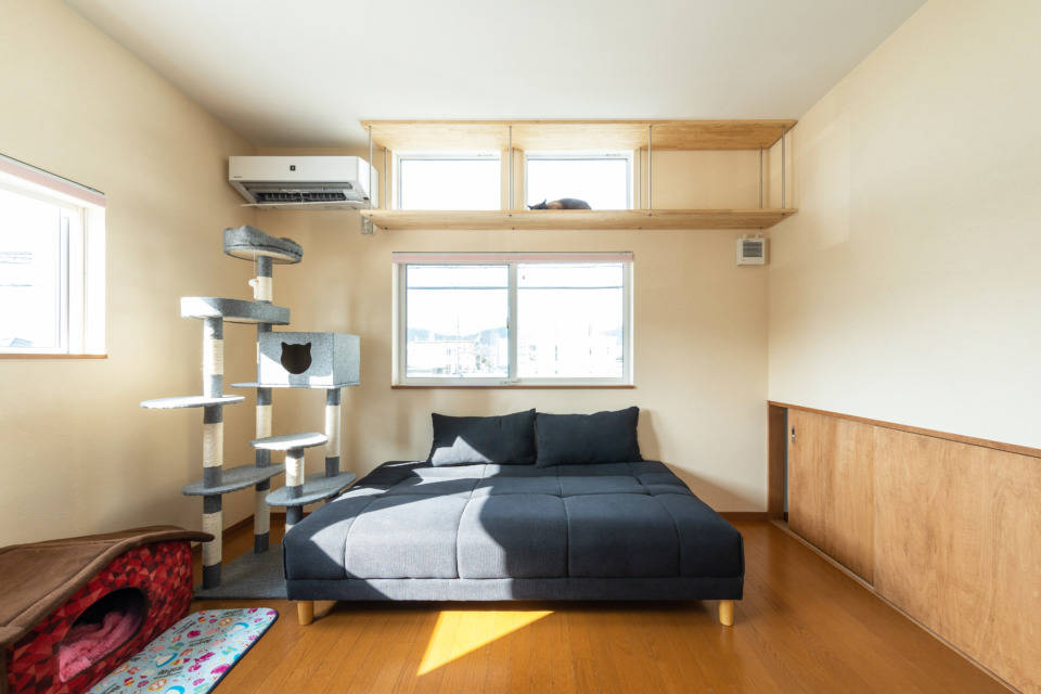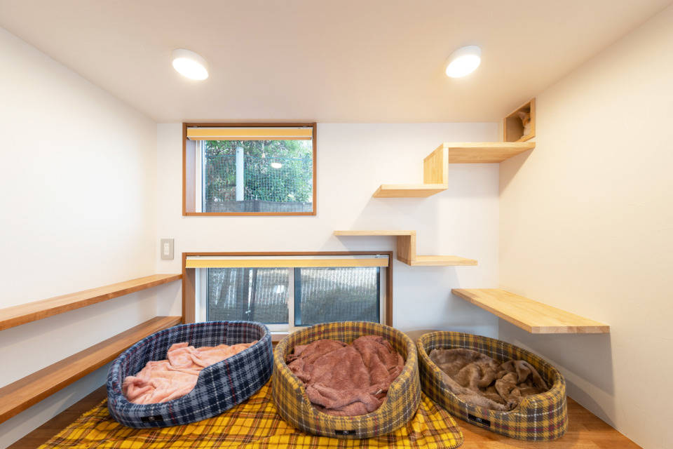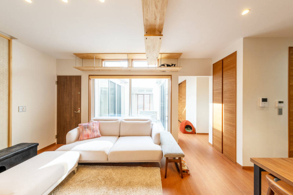 ネコをこよなく愛されているお客様のお家です。周辺環境やネコが逃げ出さないように考えた結果、中庭を設けるロの字型の家になりました。又、お客様の仕事でもあるエステルームを、外部から完全に遮断された中庭に面する場所にレイアウトすることで、より一層日常を忘れさせてくれるエステルームとなっています。