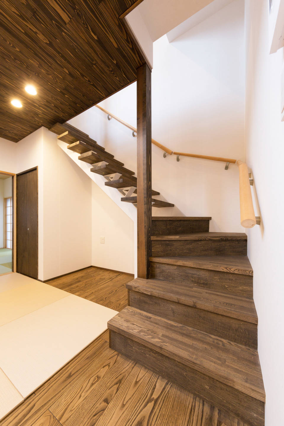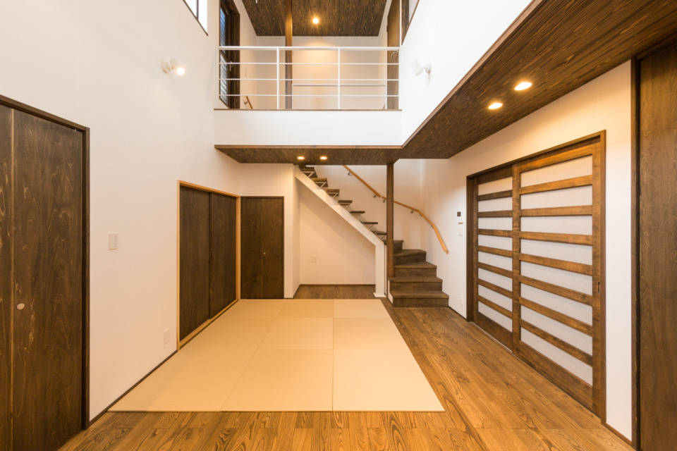 狭小敷地である為、1階にある和室や水回り等へのアクセスはリビング・ダイニングから放射線状に接している間取りです。