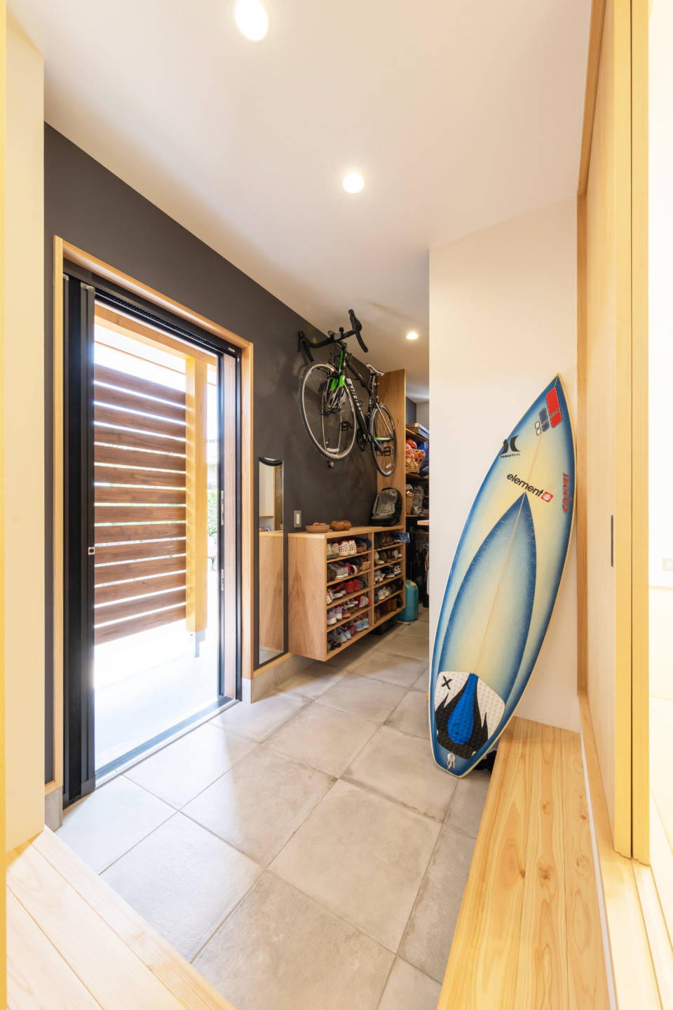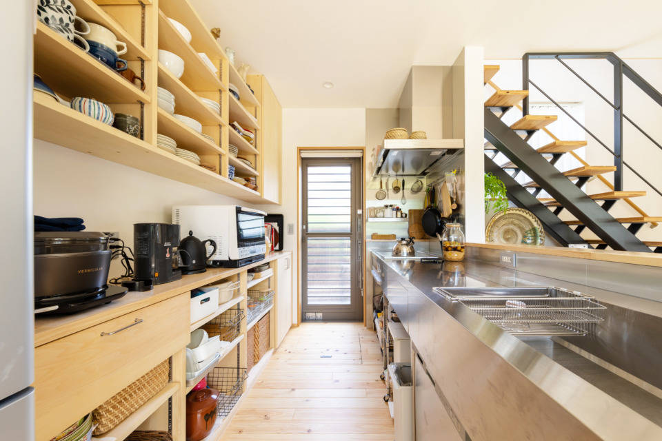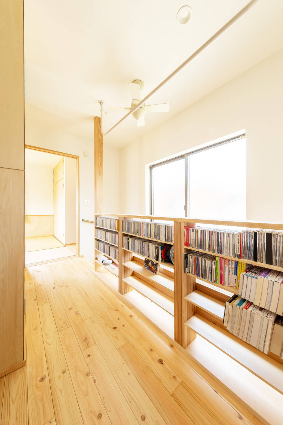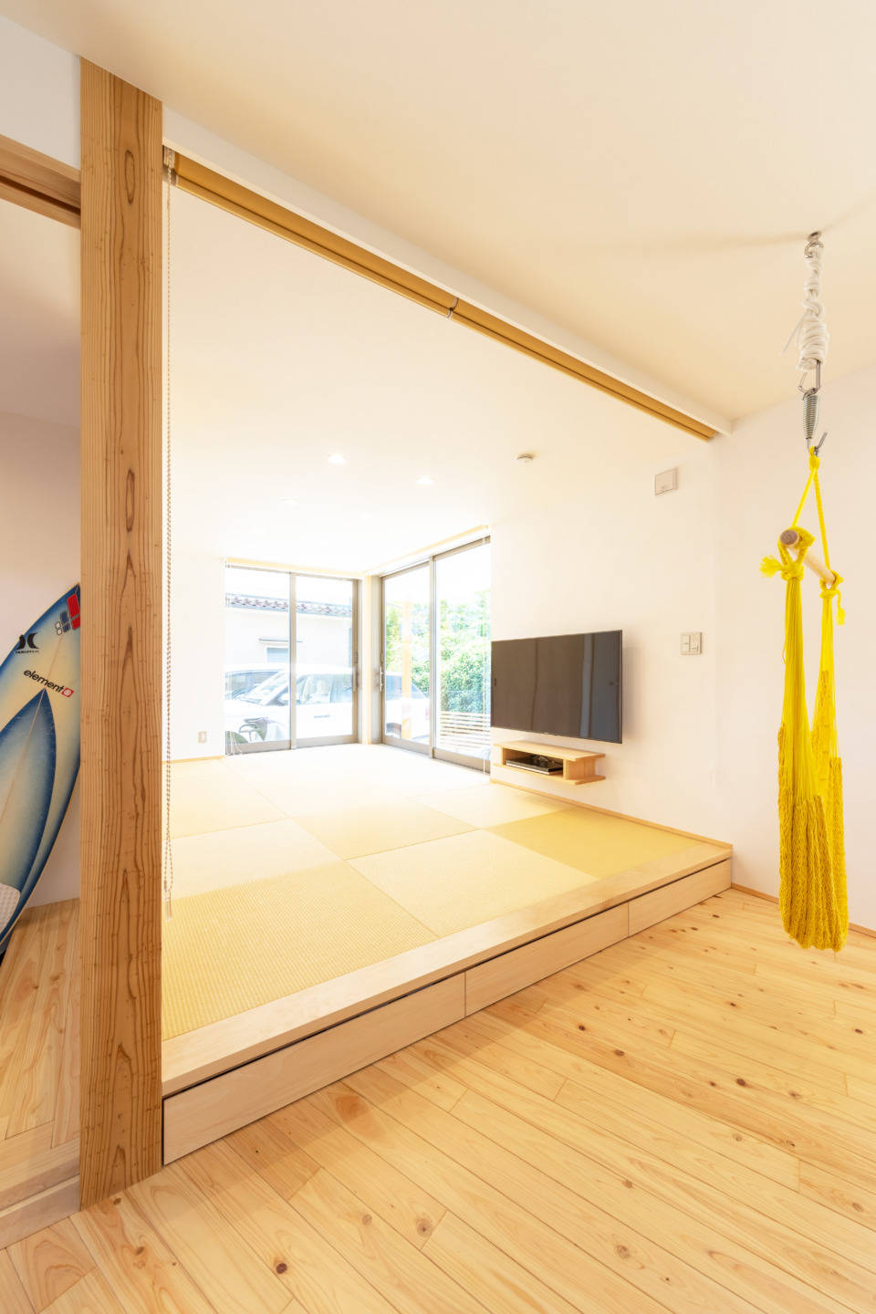 緑に囲まれたのどかな場所に建つ、5人家族の住宅です。和室にある窓を開けると、そこはほぼ外部空間。爽やかな風がリビングを通り、2階にまで吹き抜けていきます。これからコツコツと、家族でウッドデッキを造っていかれる予定ですので、ますます魅力いっぱいの家になることでしょう。