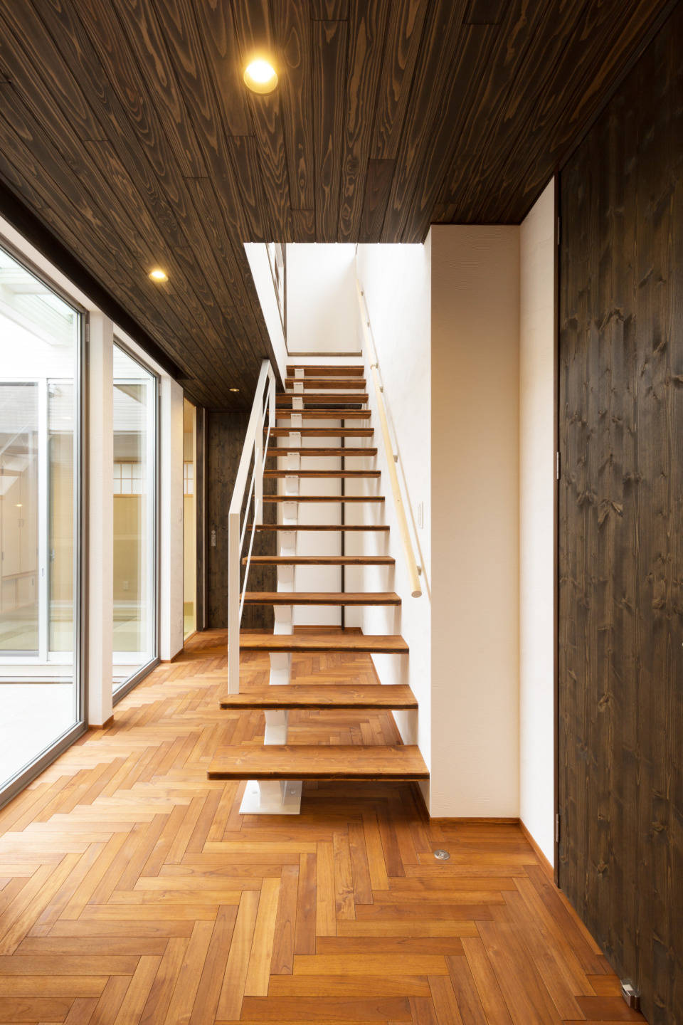 廿日市に建つ、都市型住宅です。2方を道路に囲まれた角地である為、1階は特に道路に面して大きな窓を設けていません。その代わり中庭を設け、周囲の視線を気にすることなくくつろげるようにしています。又中庭は、自然を感じる空間として、石を張った壁から水が流れ落ちてくるようにしています。機能性だけでなく、遊び心も盛り込んだ家です。