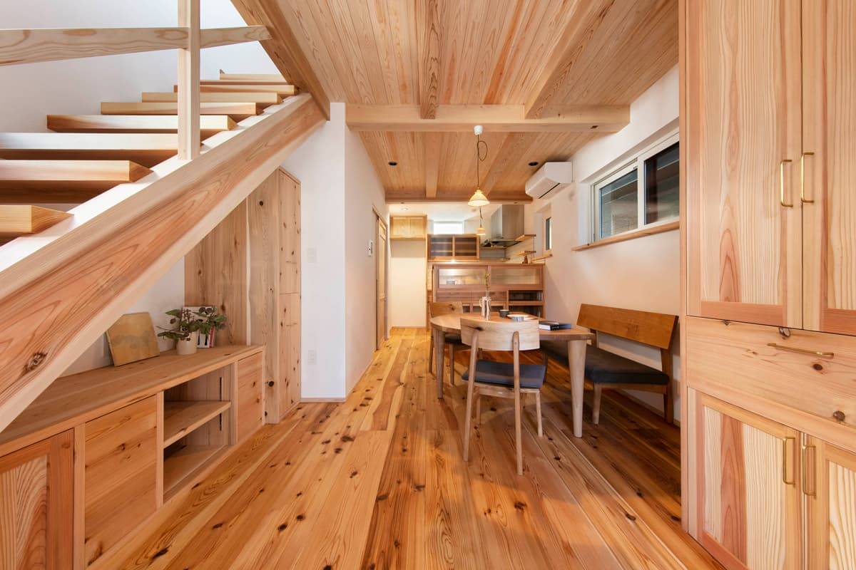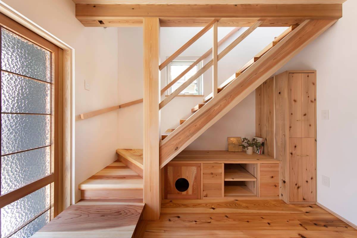 都内狭小地の建て替え新築の事例です。ご夫婦2人と30代の息子さん、猫2匹のご家族の家。葛飾区の耐震建て替え助成金を利用する為に、準耐火構造の2階建て木造として設計しました。液状化や浸水の対策検討も必要な地域でしたのでその辺りも住まい手さんと話し合い、予算の中で可能な方法をご提案し設計に盛り込みました。また、断熱・気密の性能を上げエアコン1台でも快適に過ごせる性能を確保しました。採光の取りづらい狭小地ですが、天窓やハイサイドライト、ストリップ階段の吹き抜けから光を落とすなどの工夫をしています。猫たちのトイレは必要な箇所数を設計当初から確保しつつ、生活用品の収納スペースもたくさん設け、限られたスペースの中でもスッキリ快適に過ごせるように配慮しました。