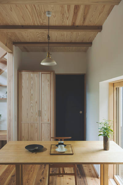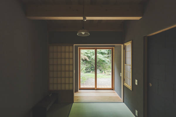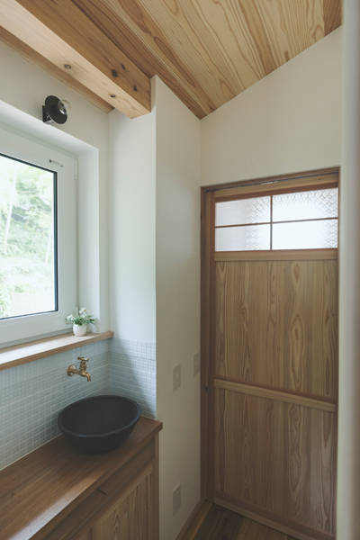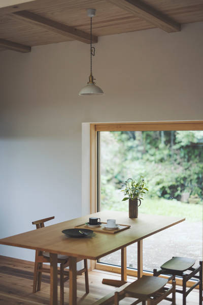 鎌倉という土地柄と敷地内に水路や井戸がある為、湿気対策が不可欠な敷地。除湿には一番適しているエアコンを使った空調は使用しないので、建物の基礎構造や換気方式・エアコン以外の設備機器などで湿気対策の工夫をしています。また、草木の茂る斜面の景色の移り変わりを室内から眺められる居心地の良いポイントをいくつも作りました。