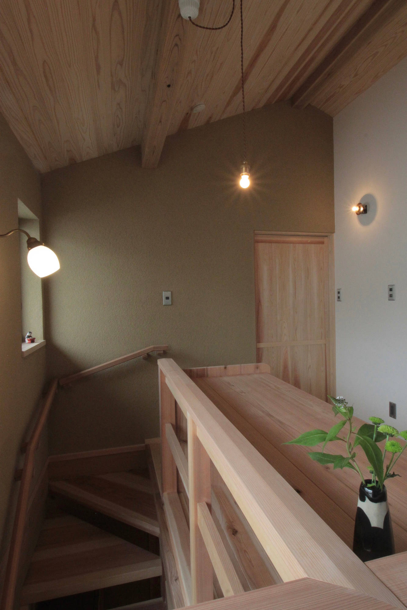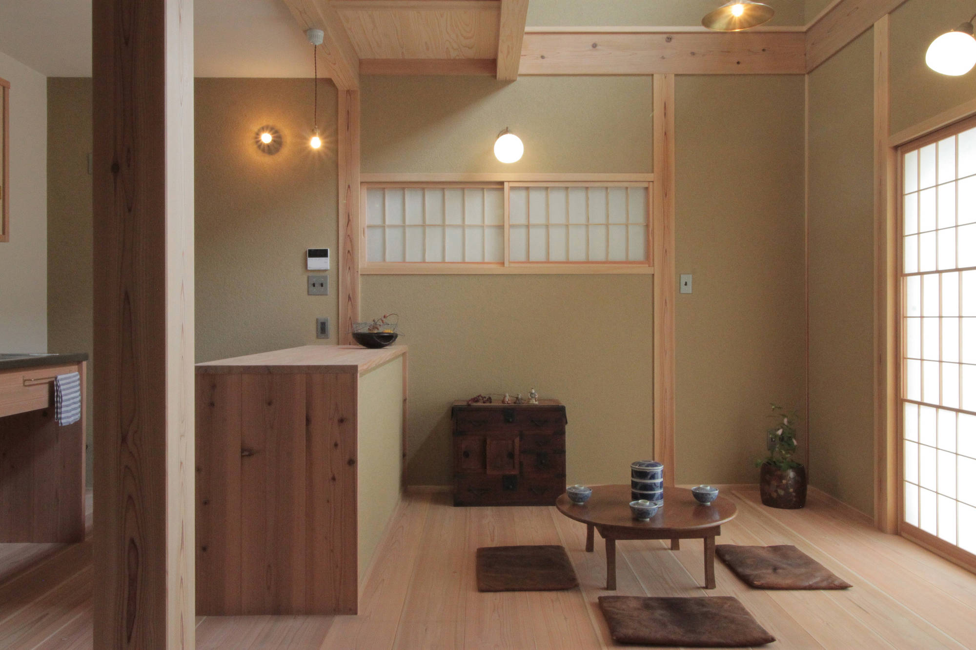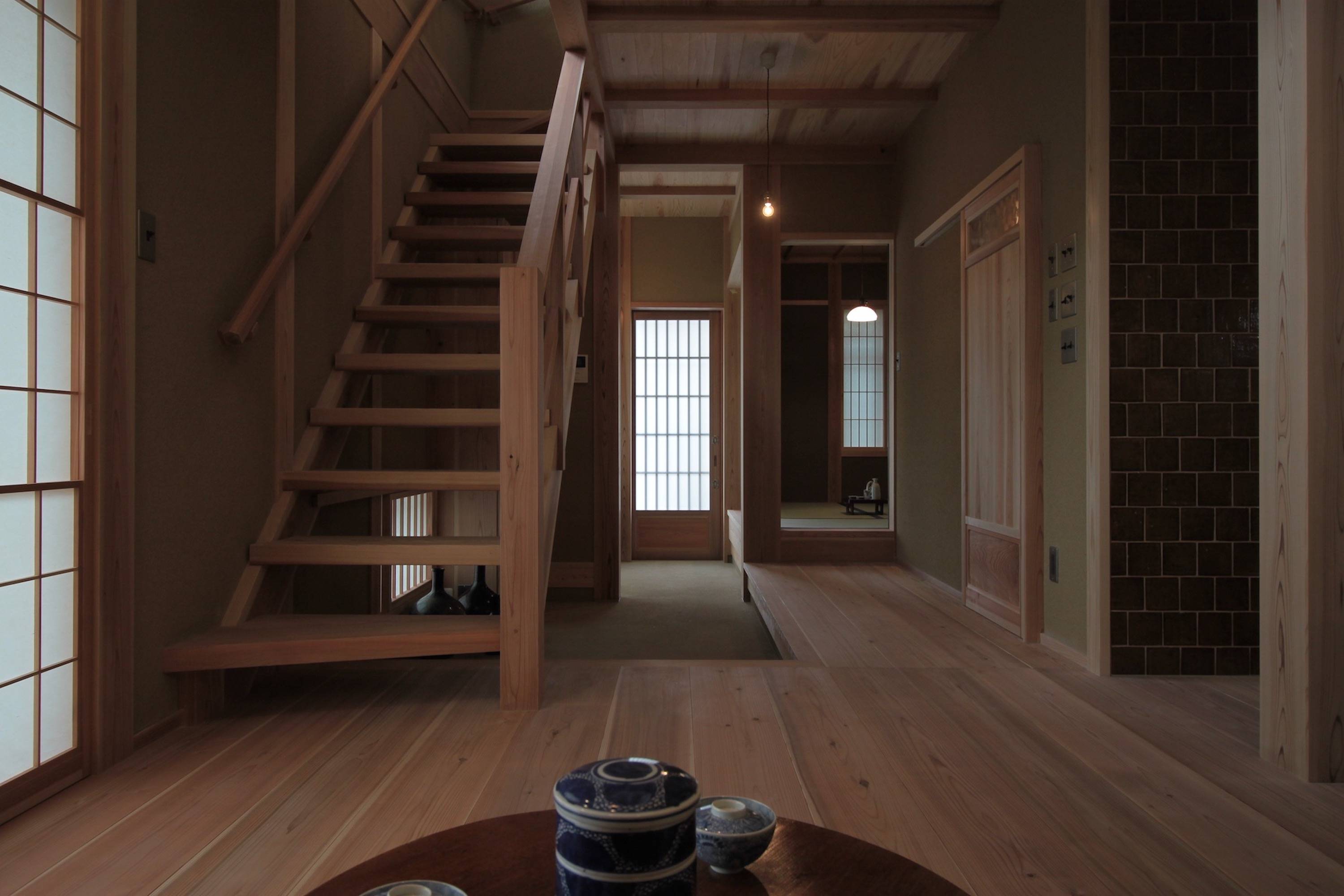 日本の伝統的な手仕事がお好きで、京都の町家をイメージした家がご希望の住まい手さんの家。1階は土入りモルタル洗い出しの広めの土間と土壁の空間、2階は漆喰塗りとしました。将来的に隣地に高い建物が建っても室内の採光が確保できるような建物配置とし、吹き抜けに設置した高窓からも1階のLDKに光が落ちるようにしました。高窓のメンテナンスは2階のバルコニーから出来るようにしてあります。古い建具や町工場で作っている照明器具など、住まい手さんと一緒に探して来たものを随所に取り入れています。