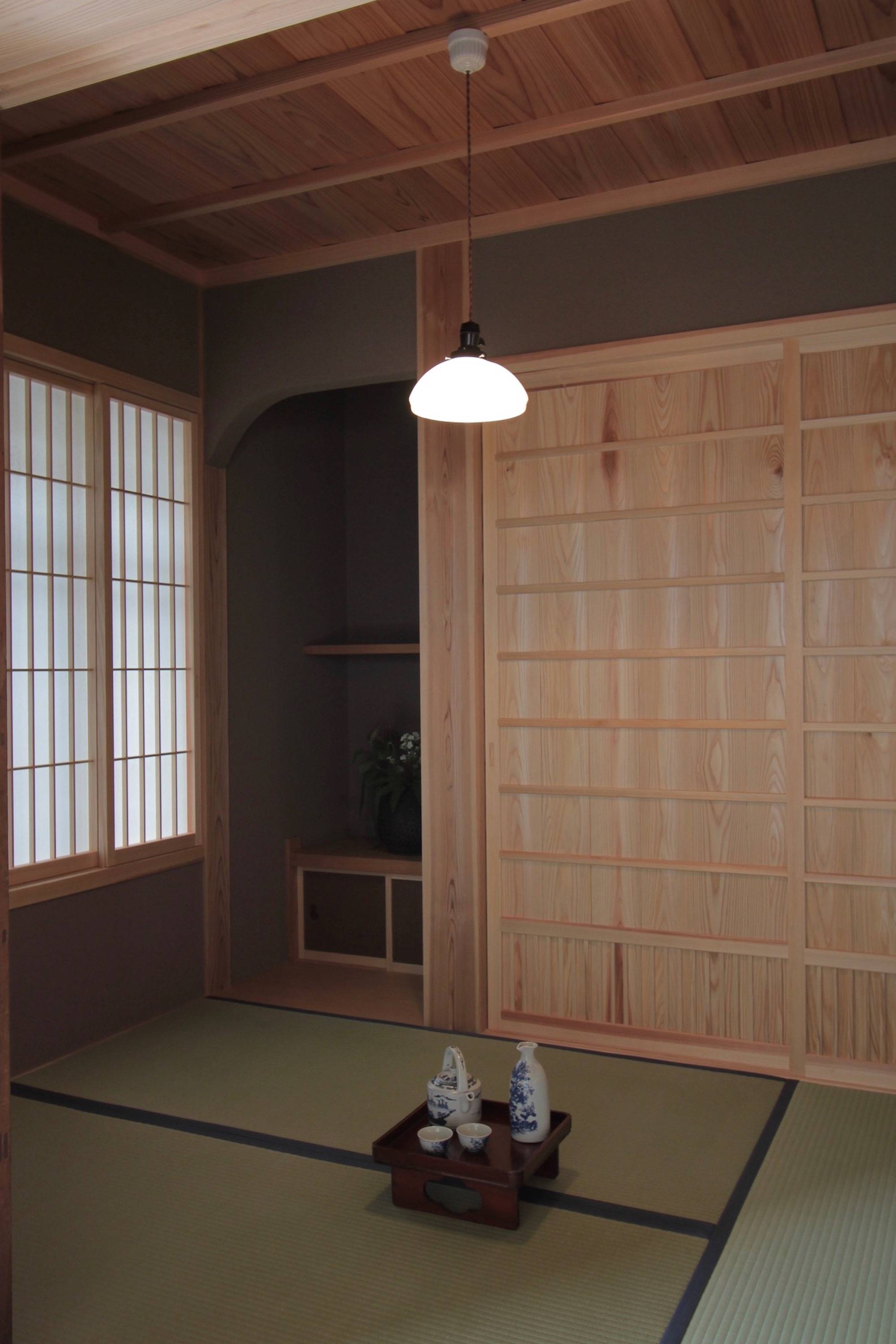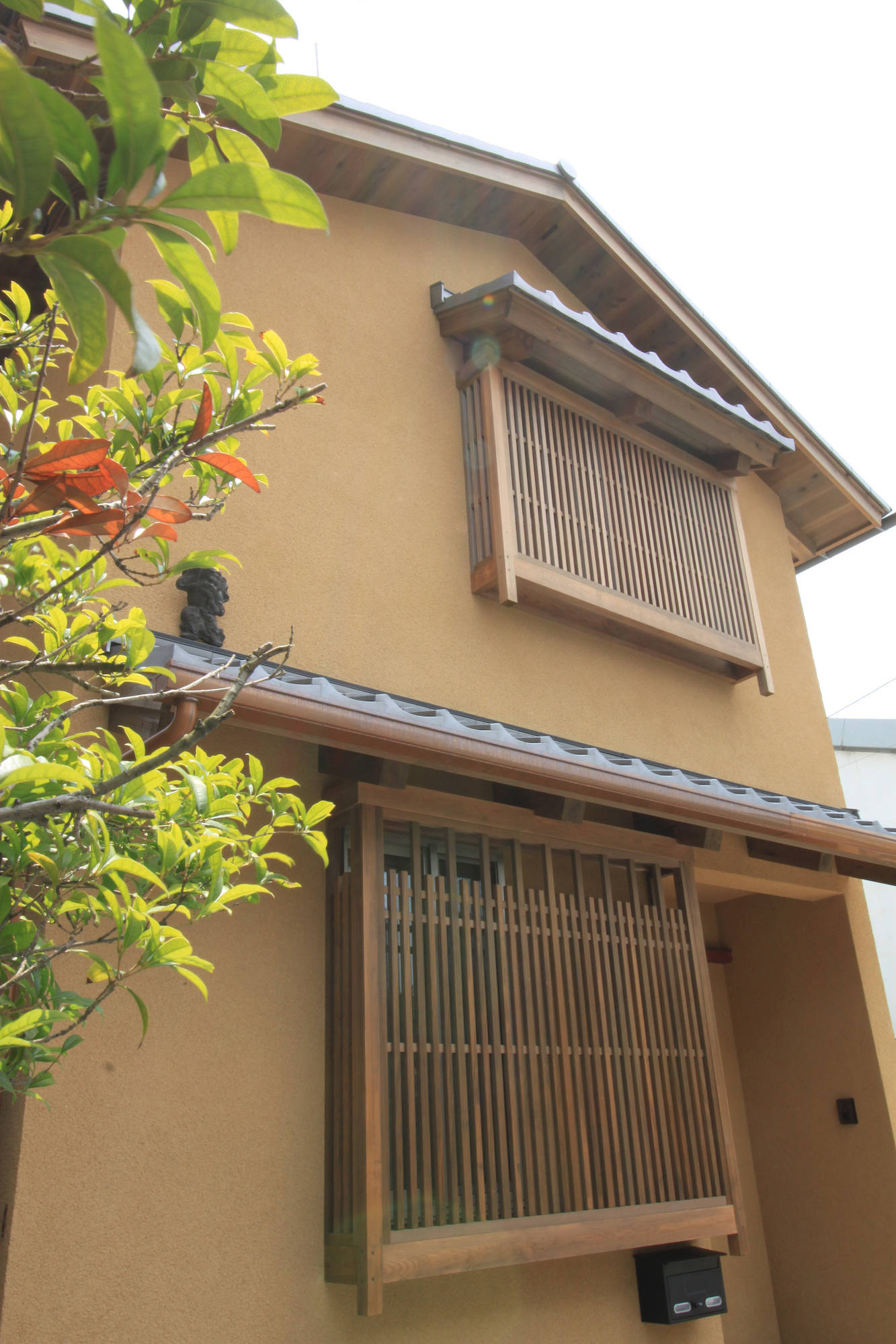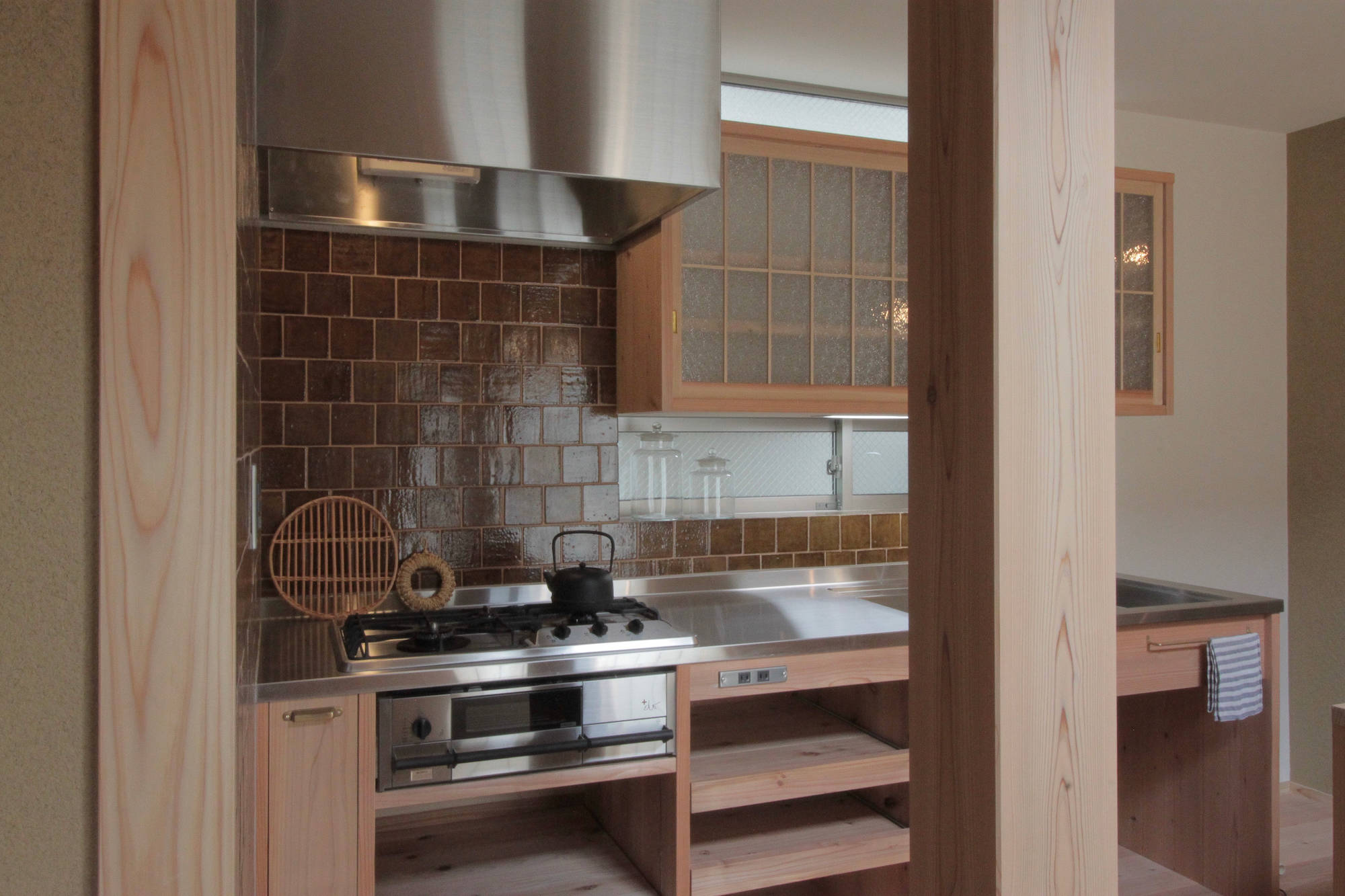 日本の伝統的な手仕事がお好きで、京都の町家をイメージした家がご希望の住まい手さんの家。1階は土入りモルタル洗い出しの広めの土間と土壁の空間、2階は漆喰塗りとしました。将来的に隣地に高い建物が建っても室内の採光が確保できるような建物配置とし、吹き抜けに設置した高窓からも1階のLDKに光が落ちるようにしました。高窓のメンテナンスは2階のバルコニーから出来るようにしてあります。古い建具や町工場で作っている照明器具など、住まい手さんと一緒に探して来たものを随所に取り入れています。