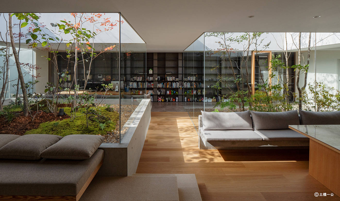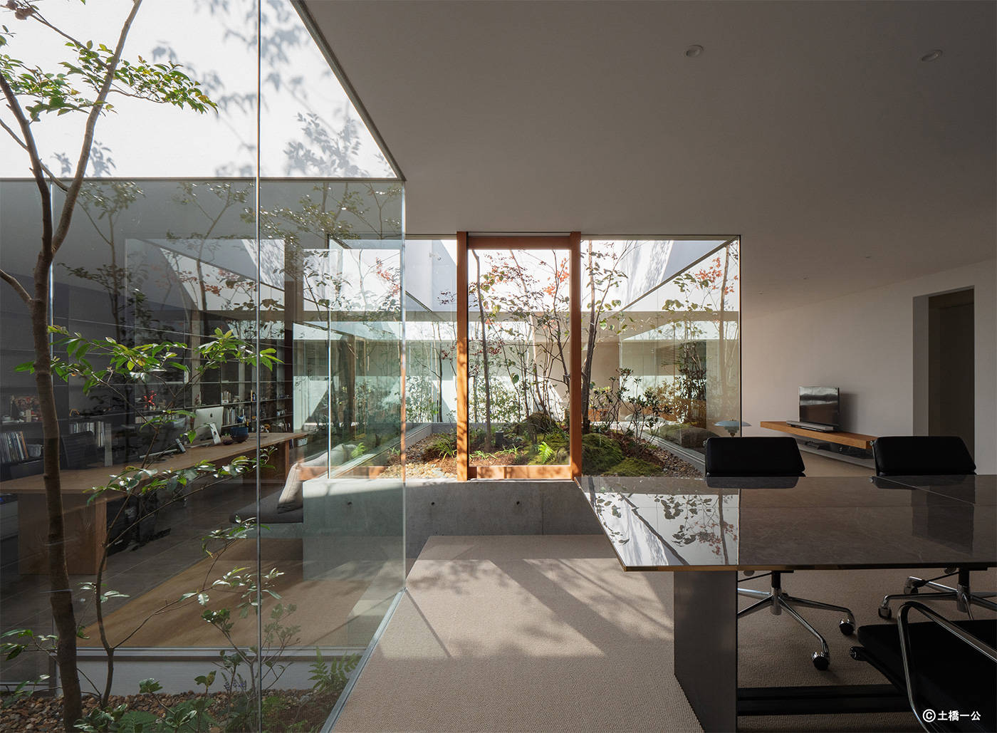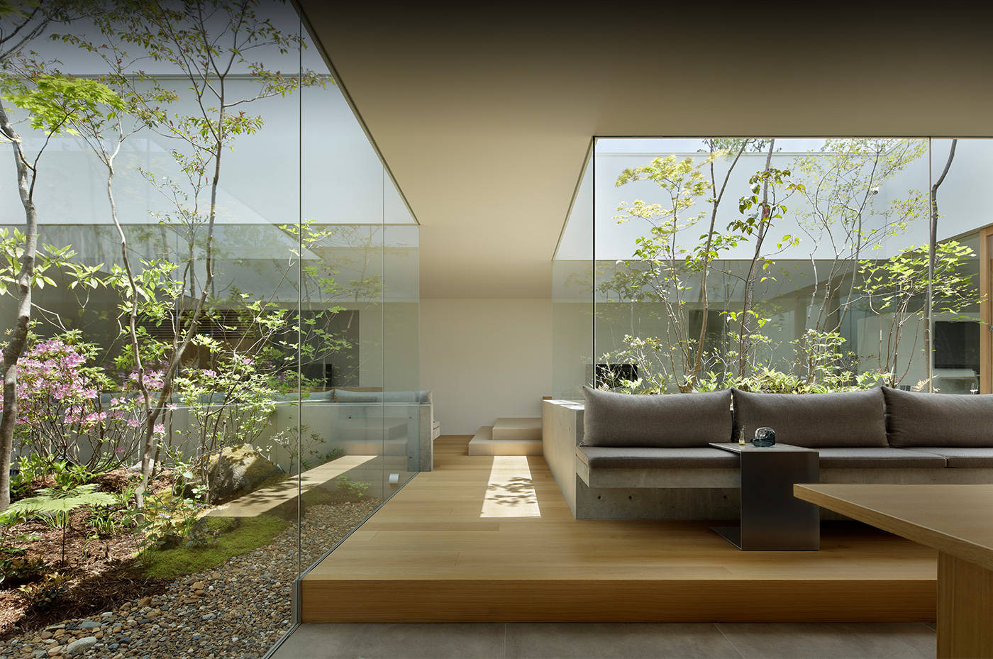 植物が好きなので、木漏れ日の中で生活できたら毎日気持ちいいだろうなあと考えたのです。約16m×10mの柱のない約100畳の長方形の空間をくり抜くように中庭を3つ、合わせて30畳分の広さのものを配置しています。大きな中庭を空間の真ん中にひとつ配置すると、その空間の中でひとつの庭と正対する形になって、目指しているような緑に包まれる感覚にはならないのではないかと考え、現在の形になりました。3つの中庭の大きさや配置、土の高さによって、つながっていながらも分けられたこの空間は、小さな森の中を移動しているような感覚があります。ガラスに複雑に映り込み増幅された緑が、よりその感覚を助長します。また、外周はぐるりと窓のない壁で囲まれており、中庭上部も外部からの視線が届かないようになっているので、よりいっそう緑との一体感が生まれ、とてもリラックスした時間が流れます。