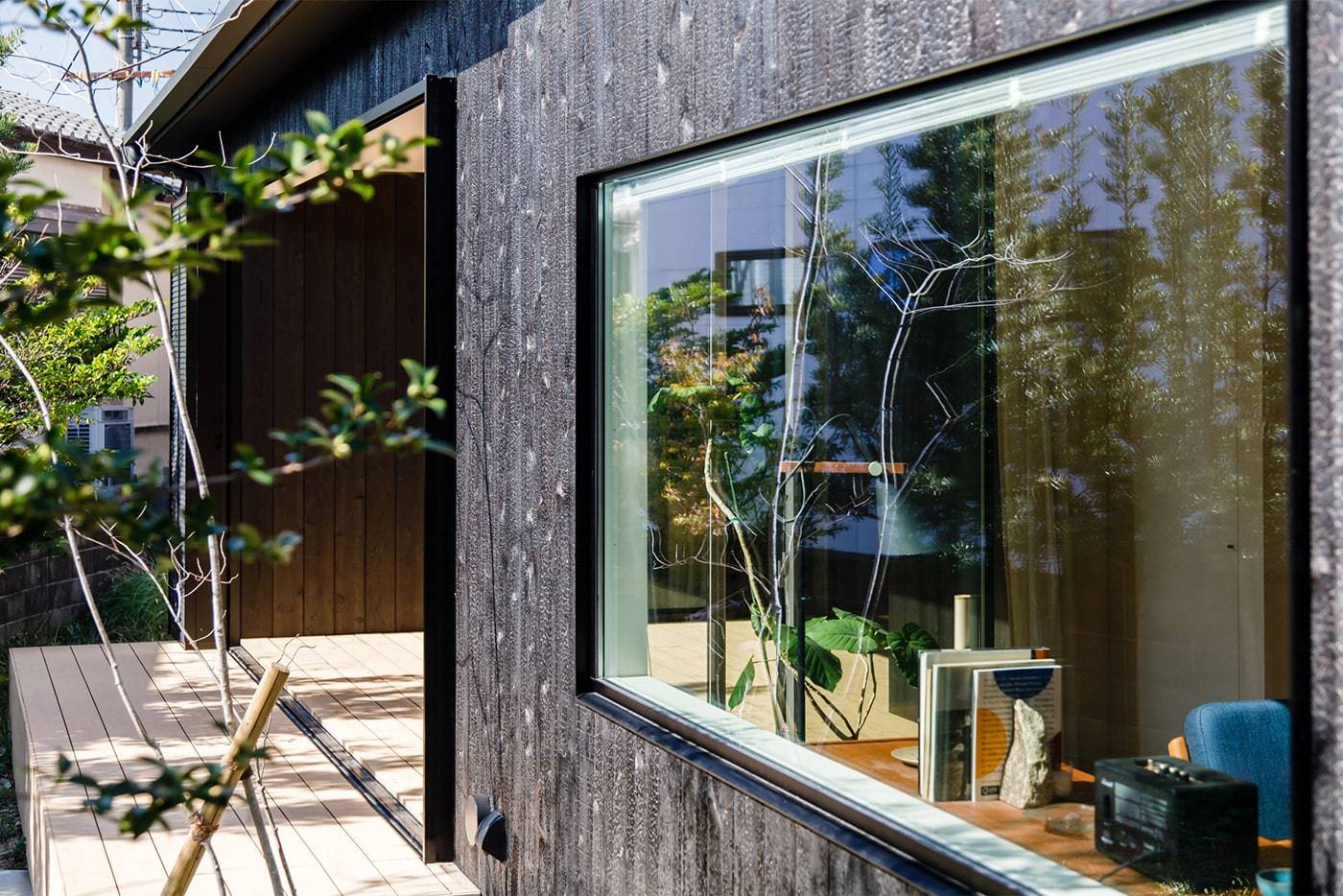 クライアントが「香花園の家」の外壁の焼杉を気に入られ、同素材を採用しています。 奥様が子供服づくりをされているのでそのためのアトリエと、家の中央に屋根付きの大きめのデッキ空間を配置しました。デッキではご主人がコーヒー豆の焙煎をしたり、プロジェクターで映像を見て過ごされているそうです。