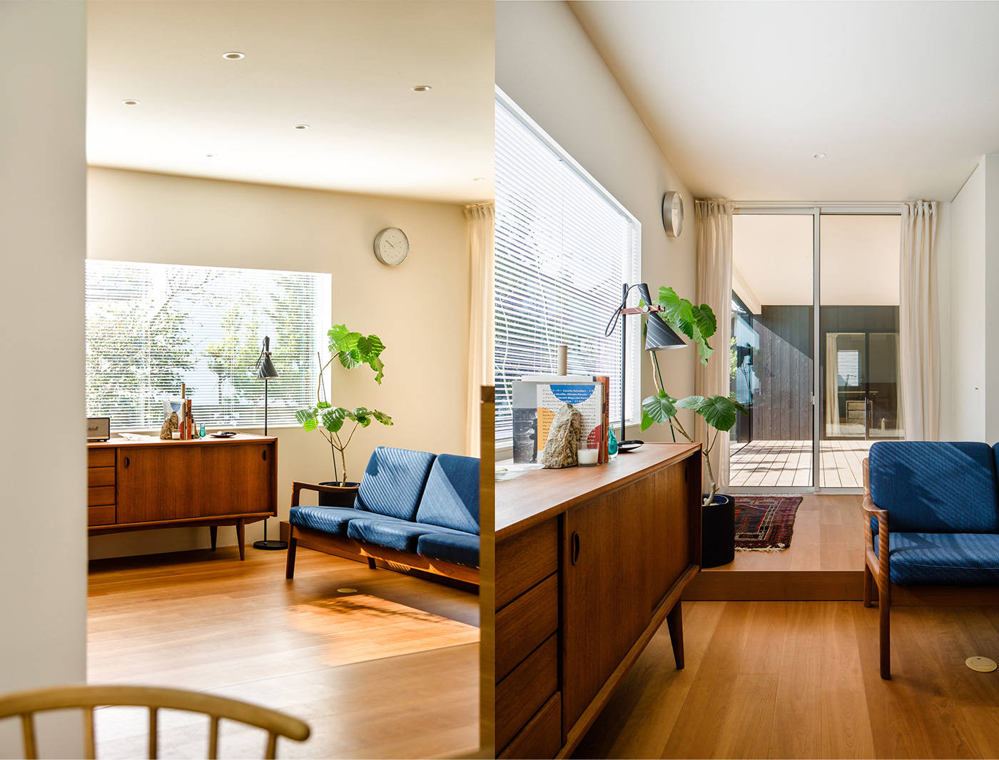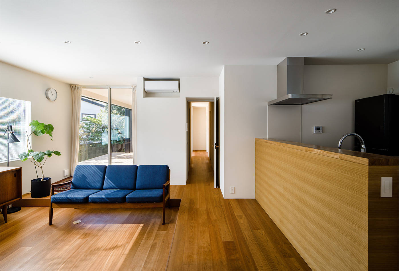 中央のデッキ空間を介して、玄関、アトリエ、リビング、庭それぞれが開放的に結ばれている一方、親密な光で心地のいい居場所が点在するよう心掛けました。