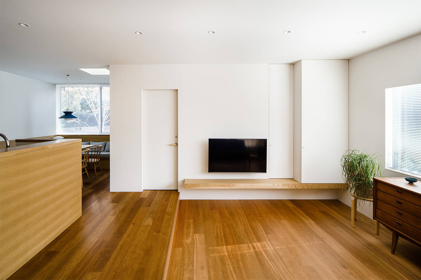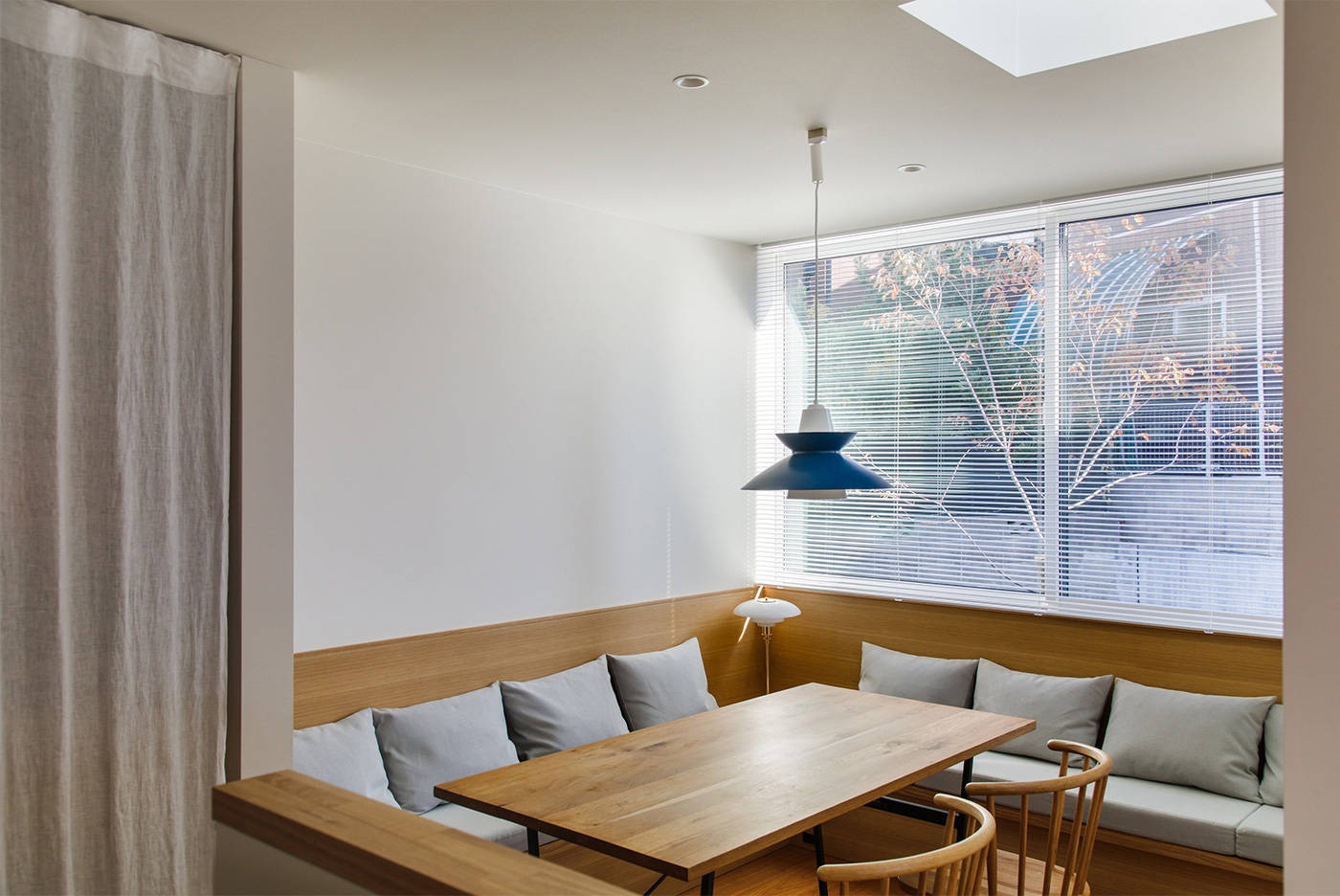 ダイニングは奥まったところにあり、造り付けのソファコーナーとなっています。食卓に面した東面の大きな窓からは樹木が見え、頭上からトップライトの光が落ちてきます。 四周を2階建ての住宅に取り囲まれていながらも、落ち着きのある平屋になったのではないかと思います。