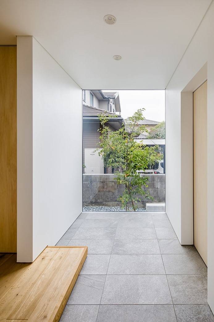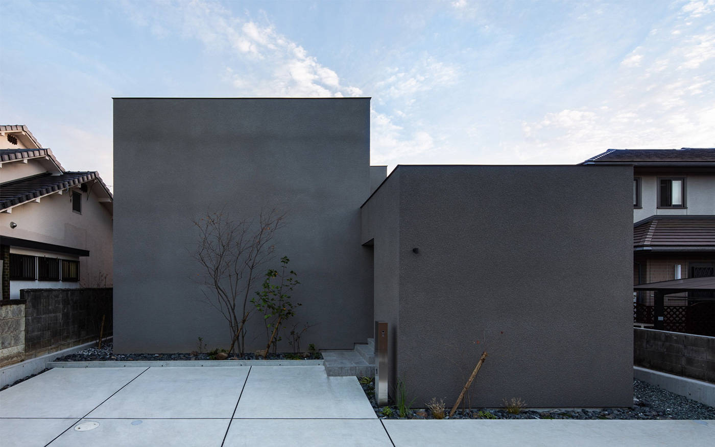 3つの箱で構成された家。それぞれがずれながら繋がっていて、空いたスペースが庭になっています。