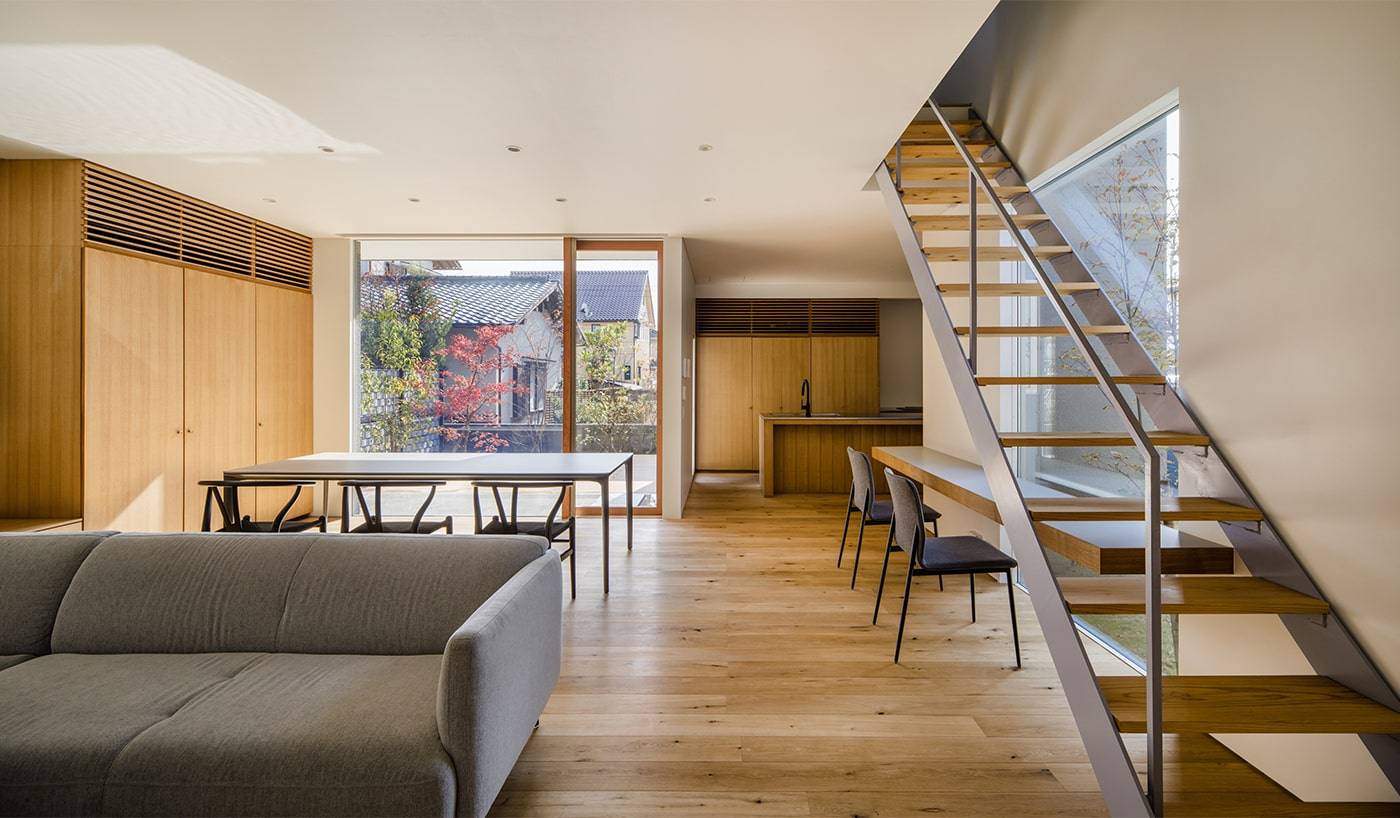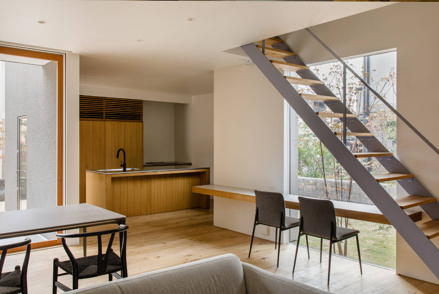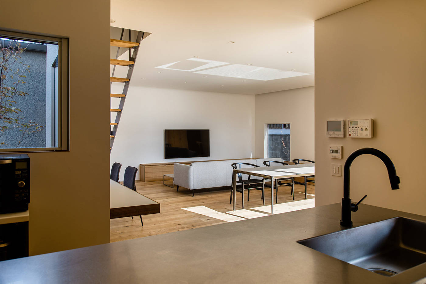 リビング・ダイニング・キッチンはあわせて34畳の広さで天井高さは2.6m、水盤とデッキに段差なくつながっていて広がりを感じることができます。階段下の窓辺の机は家事をしたり子供が勉強したりして過ごせるスペースとなっていて、その向こうの奥まったところに落ち着いたキッチンがあります。