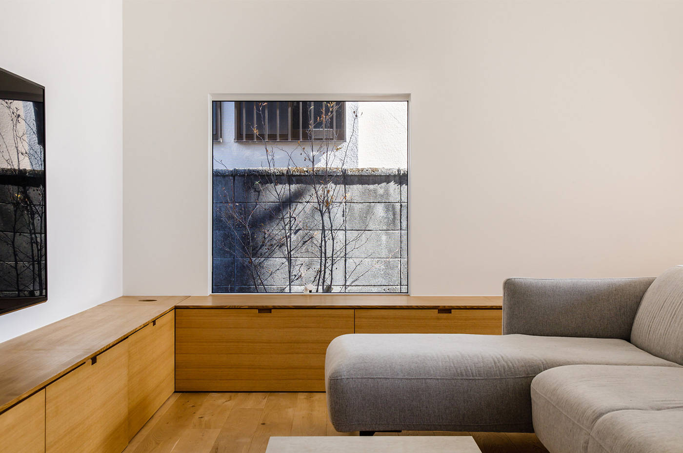 敷地の奥、南側のデッキ部分には水盤が設けられていて、日中は水盤に反射した太陽の光がリビングの天井にゆらゆらときらめき、風や雨の日には水紋が現れ美しい模様を見せてくれます。