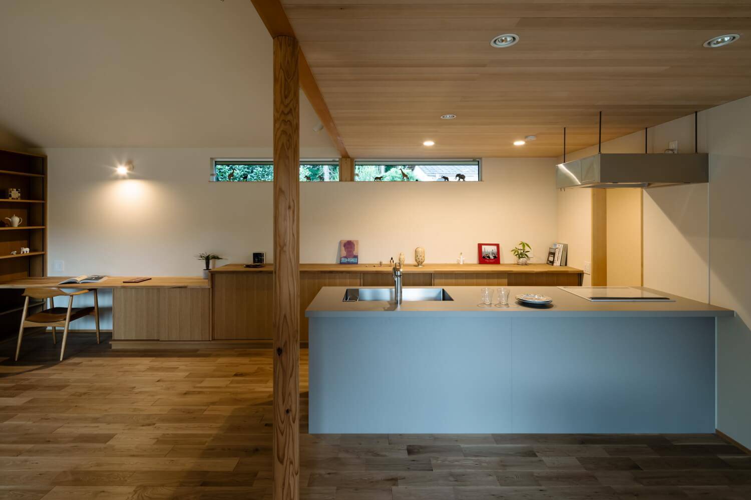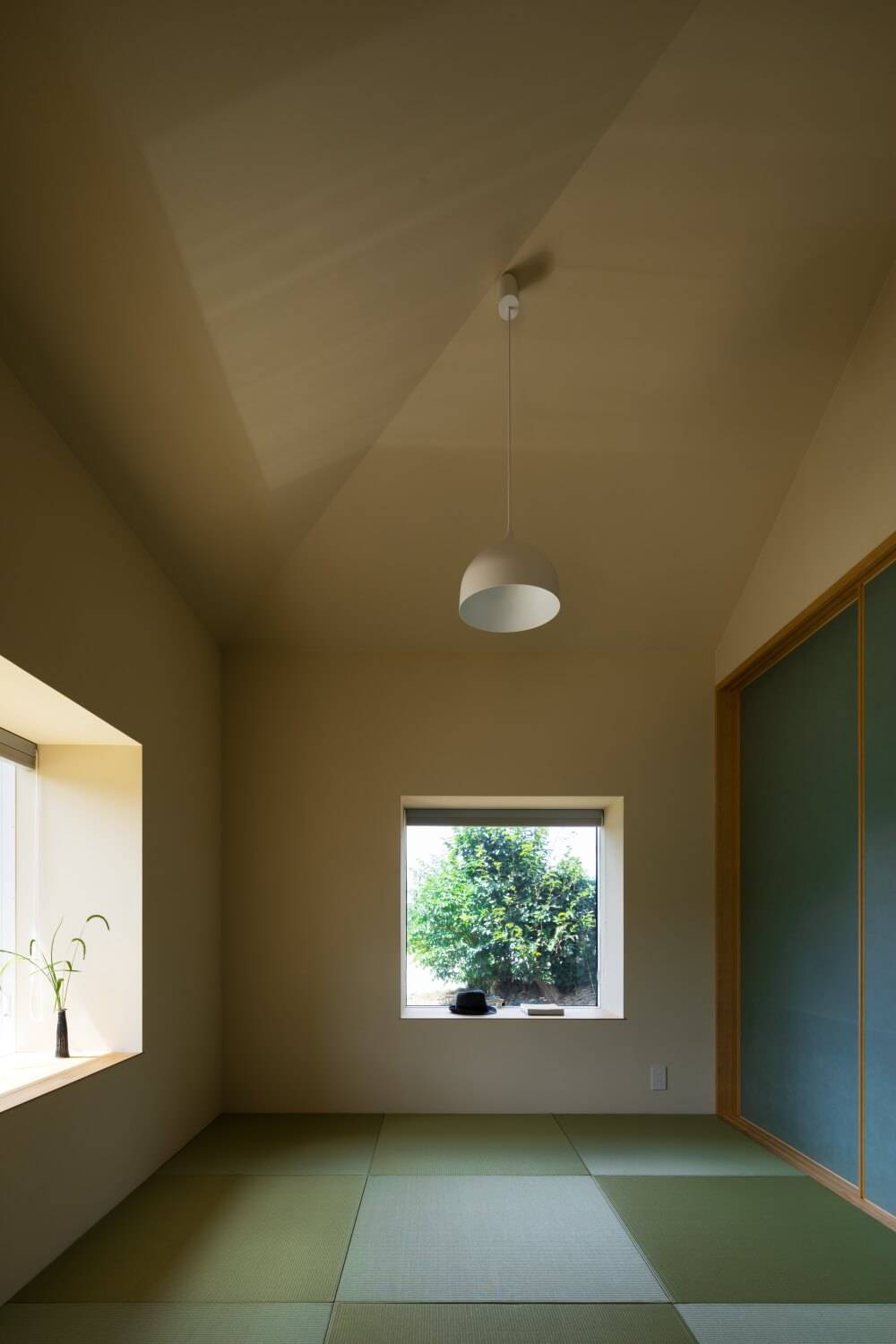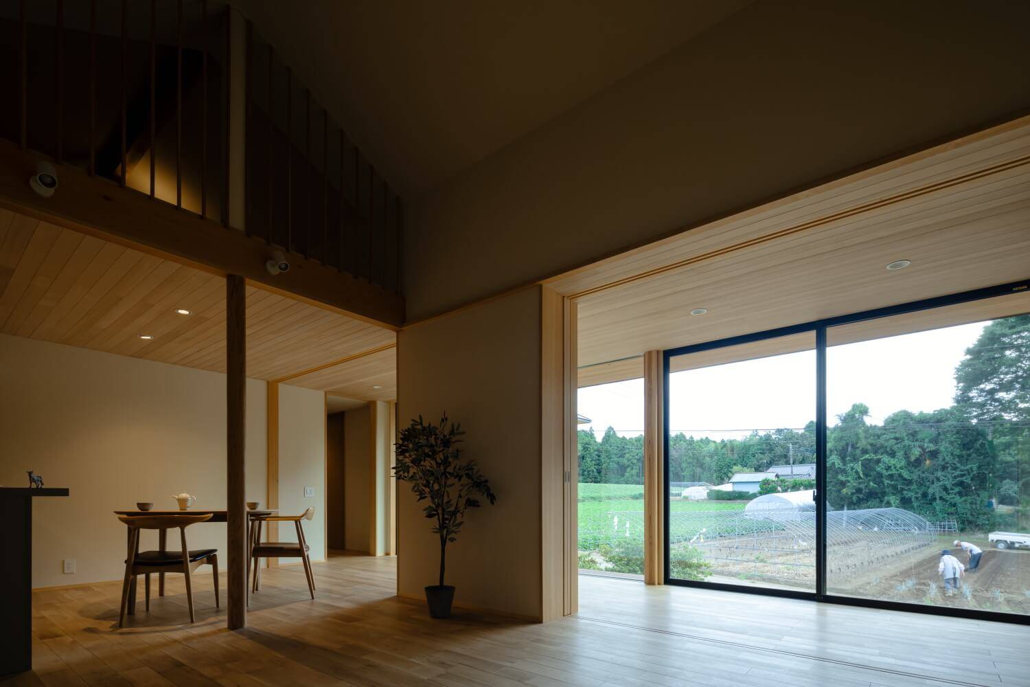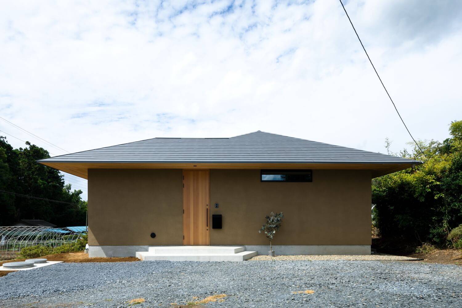 さつまいも畑に囲まれた農村集落にある平家の住まい。田の字型の間取りにうまやを取り込んだL字の屋根「曲家」が見られた地域である。建主との打ち合わせを重ねるなかで、うまやの位置に水回りを配したら曲家を現代的に読み替えたプランが生まれた。土壁の外壁も民家の様相がうかがえるが、畑の多い地域では土埃が多く、汚れが目立たないメリットもある。