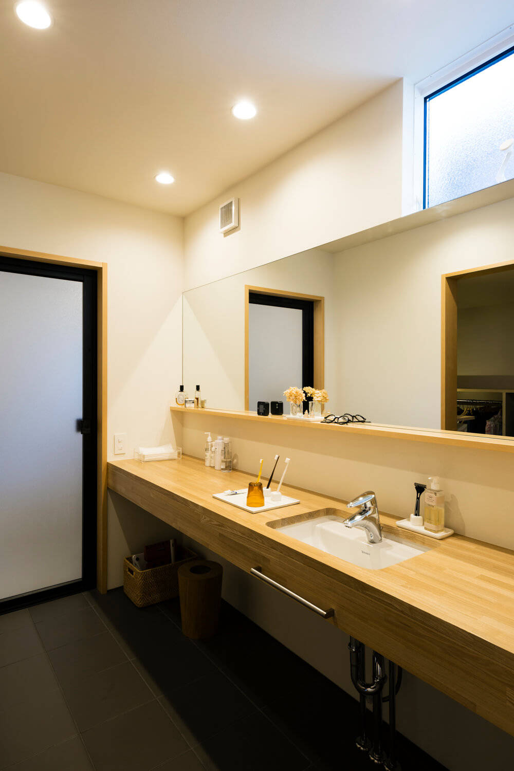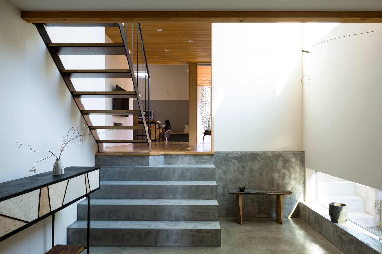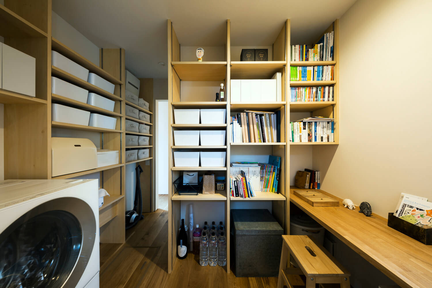 回遊性を持たせ、建具がなくても段差や壁の位置によりゆるやかに空間が分かれている。シューズクローセットやウォークインクローゼット・パントリーなど裏動線をきちんと確保することにより、パブリックな場所とのゾーニングを明確に行った。