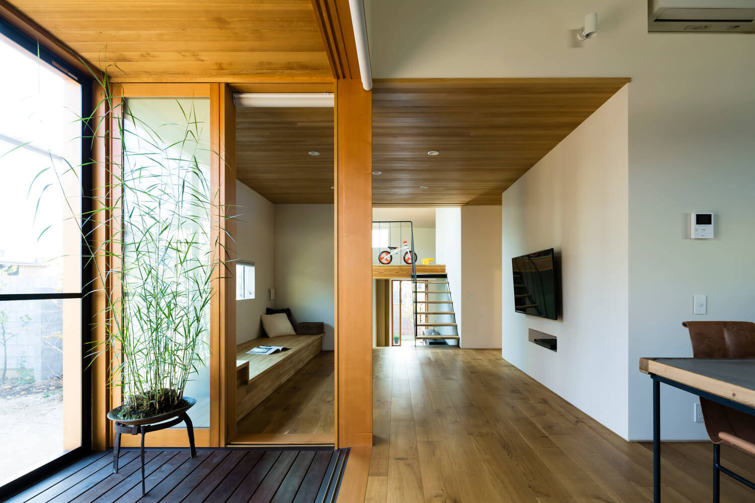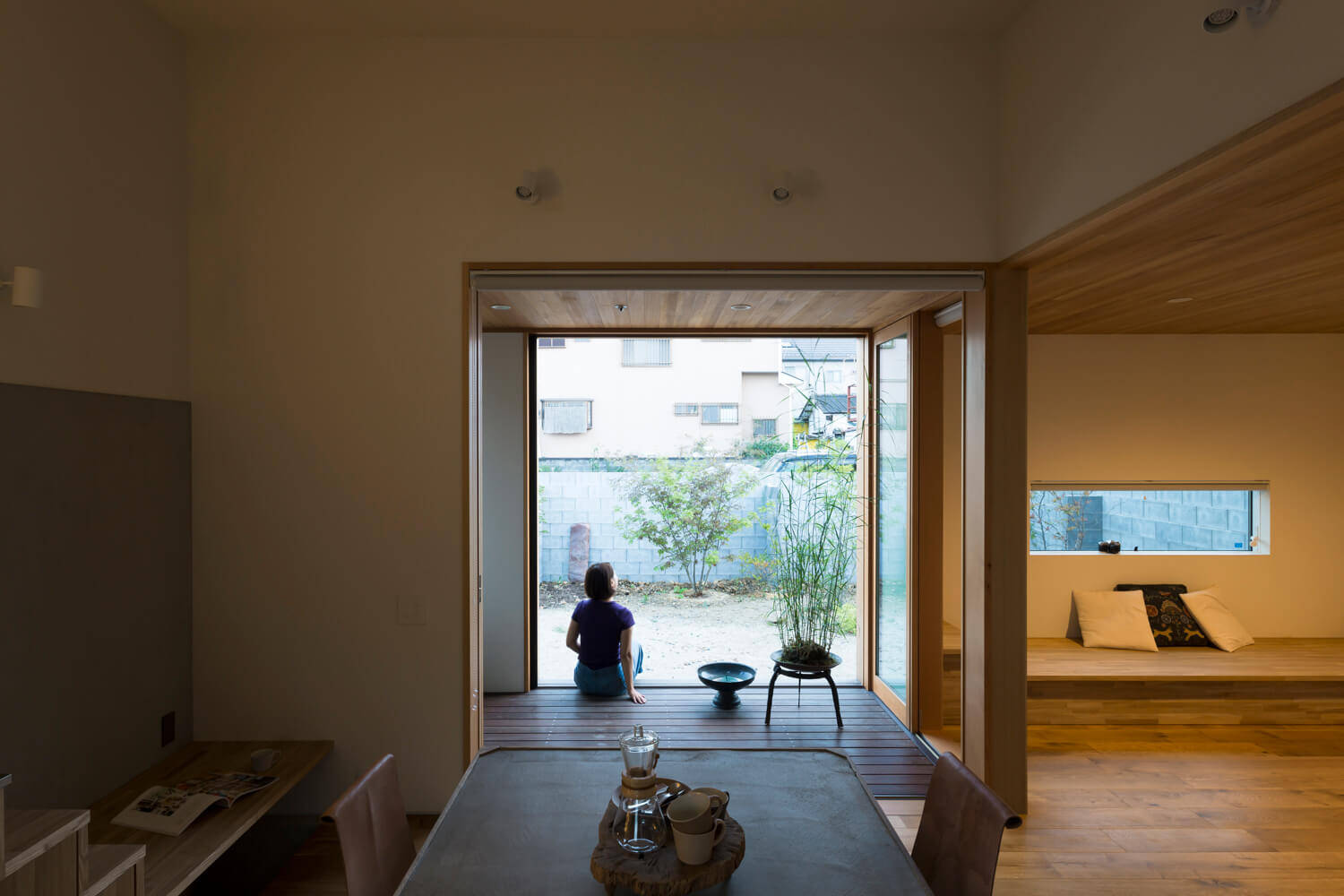 リビング・ダイニングと繋がるデッキスペースには外壁側に網戸を設けた。天気の良い日は室内の一部となったり、囲われた外部空間になったり、多用途な使い方を楽しめる場所である。