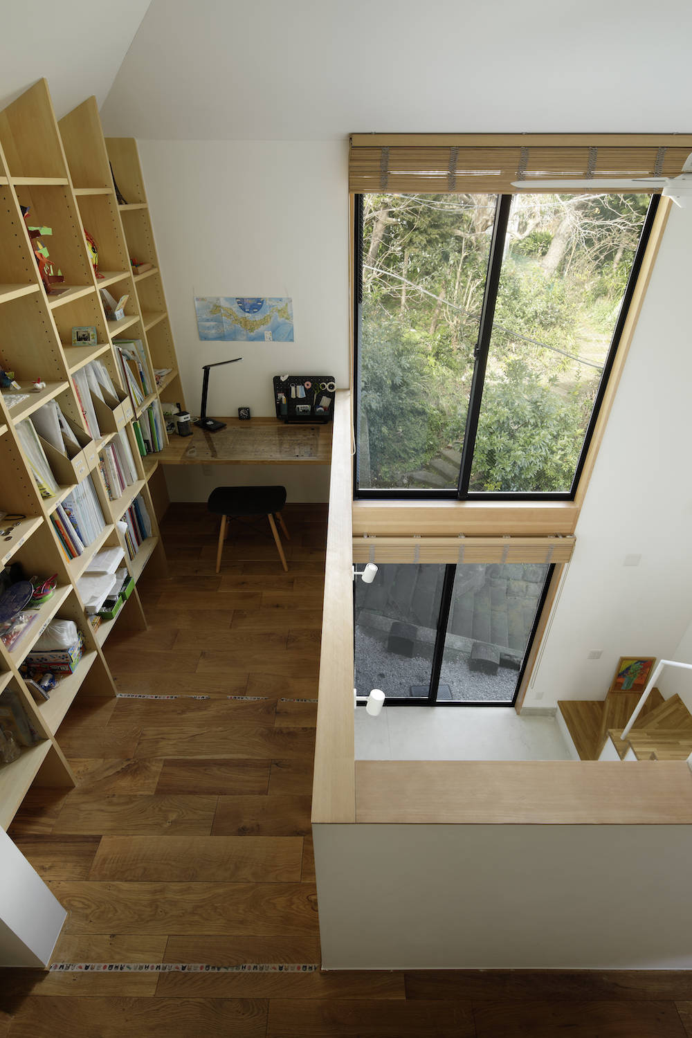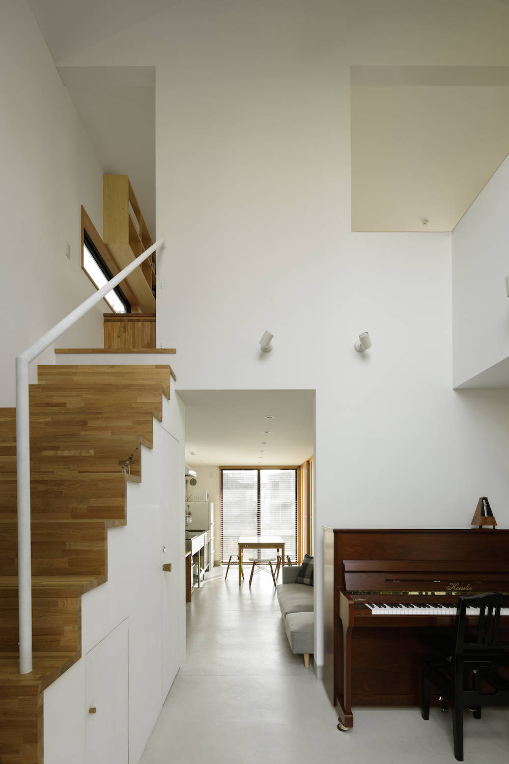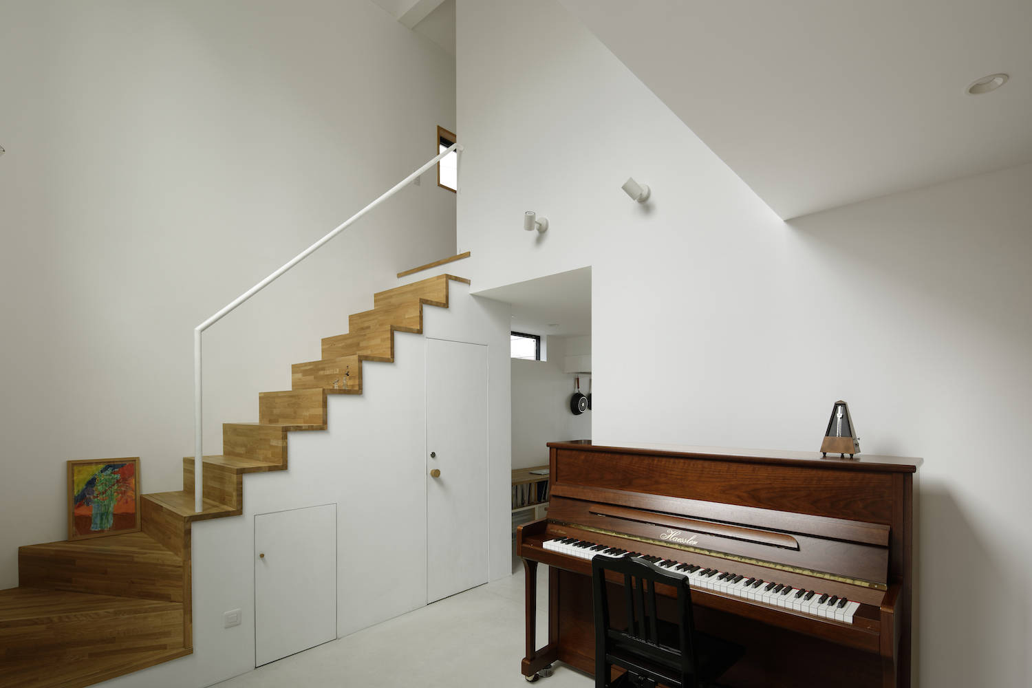 切り通しの上に建つ小さな住まい。隣地には豊かな緑があり、窓越しに借景を楽しむことができる。延べ面積わずか68m2とコンパクトな空間ではあるが、ピアノなどの楽器を演奏するスペース(サロン)の吹抜を中心に、それぞれの機能が緩やかに繋がり、狭さを感じさせない。廊下や階段、吹き抜けの一部など、小さな居場所がこの家の魅力の一つとなっている。