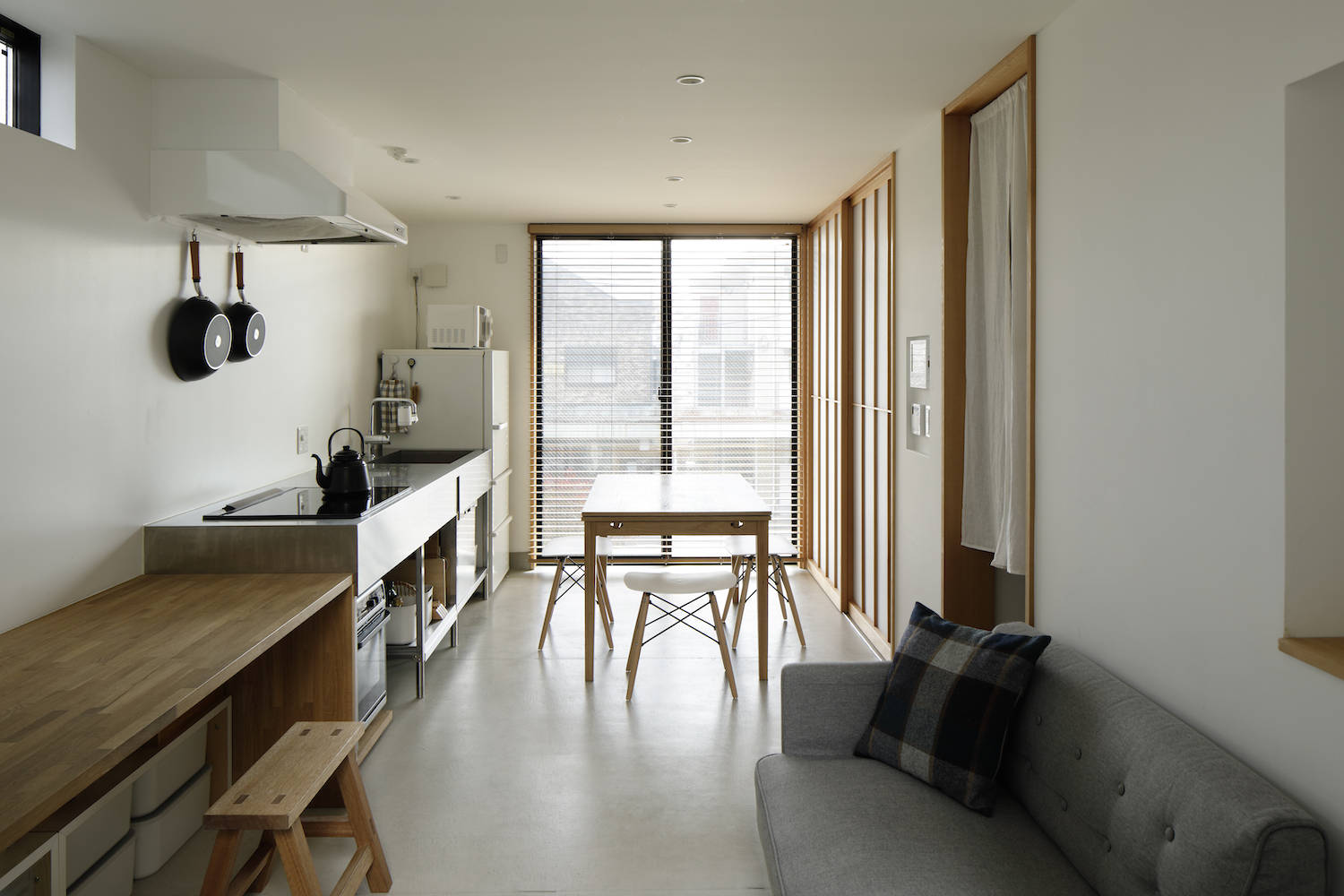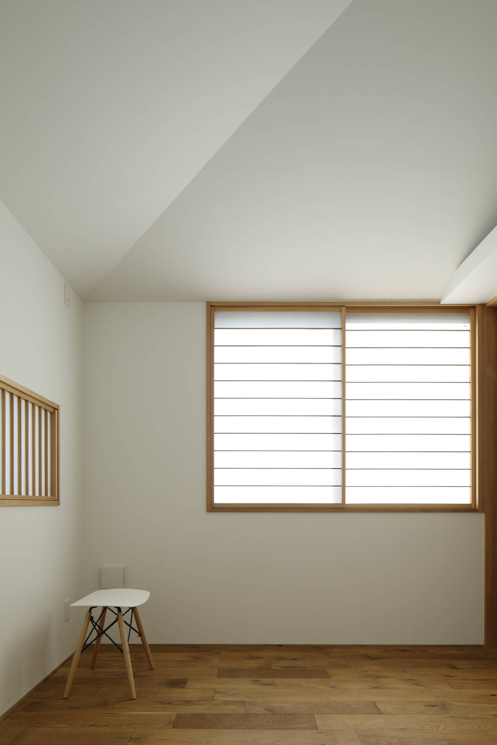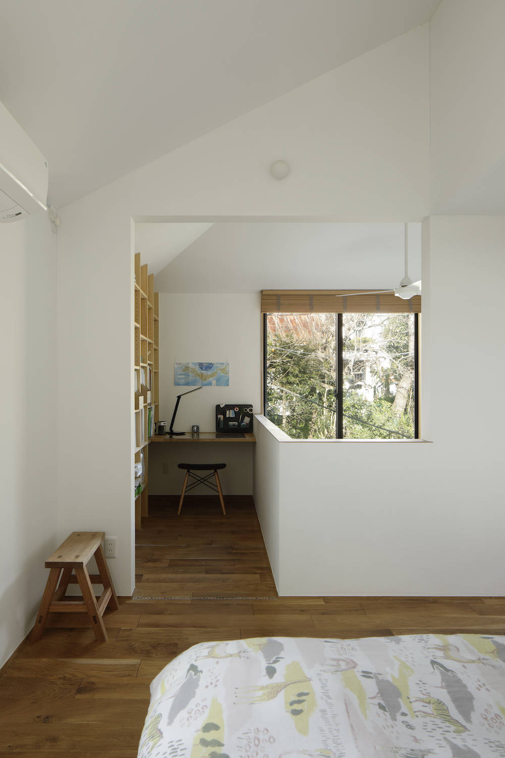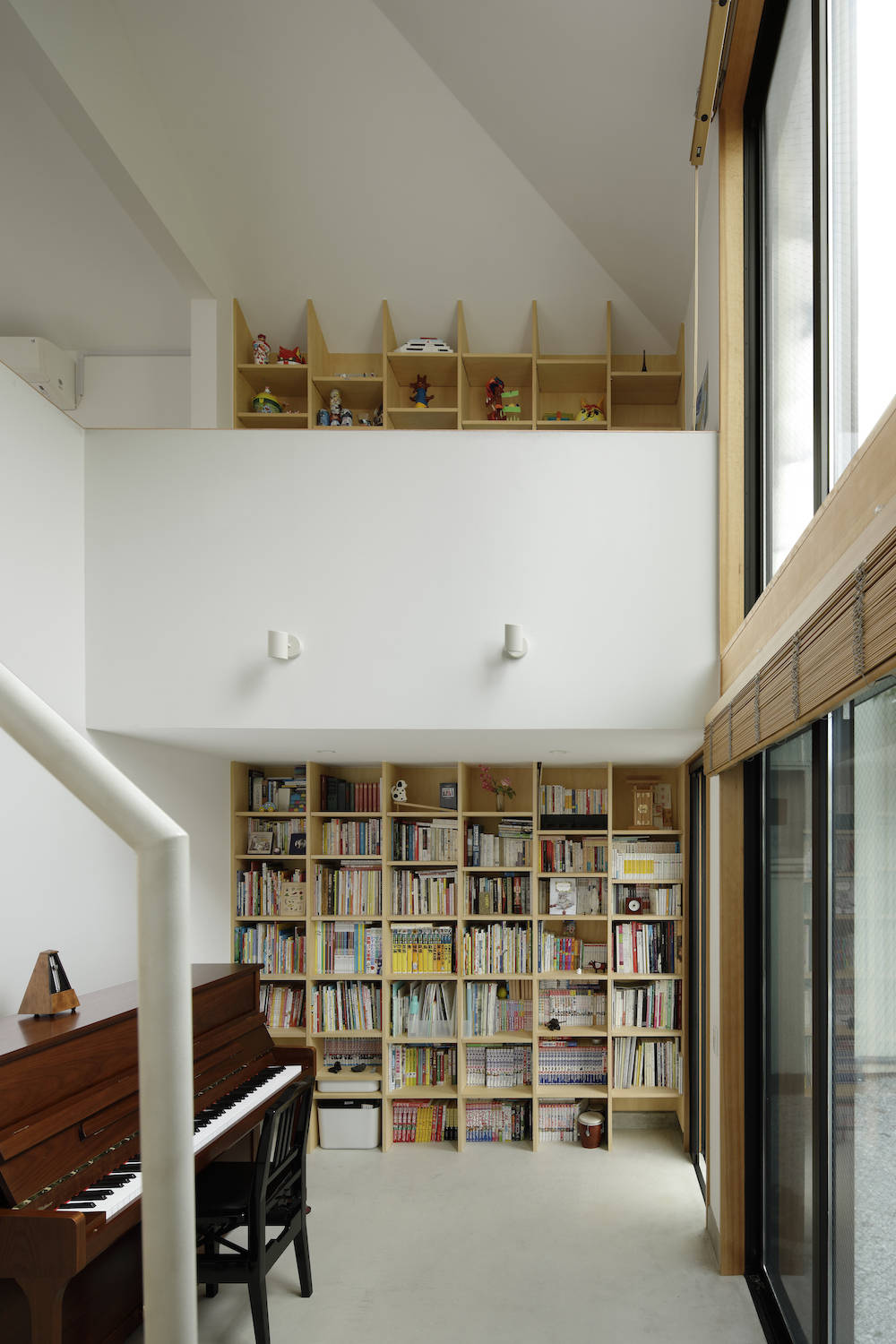 切り通しの上に建つ小さな住まい。隣地には豊かな緑があり、窓越しに借景を楽しむことができる。延べ面積わずか68m2とコンパクトな空間ではあるが、ピアノなどの楽器を演奏するスペース(サロン)の吹抜を中心に、それぞれの機能が緩やかに繋がり、狭さを感じさせない。廊下や階段、吹き抜けの一部など、小さな居場所がこの家の魅力の一つとなっている。