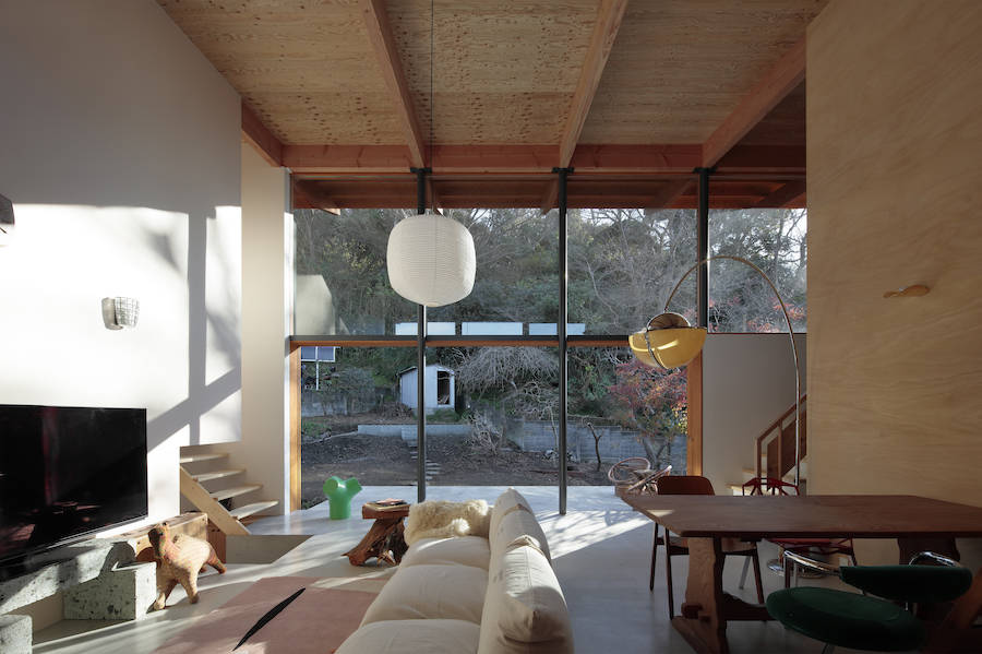 個室や水回りは必要最小限の大きさとし、大きな気積のリビング・ダイニングの両サイドに配置し、床を1m上げたリビング・ダイニングとはスキップフロアの関係となっている。