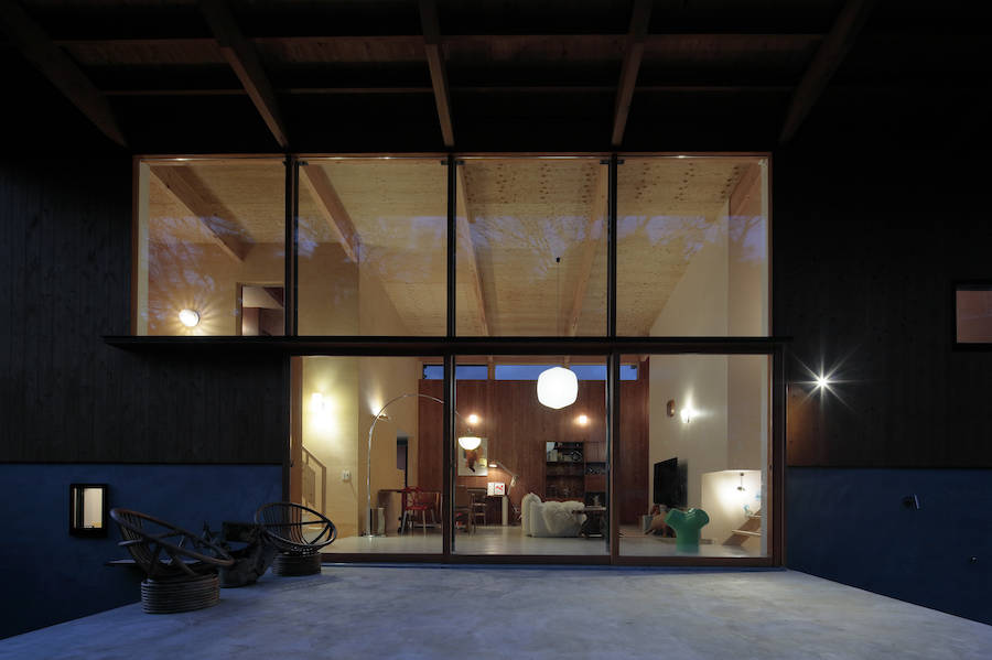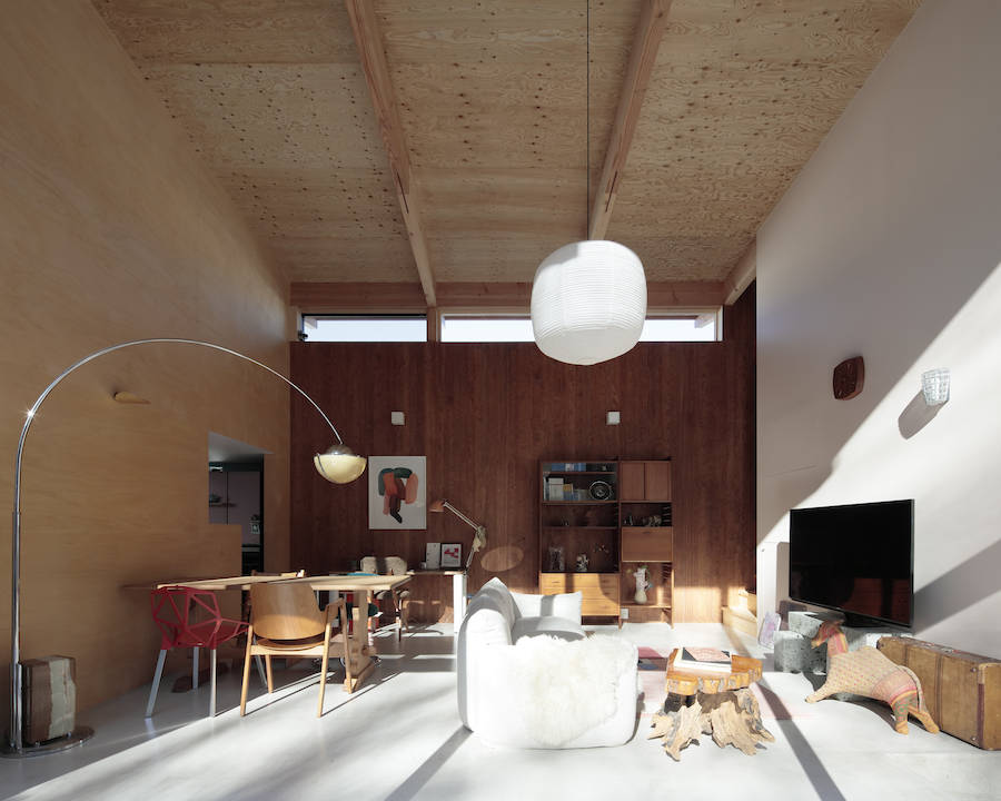 キッチンが独立した間取りとすることで、自由に家具の配置を楽しむことのできる舞台(リビング・ダイニング)に、クライアントの所有している沢山の家具や置物、以前敷地に建っていた家から再利用した建具や照明器具が点在する。