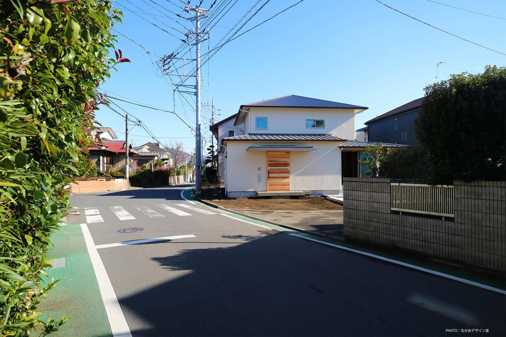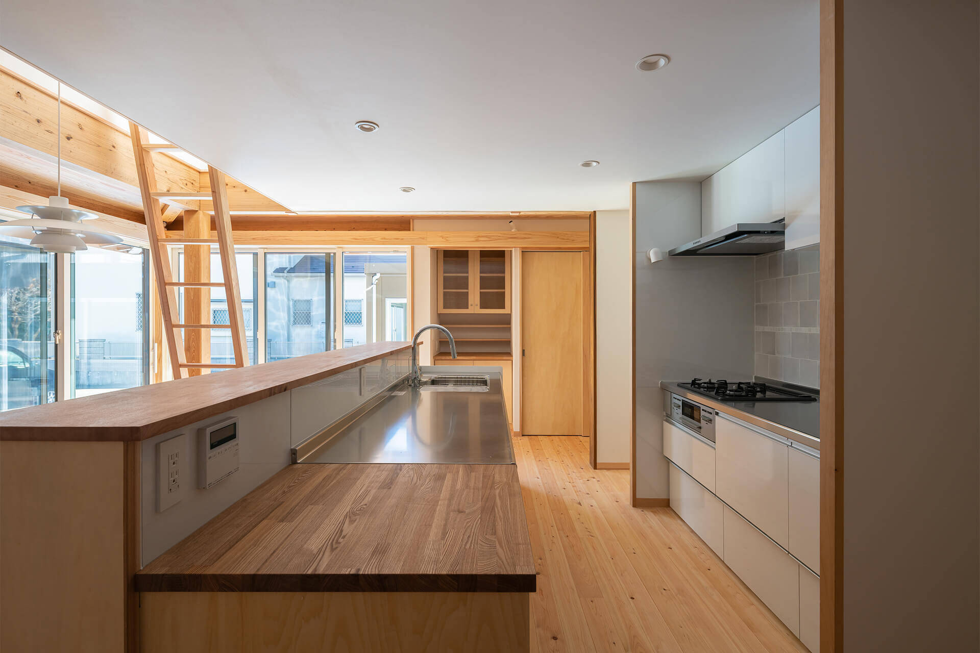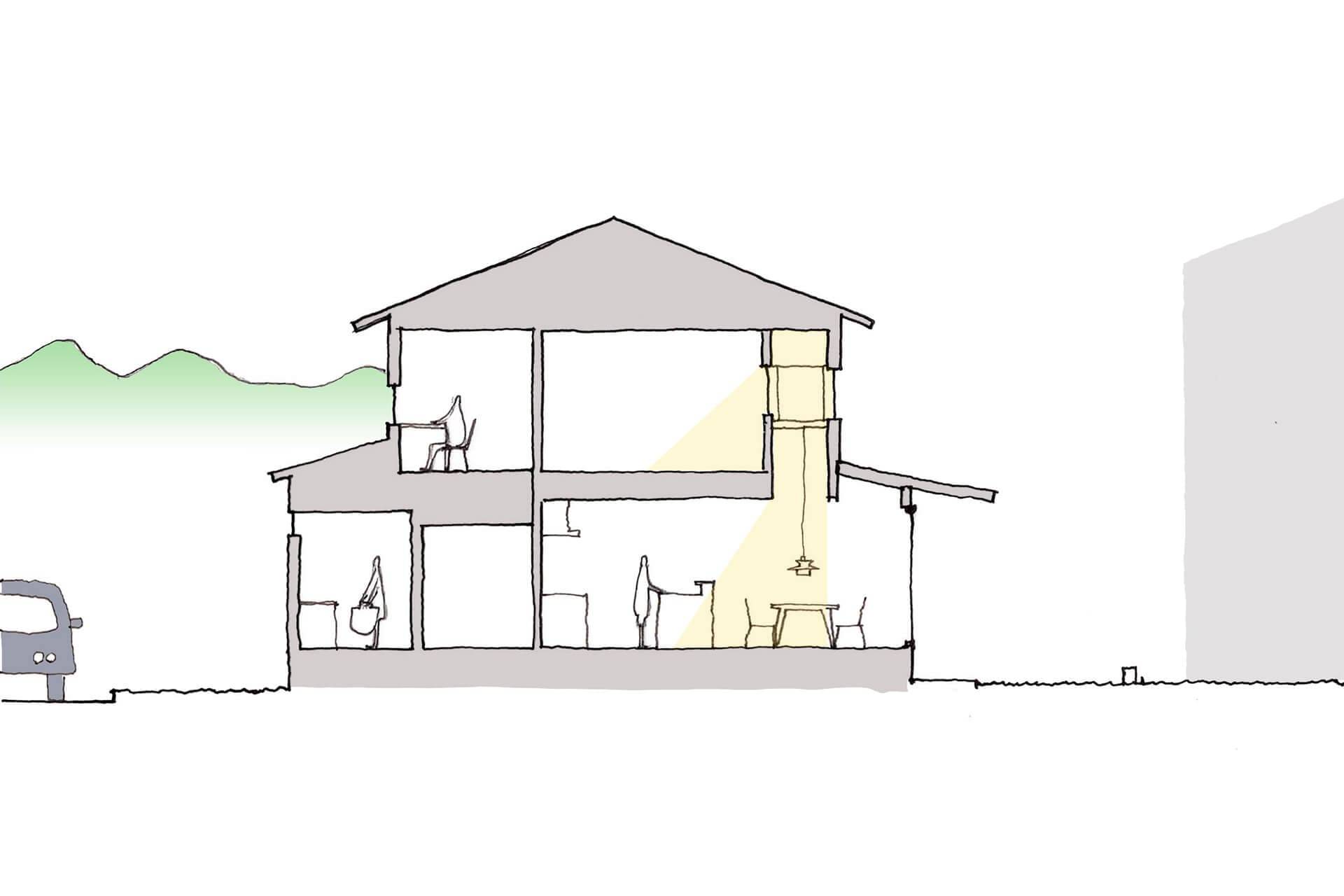 丹沢山地のふもとに建つ2世帯住宅。くらしの動線に回遊性を持たせ、さらに光や風を導く空間構成としています。隣地建物と交通量の多い道路に挟まれた環境でありながら、穏やかに山々を臨むことができる住まいです。
