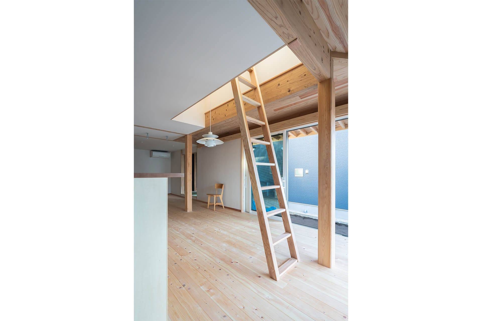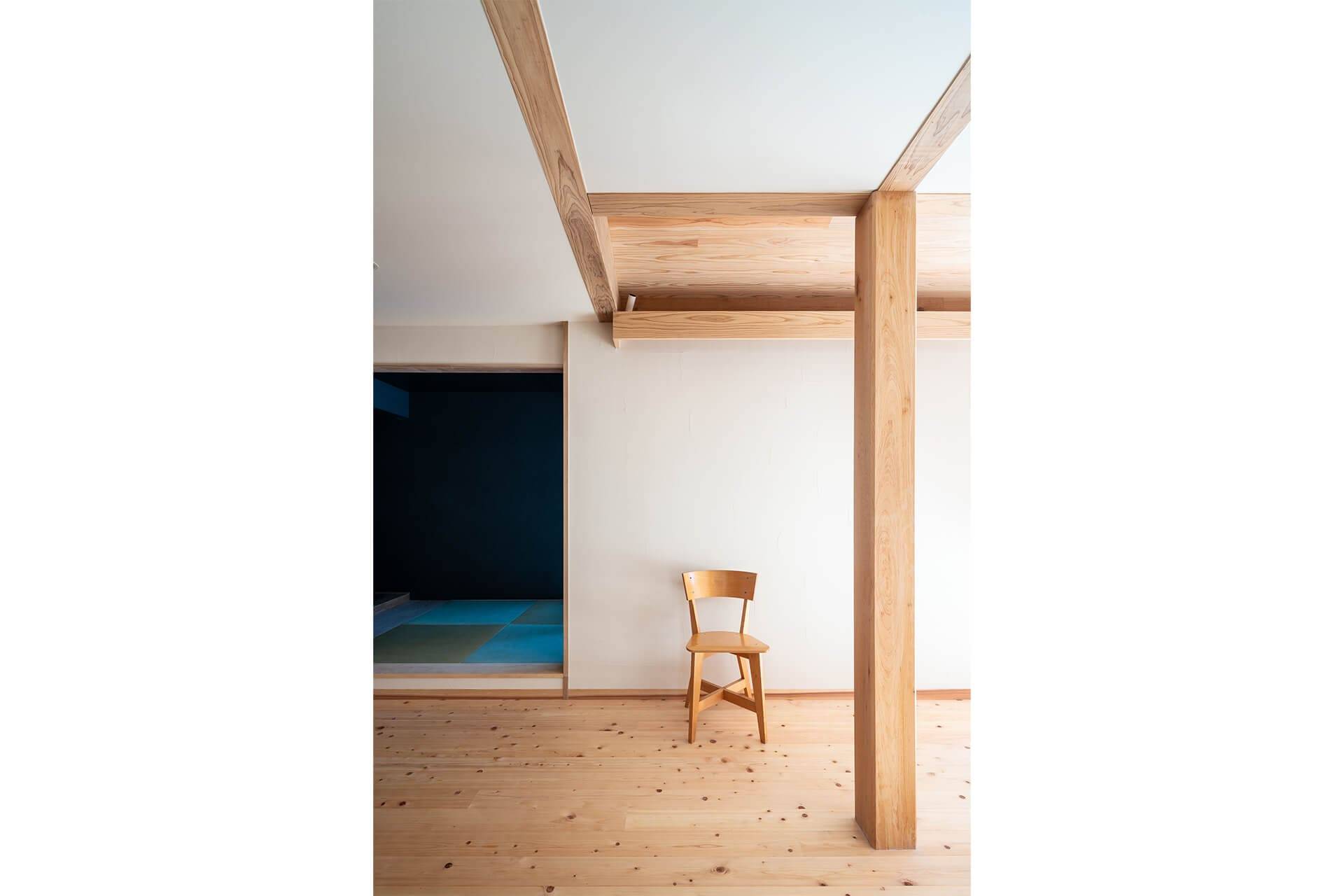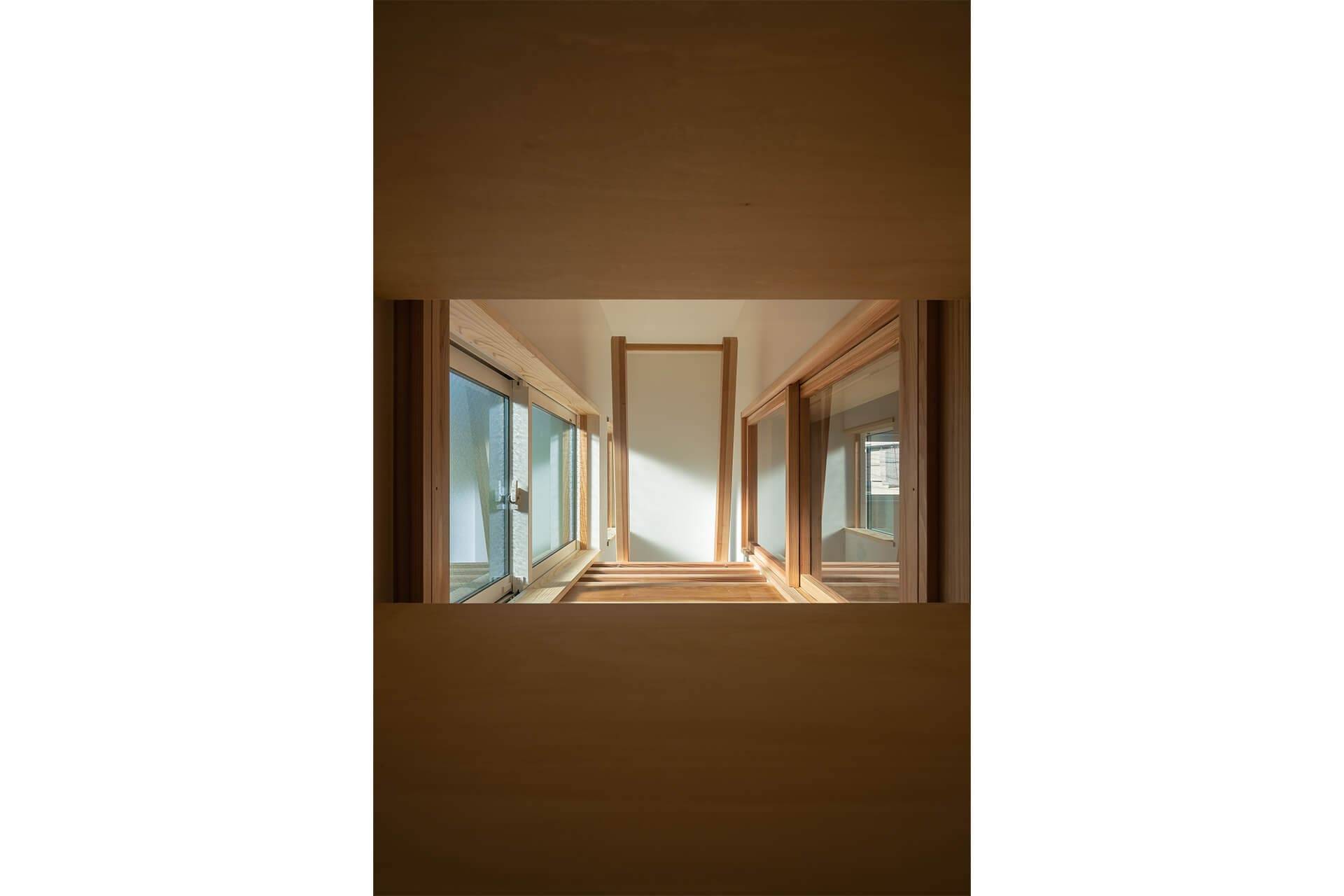 丹沢山地のふもとに建つ2世帯住宅。くらしの動線に回遊性を持たせ、さらに光や風を導く空間構成としています。隣地建物と交通量の多い道路に挟まれた環境でありながら、穏やかに山々を臨むことができる住まいです。