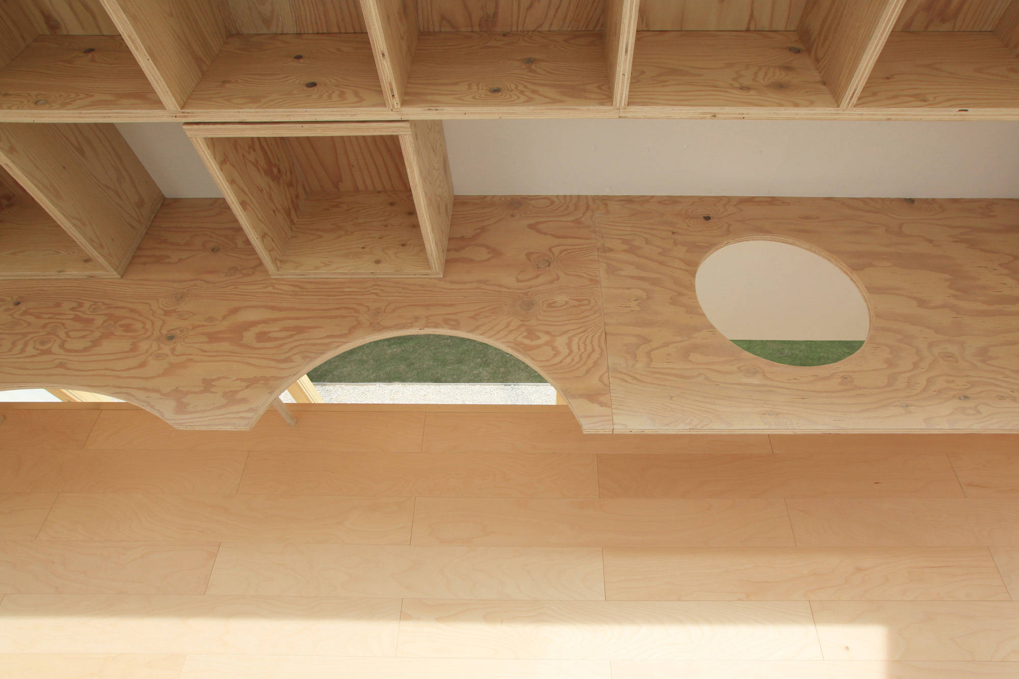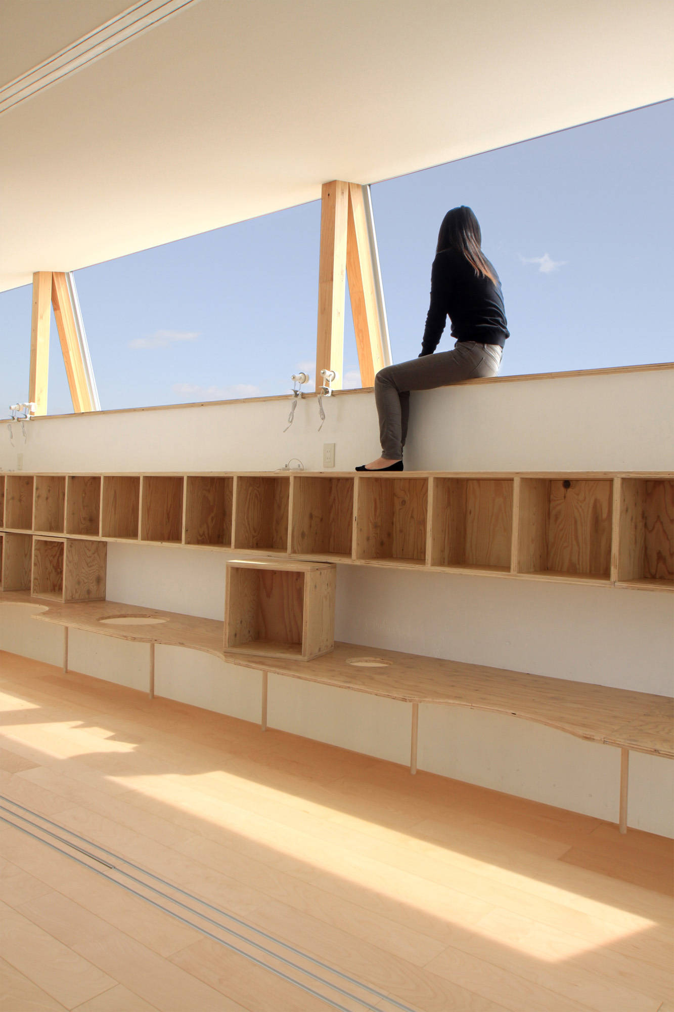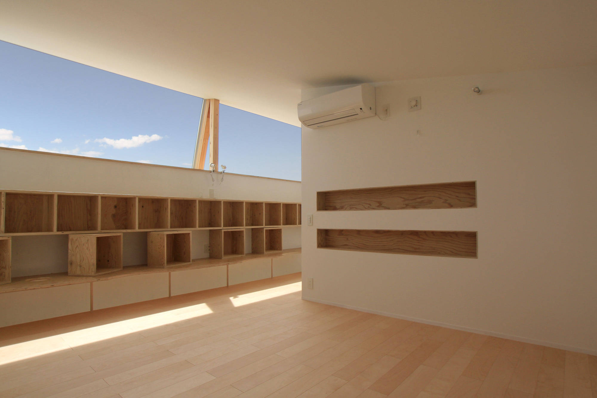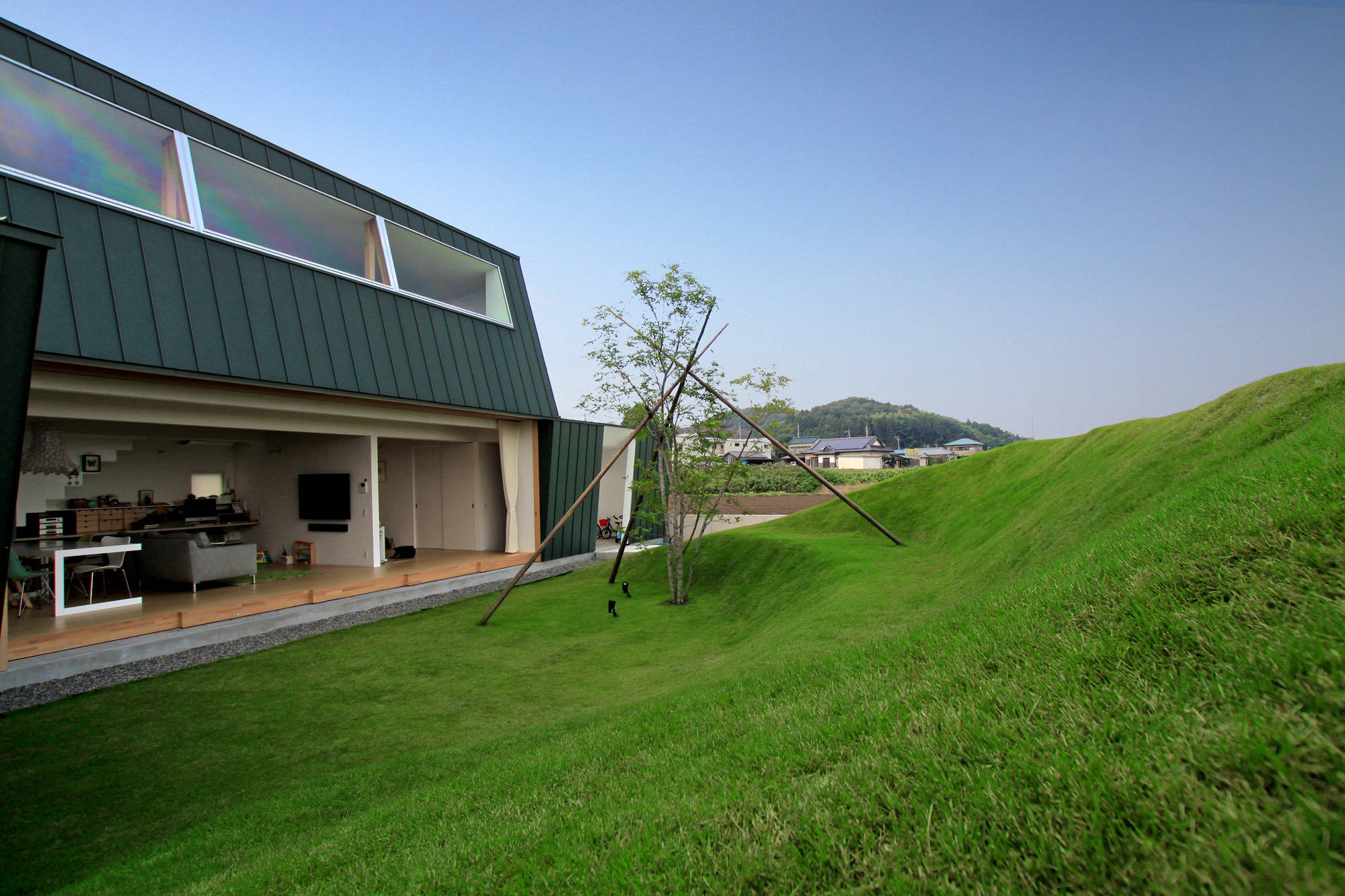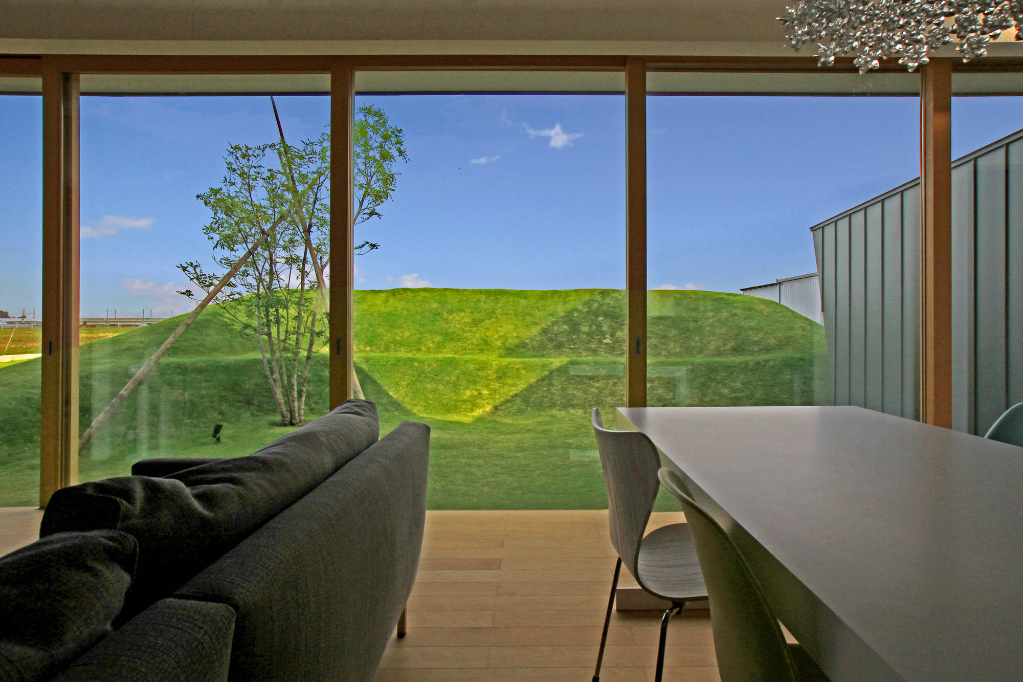 土を盛って作った土手によって外からの視線を柔らかく防ぎながら、リビングからの眺めを芝の庭から空へ自然に連続させます。