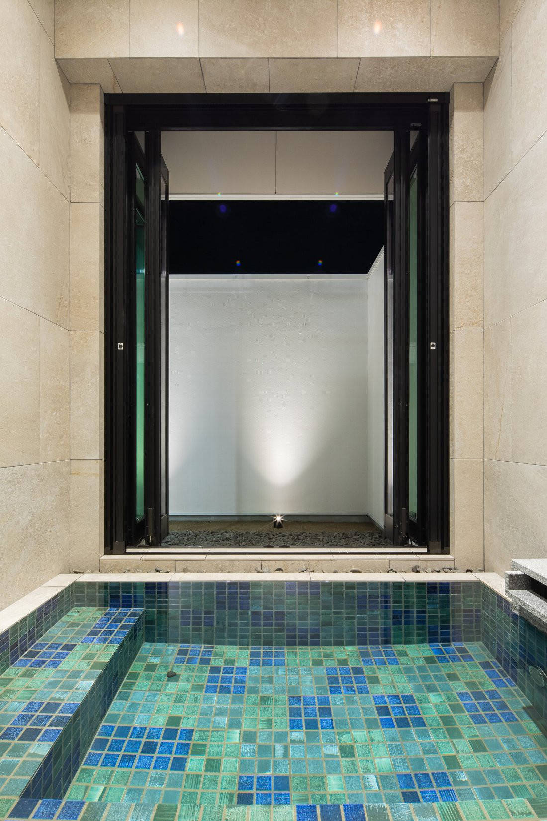 浴室は天然温泉を楽しめるよう、坪庭に大きく開いて露天風呂気分を味わえます。ご家族は温泉だけでなく、広い庭では家庭菜園をしたり、 川辺の遊歩道を散策したりと田舎暮らしを満喫しています。