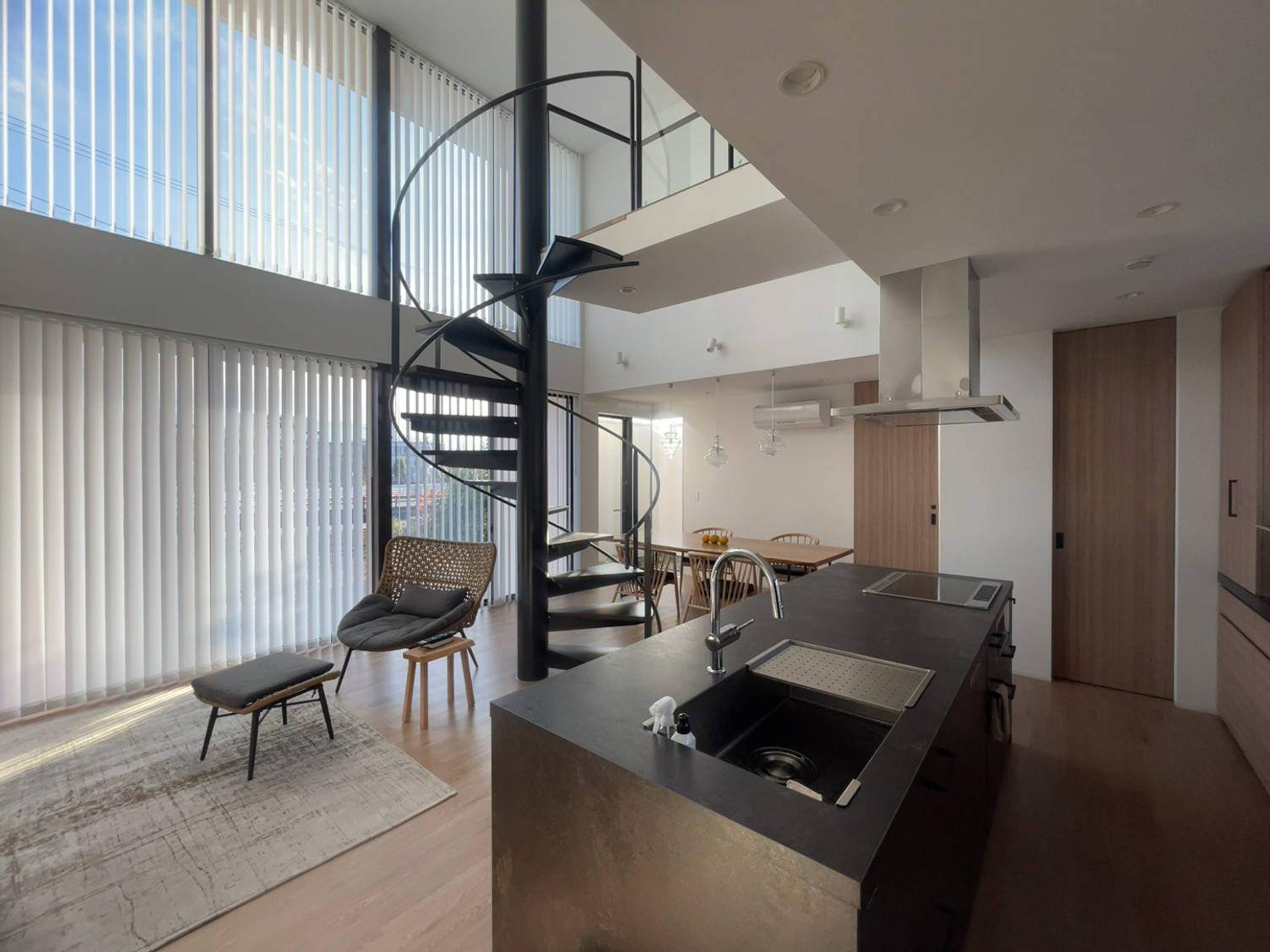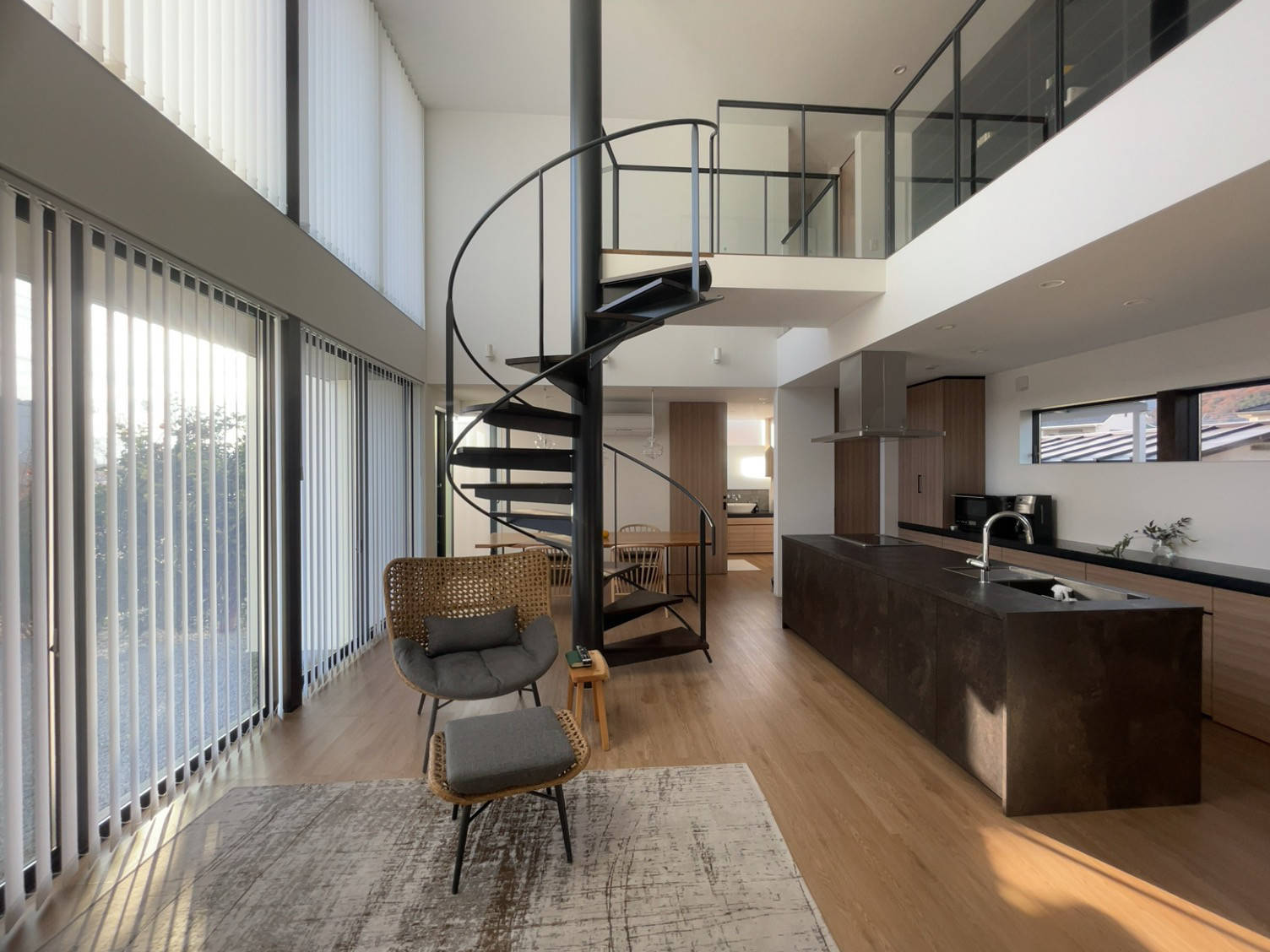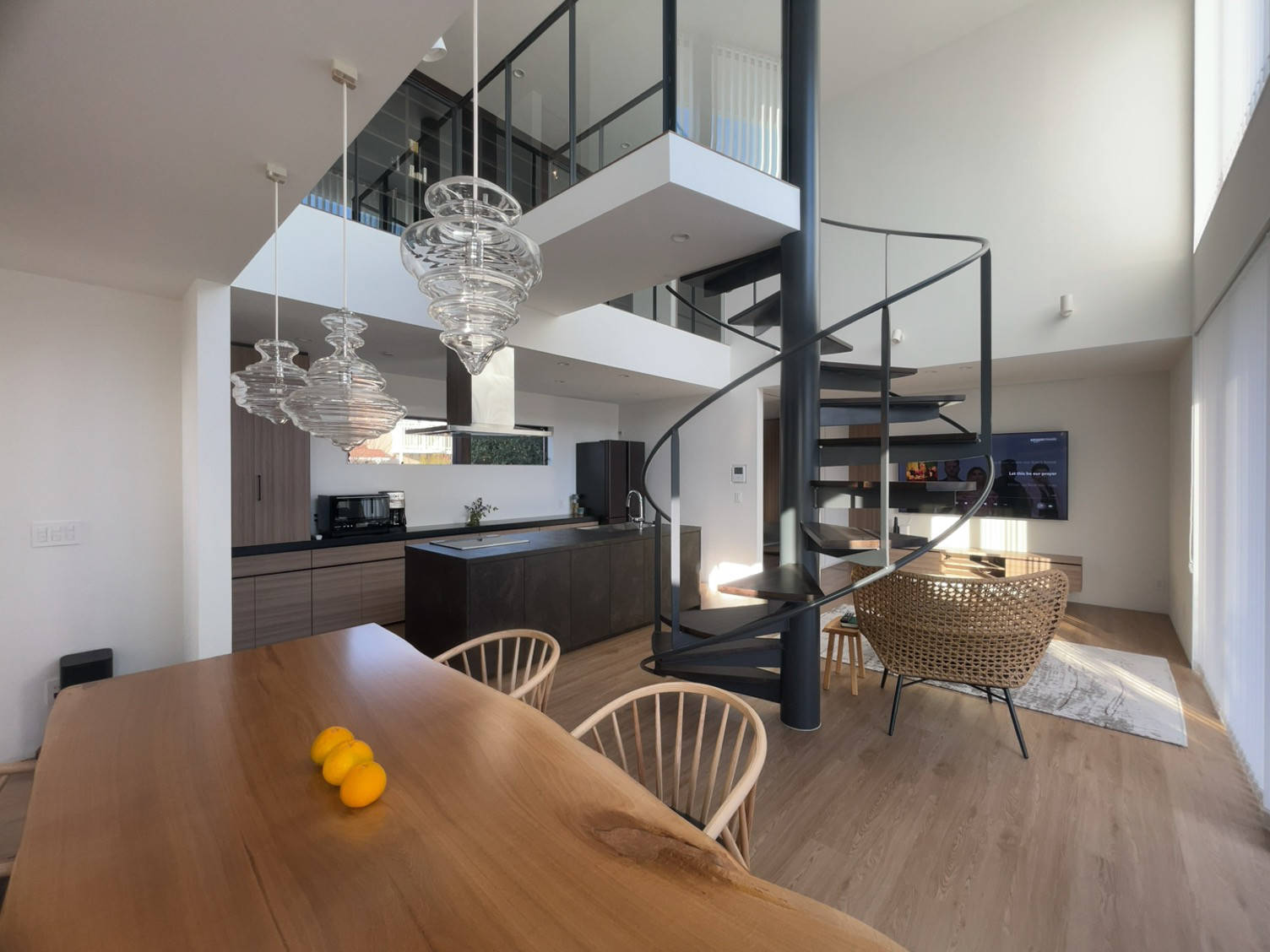 計画中にリモートワークが進んだため、週末に訪れる別荘としてではなく、頻繁に訪れるセカンドハウスとして見直し、大きな吹抜けや螺旋階段のある空間を作りました。